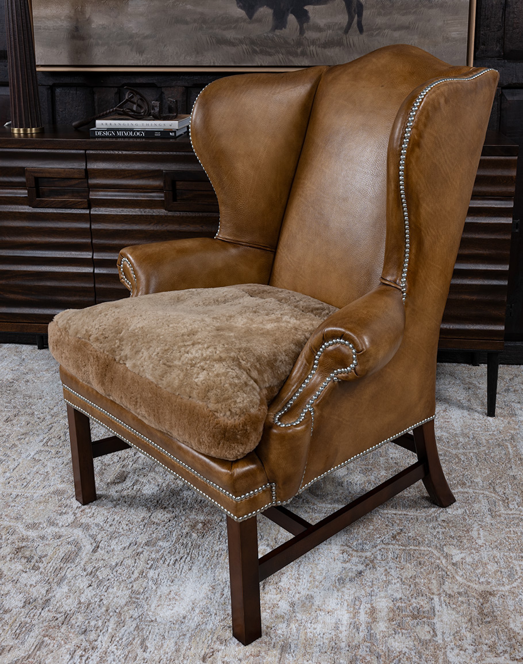 The Gentry Saddle Wingback Chair is a statement piece of heirloom quality, blending refined Western character with timeless comfort. Handcrafted in the USA to the highest standards of quality and craftsmanship, this wingback chair showcases a masterful combination of full-grain saddle leather and a sumptuous shearling seat cushion.