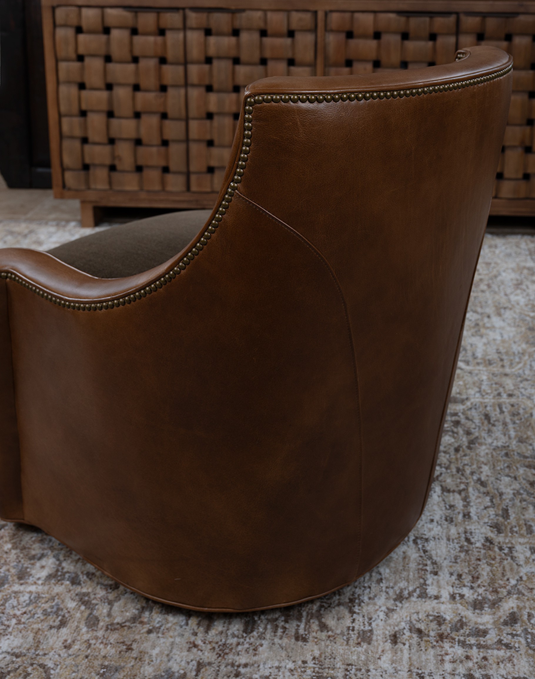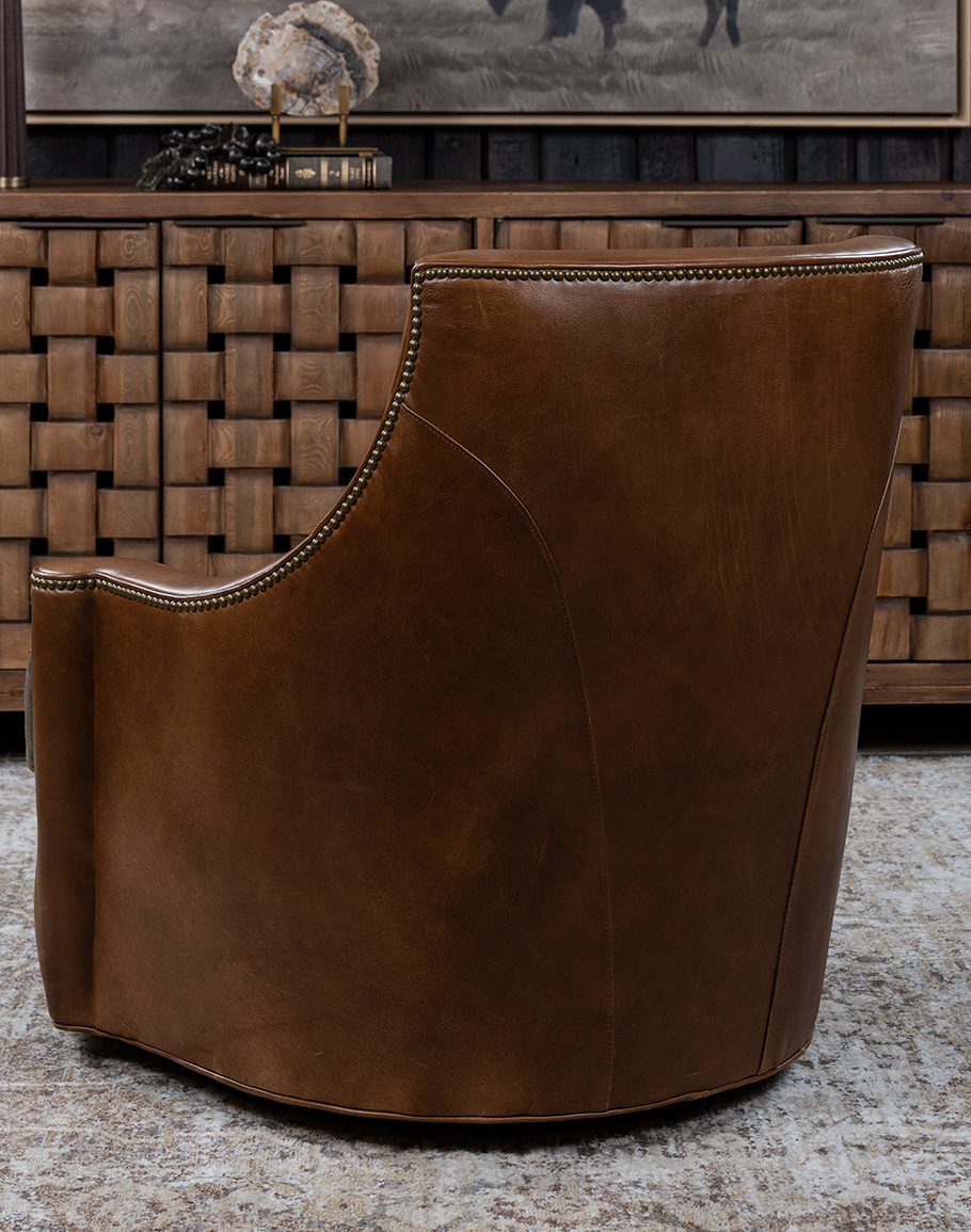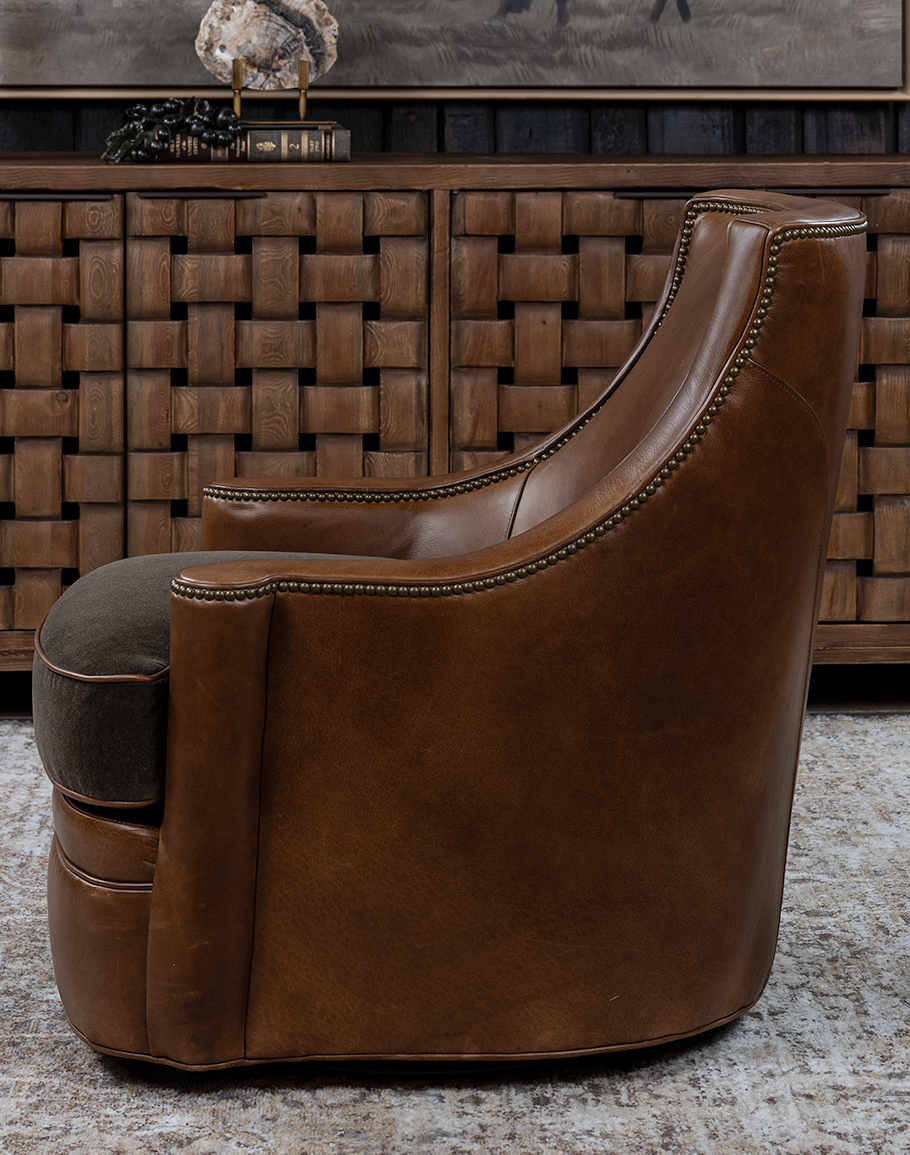 The Granger features a sculpted barrel back that gently curves into low, sheltering arms, creating an inviting, cradle-like sit. A fully upholstered swivel base gives the chair a continuous, drum-shaped silhouette while concealing a smooth 360° swivel mechanism perfect for open living rooms, conversational seating groups, or a cozy reading corner.The frame has a warm whiskey/caramel tone with natural grain variations that highlight the hide’s authenticity and depth. The back and sides are clean and tailored, with subtle seaming that emphasizes the chair’s curved profile. A line of antique brass nailhead trim traces the top rail and follows the arm, adding jewelry-like detail and a classic Western touch.The boxed seat cushion introduces a sophisticated material contrast: it’s upholstered in a deep espresso charcoal fabric, a rich, heathered textile that reads as dark chocolate brown with soft black undertones. A saddle-tan leather welt frames the cushion, visually tying the seat to the leather base and reinforcing the chair’s bespoke, designer-made look.