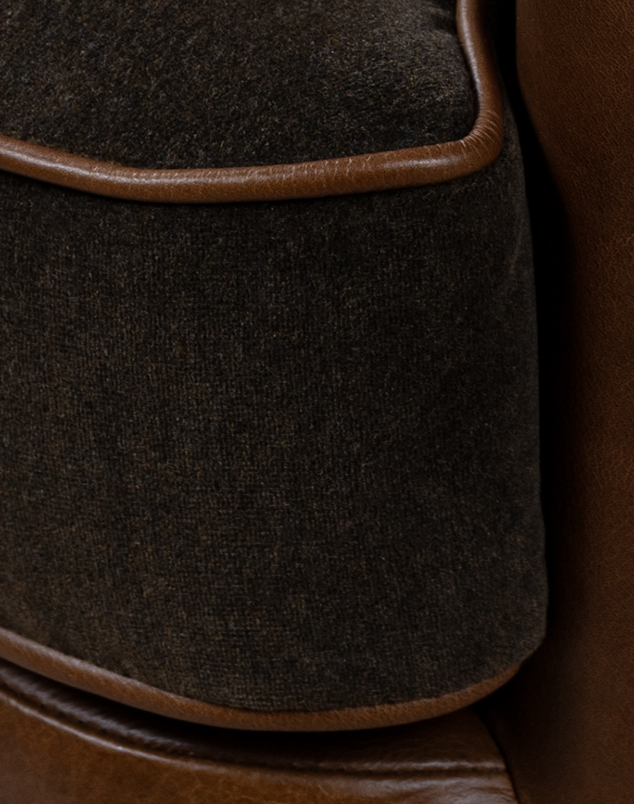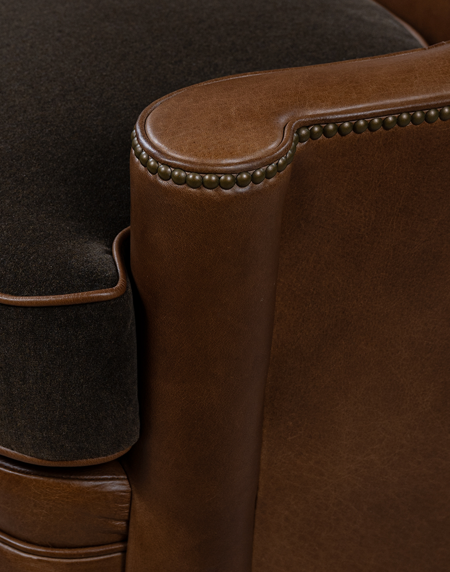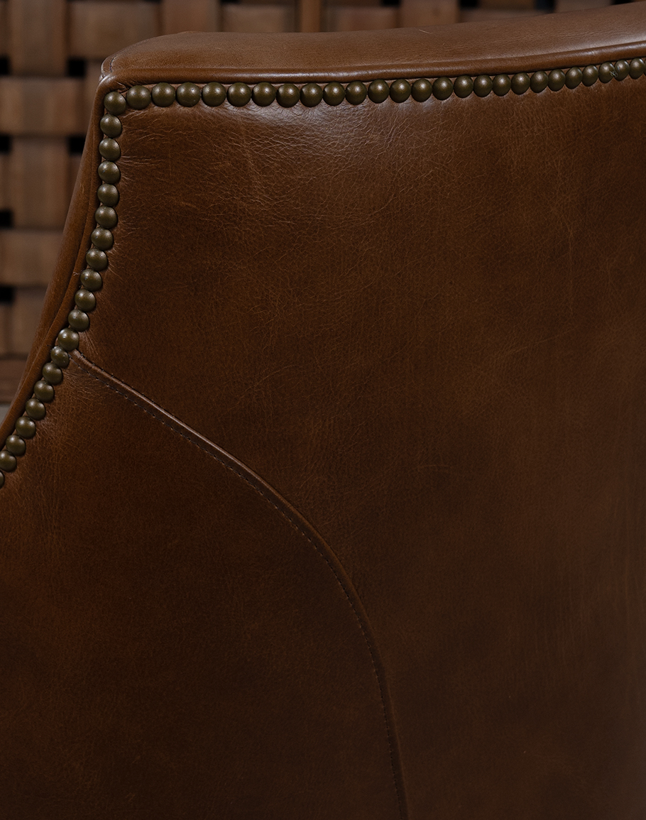 The Granger features a sculpted barrel back that gently curves into low, sheltering arms, creating an inviting, cradle-like sit. A fully upholstered swivel base gives the chair a continuous, drum-shaped silhouette while concealing a smooth 360° swivel mechanism perfect for open living rooms, conversational seating groups, or a cozy reading corner.The frame has a warm whiskey/caramel tone with natural grain variations that highlight the hide’s authenticity and depth. The back and sides are clean and tailored, with subtle seaming that emphasizes the chair’s curved profile. A line of antique brass nailhead trim traces the top rail and follows the arm, adding jewelry-like detail and a classic Western touch.The boxed seat cushion introduces a sophisticated material contrast: it’s upholstered in a deep espresso charcoal fabric, a rich, heathered textile that reads as dark chocolate brown with soft black undertones. A saddle-tan leather welt frames the cushion, visually tying the seat to the leather base and reinforcing the chair’s bespoke, designer-made look.