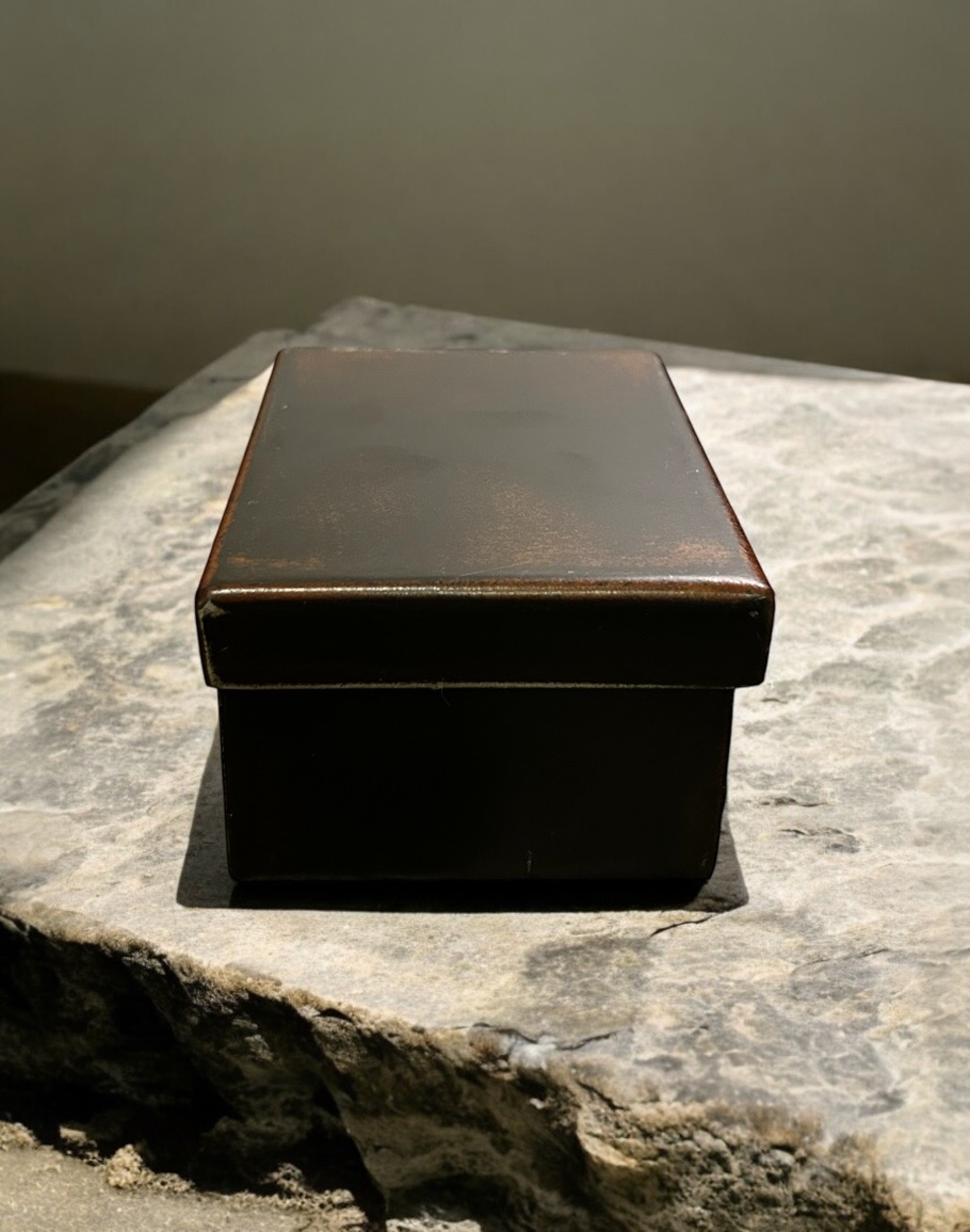 Wax cast squared top decanter and leather lined iron tray Dimensions: 6" x 6" x 9" Care instructions: Hand wash removable glass decanter. Soft d..