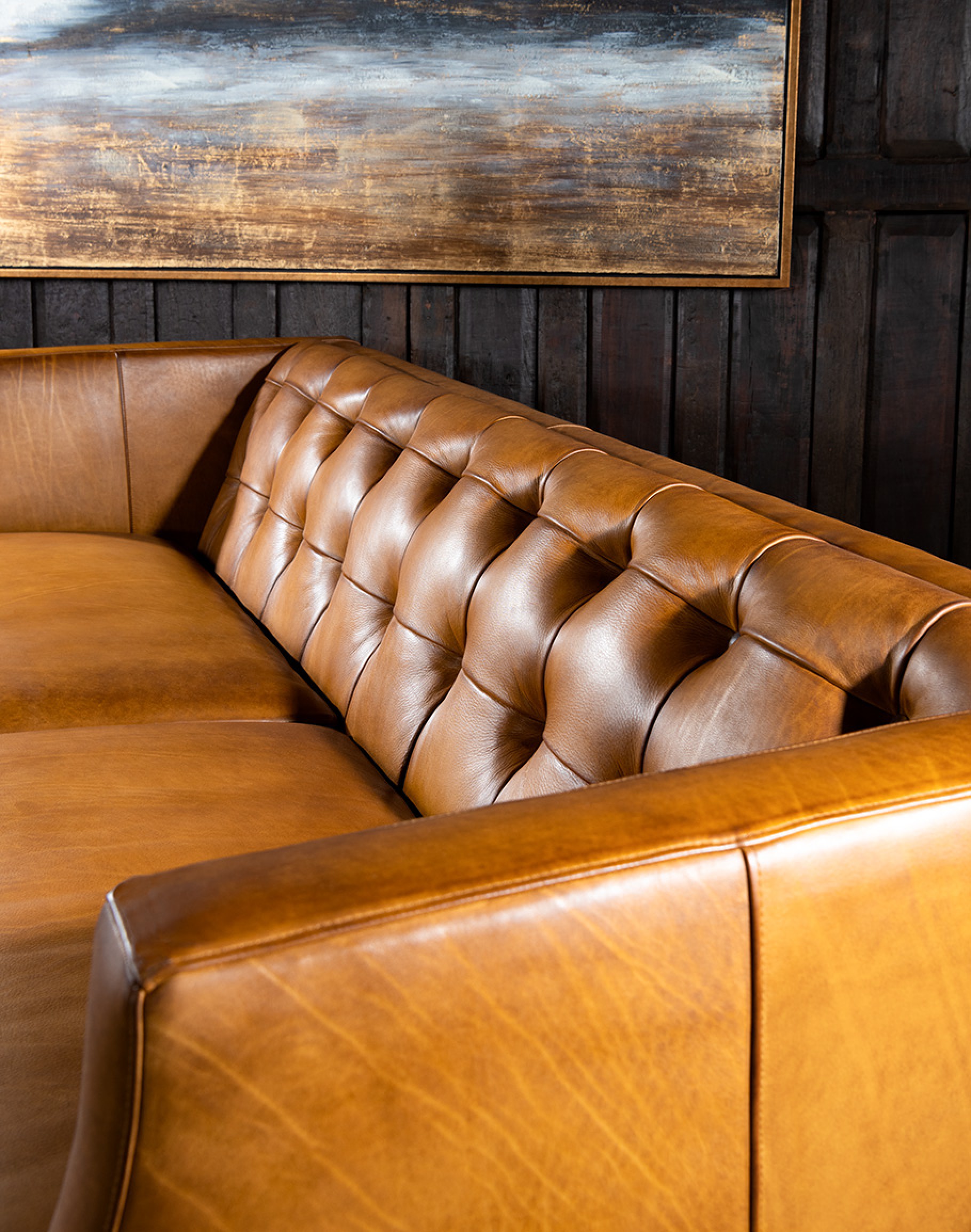 Experience the timeless elegance of our Hampton Tufted Leather Sofa. This classic Chesterfield design has been updated for the modern age, with artisan hand burnished leather, brass nail heads, and deep squared button tufting throughout. Our handmade furniture is crafted using an eight-way hand-tied method, ensuring the highest quality and attention to detail.