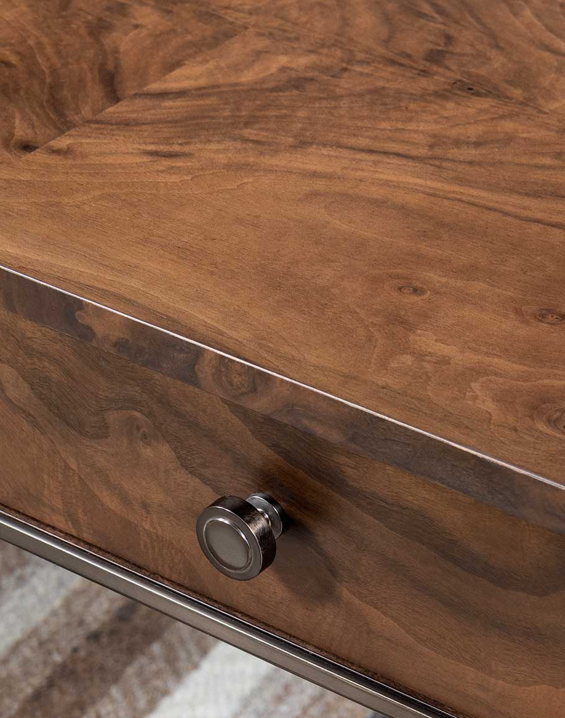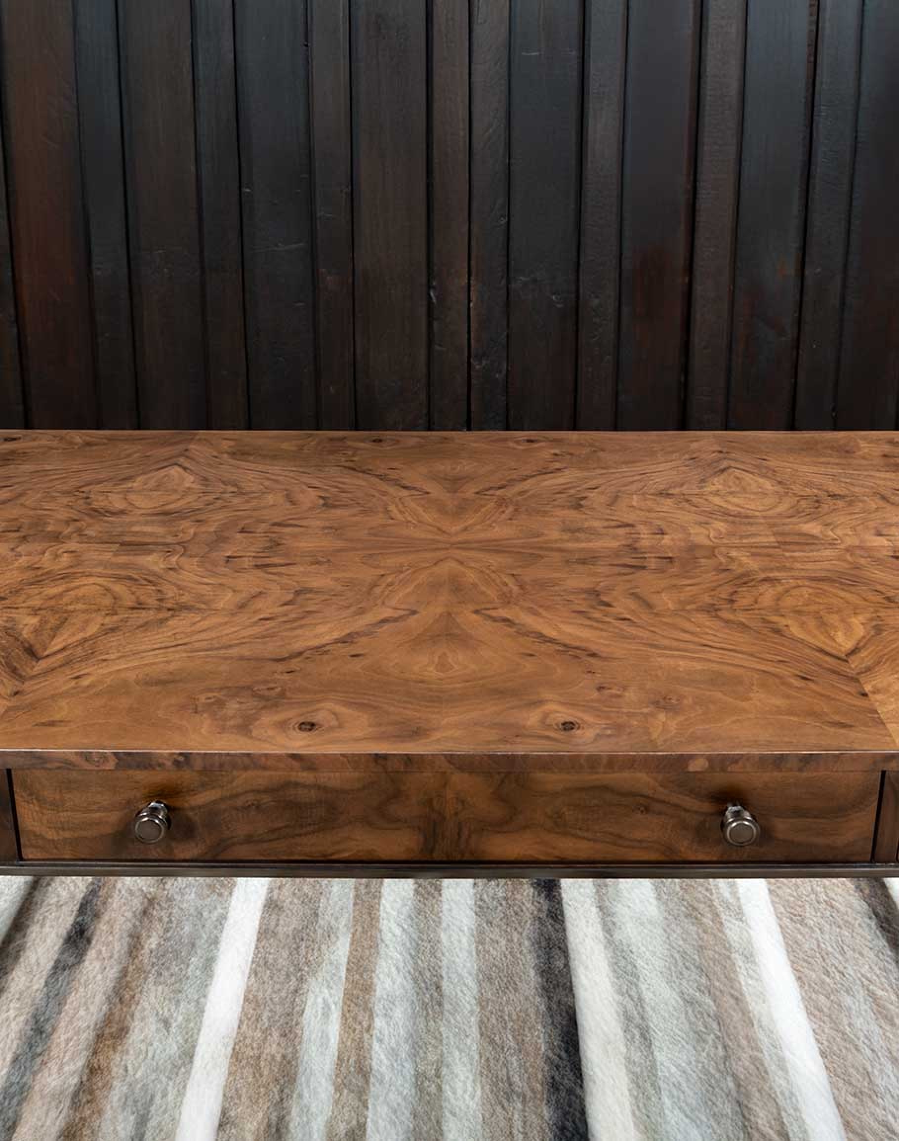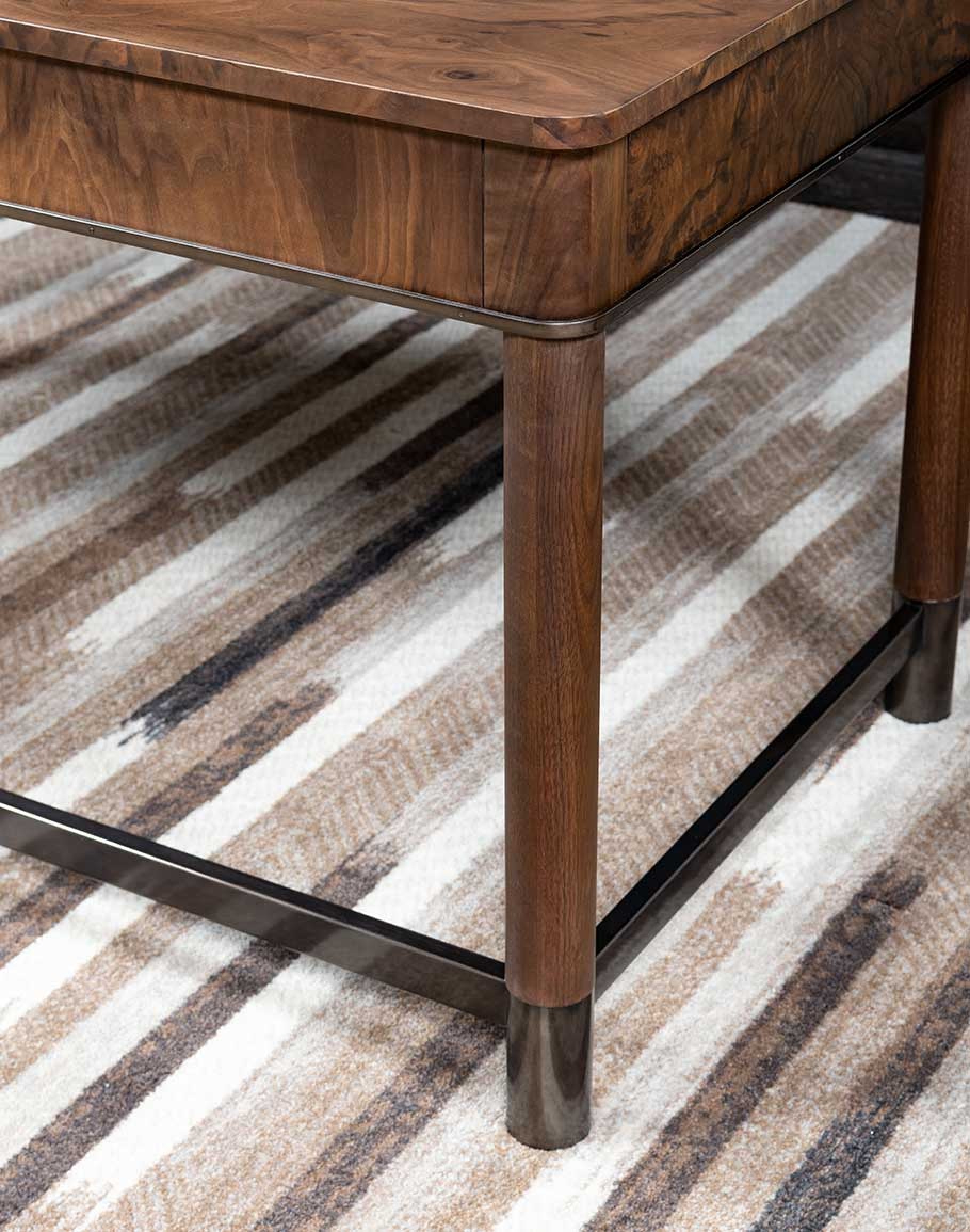 Constructed from 5-ply Burled Walnut wood, the desk showcases a stunning wood grain pattern that exudes sophistication and natural beauty. The luxurious veneer is paired with solid poplar legs for exceptional durability and structural integrity. A sleek metal base adds a modern industrial touch, perfectly balancing the desk’s classic and contemporary appeal.
