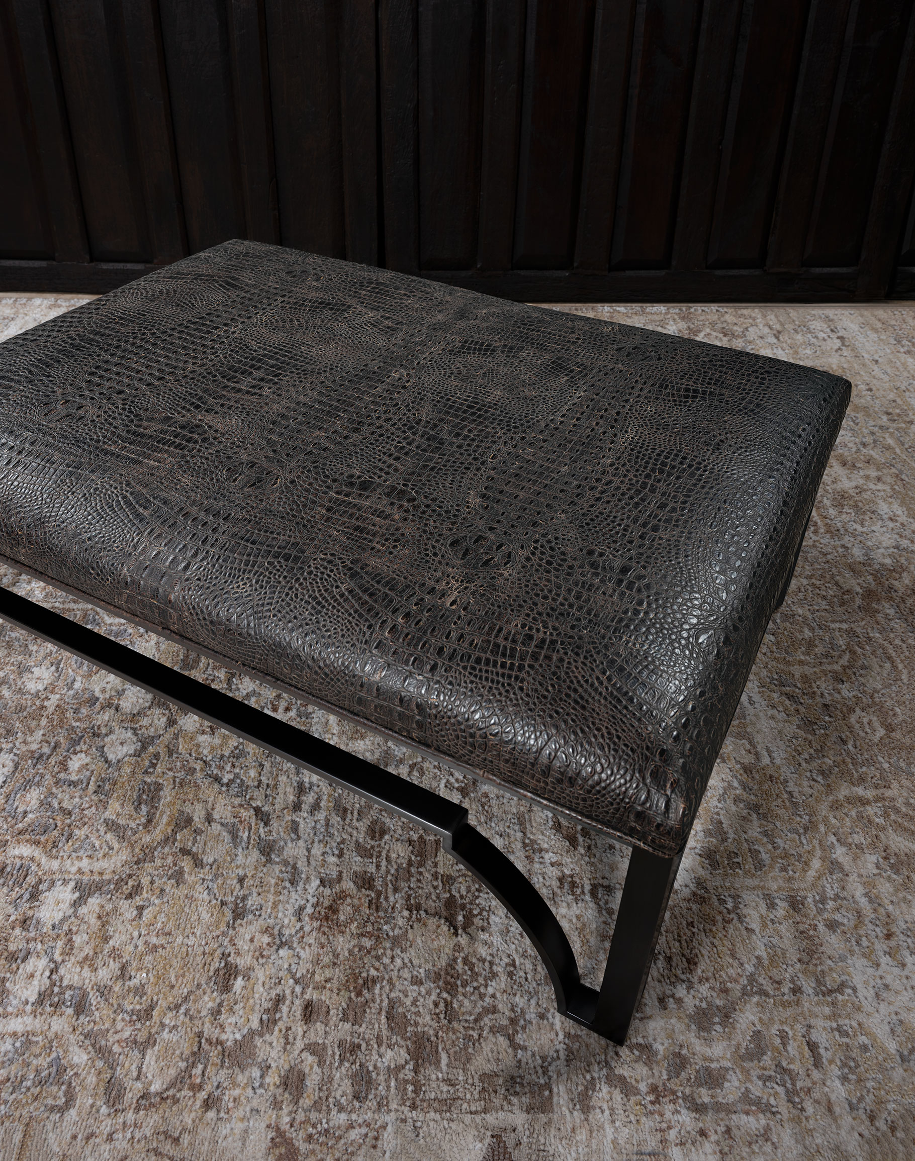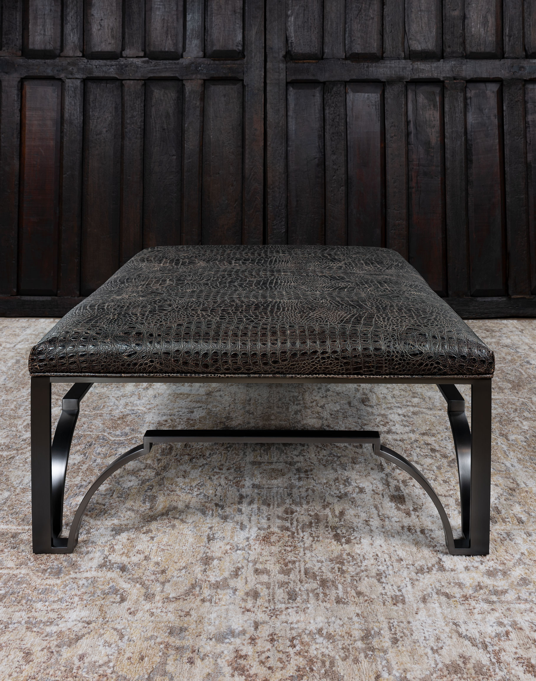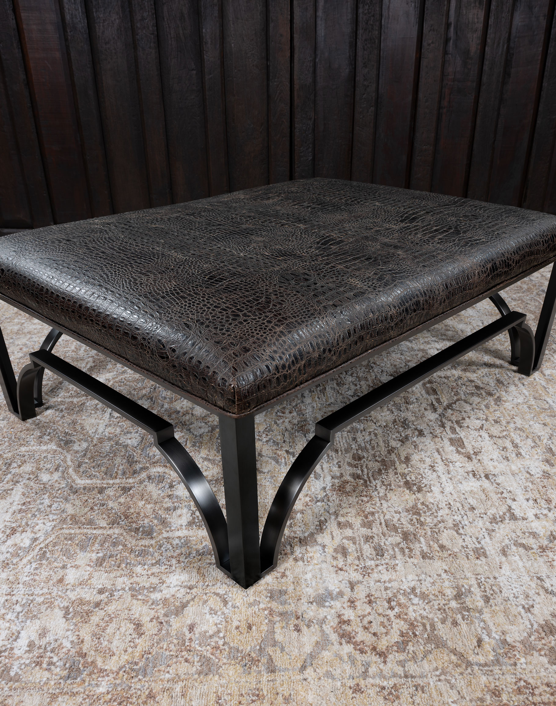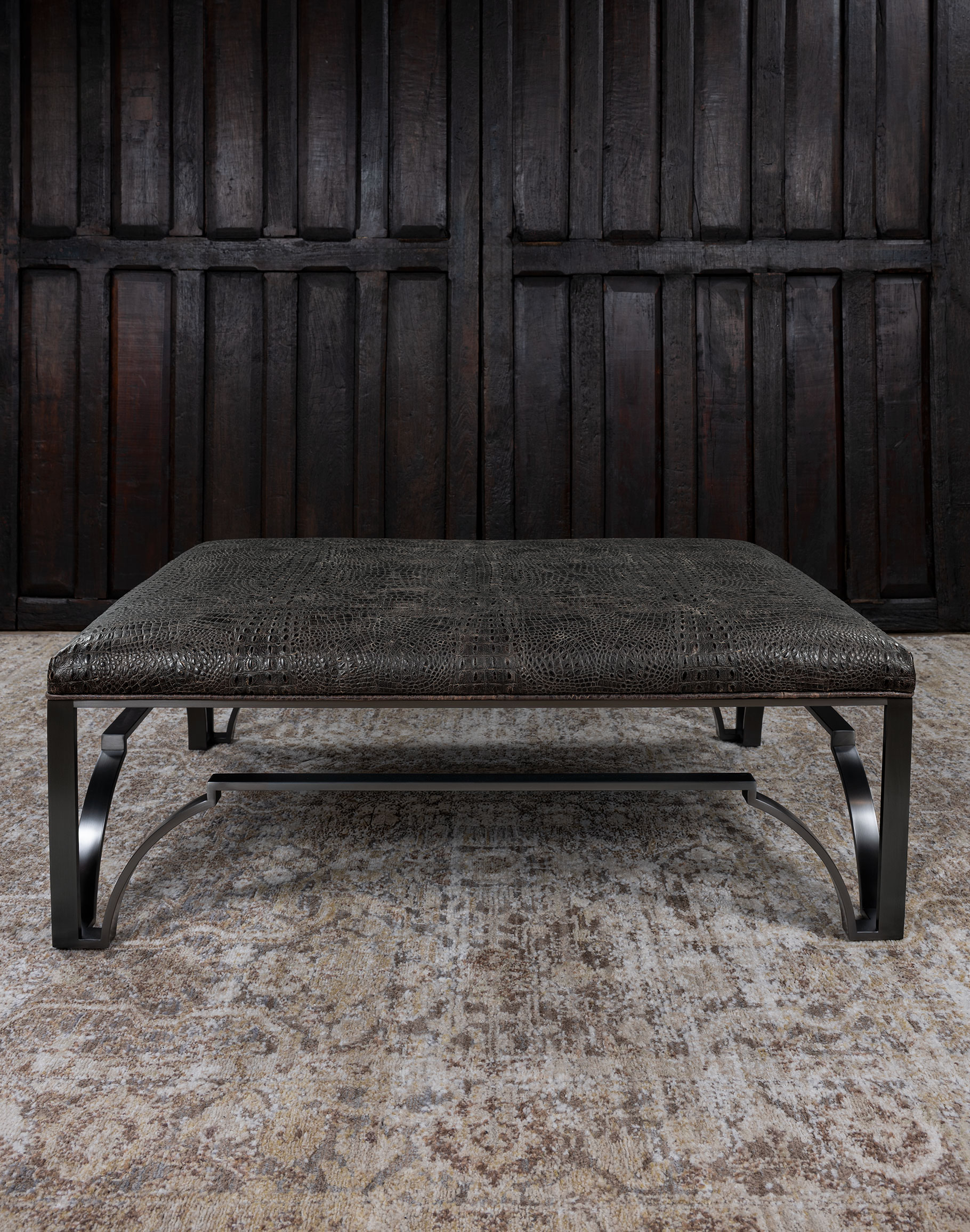 The generously scaled rectangular top features a tailored, boxed cushion silhouette with softly rounded corners and clean, knife-edge seaming. Upholstered in a rich stone color croc-embossed leather, the surface showcases dramatic natural texture with deep espresso undertones and subtle charcoal lowlights. This sophisticated stone hue offers a warm neutral foundation, allowing the ottoman to anchor both modern ranch and refined rustic spaces with ease. The intricate embossed pattern adds depth, movement, and a luxurious tactile quality that elevates the entire piece. Beneath the upholstered top, a custom architectural steel base creates striking contrast. Finished in a matte blackened iron, the base features substantial square legs paired with sculptural, arched stretchers that sweep inward to meet a linear support bar. The curved foot design introduces visual tension against the structured rectangular top, delivering a balanced blend of strength and sophistication. This forged-metal foundation not only provides exceptional stability but also enhances the ottoman’s bold, contemporary ranch aesthetic.