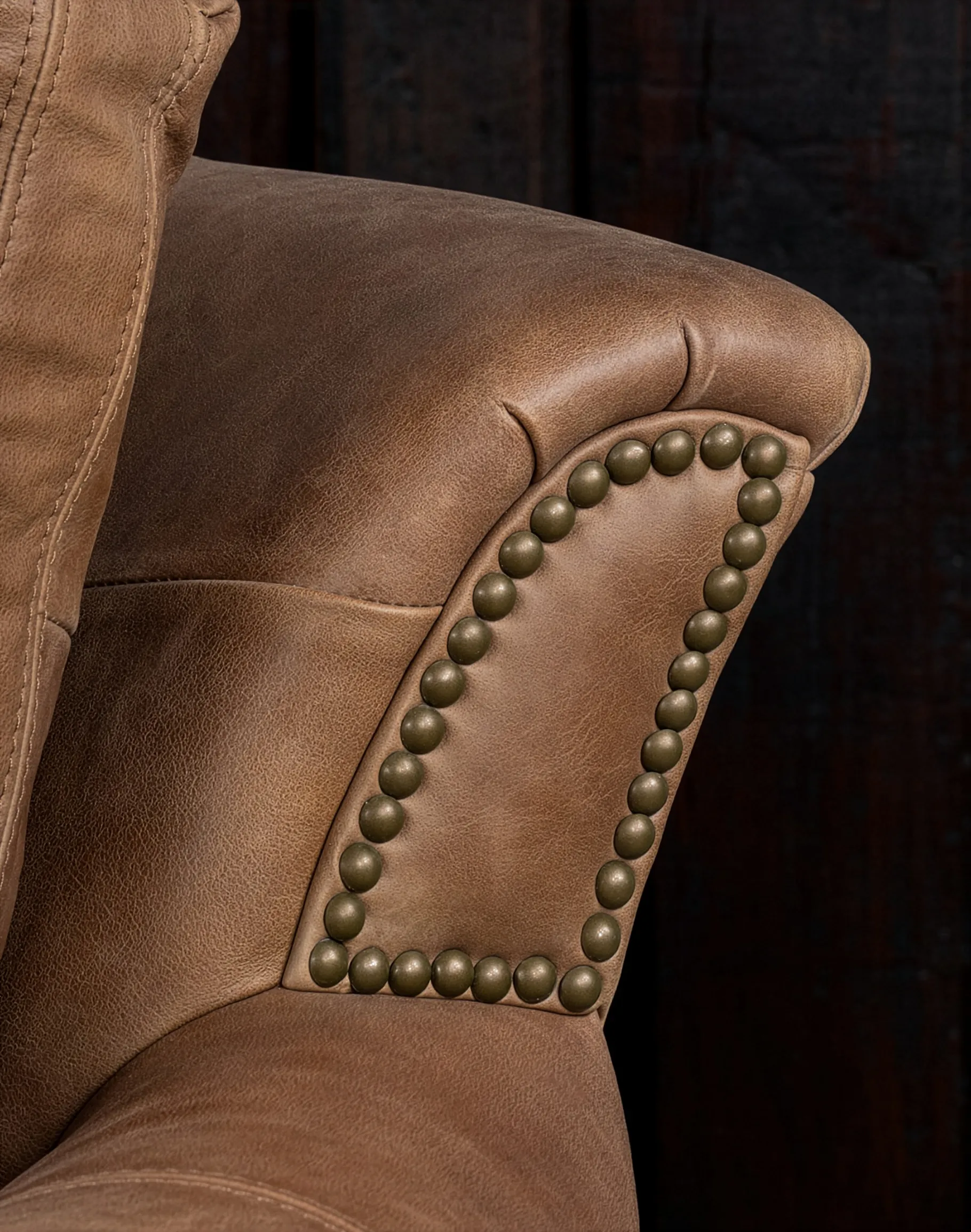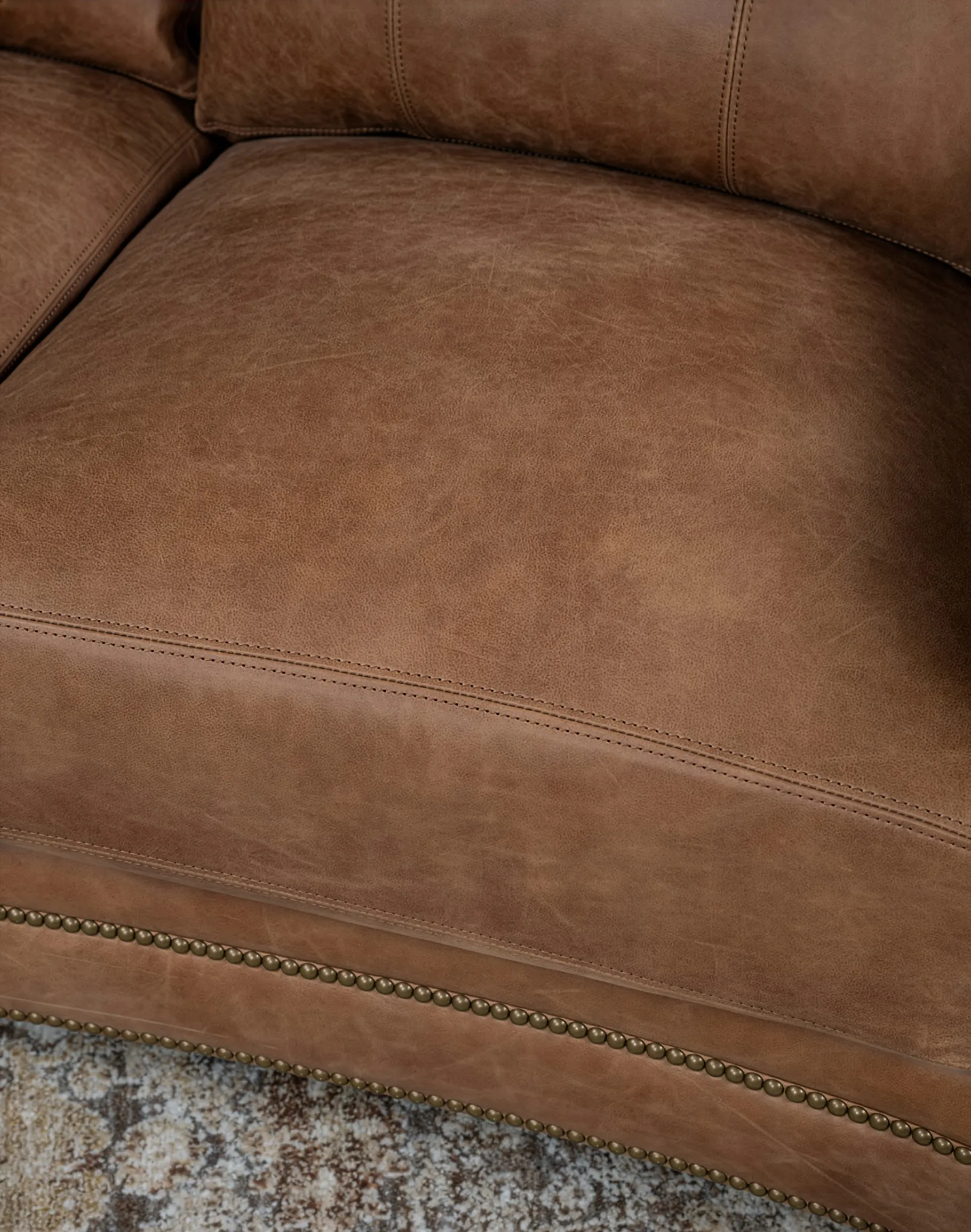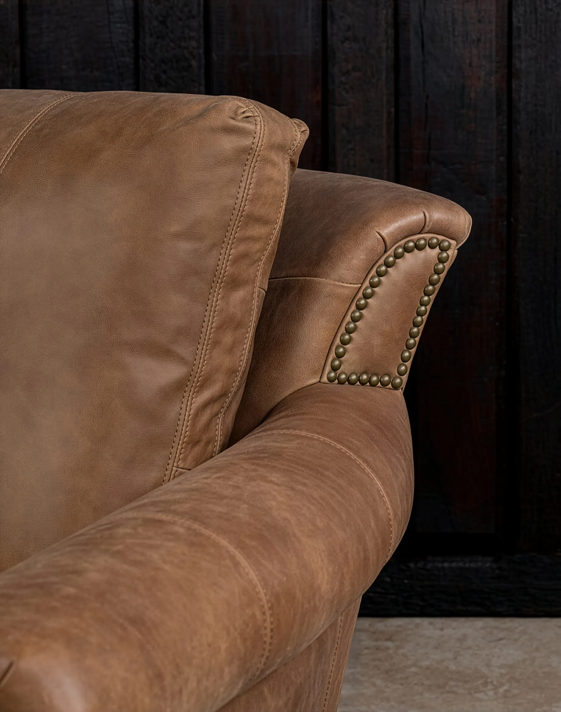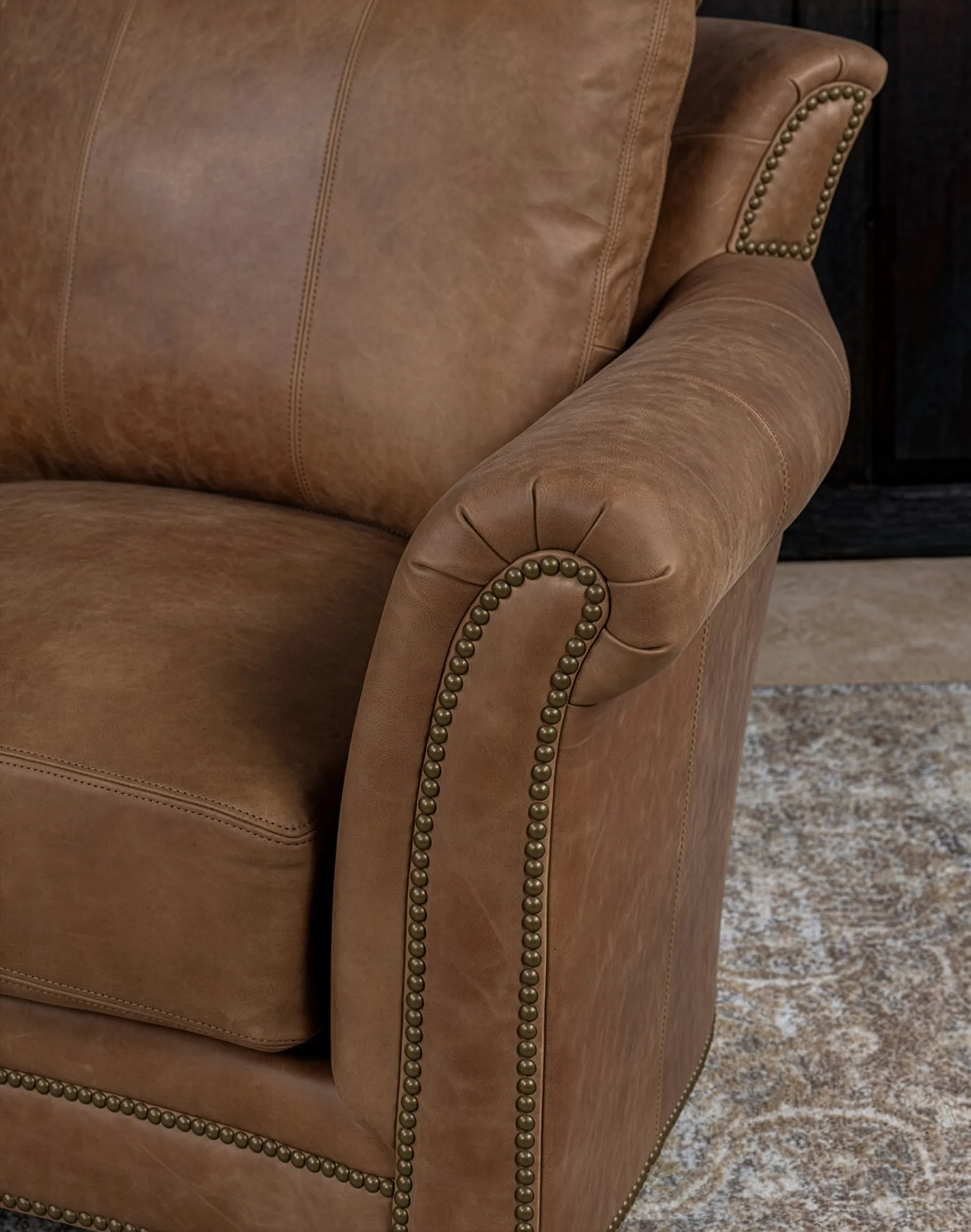 The Hondo features gently rolled track arms accented with classic antique brass nailhead trim, meticulously spaced for a tailored finish. Its loose back cushions are firmly secured with Velcro for a clean, structured presentation while maintaining adjustability. Each back cushion is filled with 100% virgin polyester fibers, encased in specialized ticking to deliver consistent loft and pillow-soft comfort without sacrificing support. Beneath the surface, the Hondo is built to perform for generations. It features true 8-way-hand-tied suspension, the gold standard in luxury upholstery, ensuring even weight distribution, superior comfort, and long-term resilience.