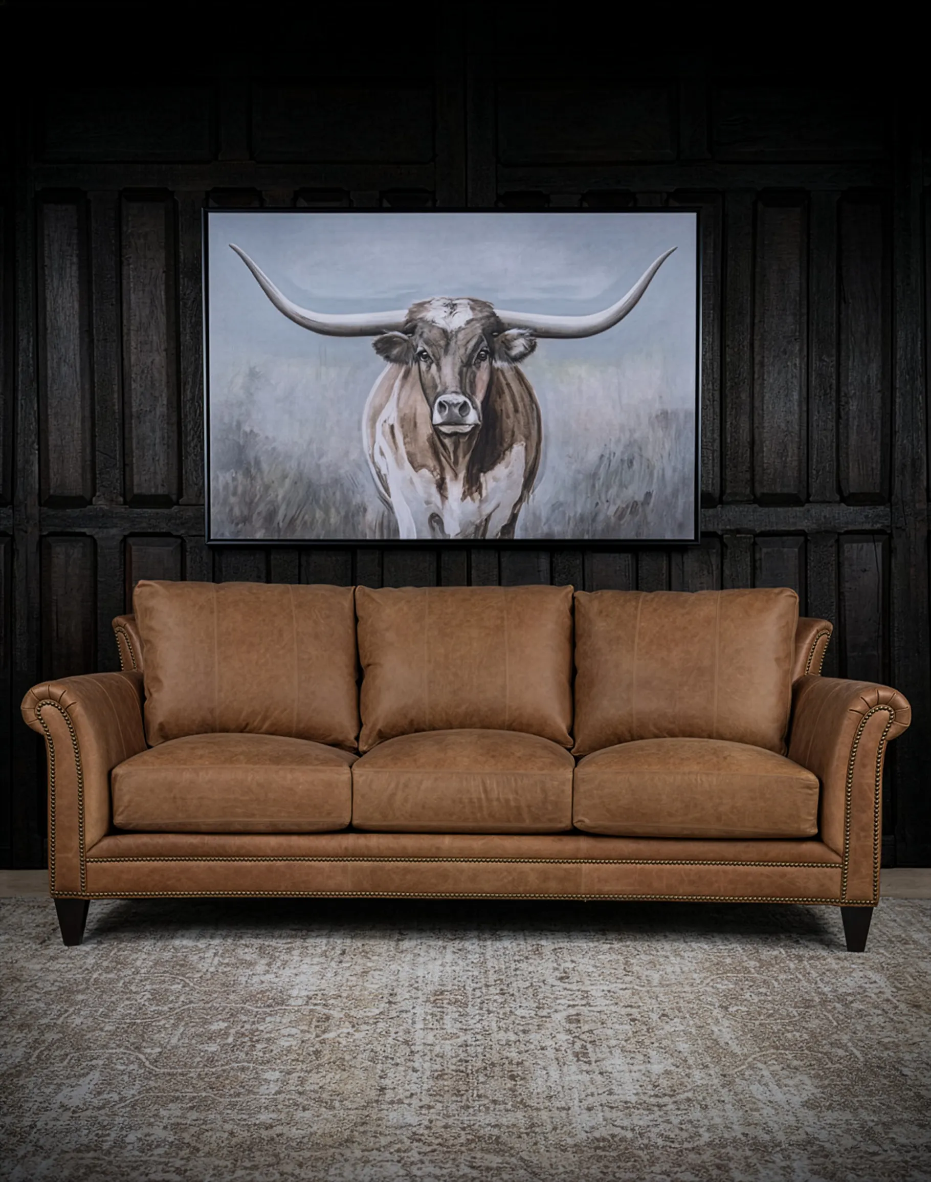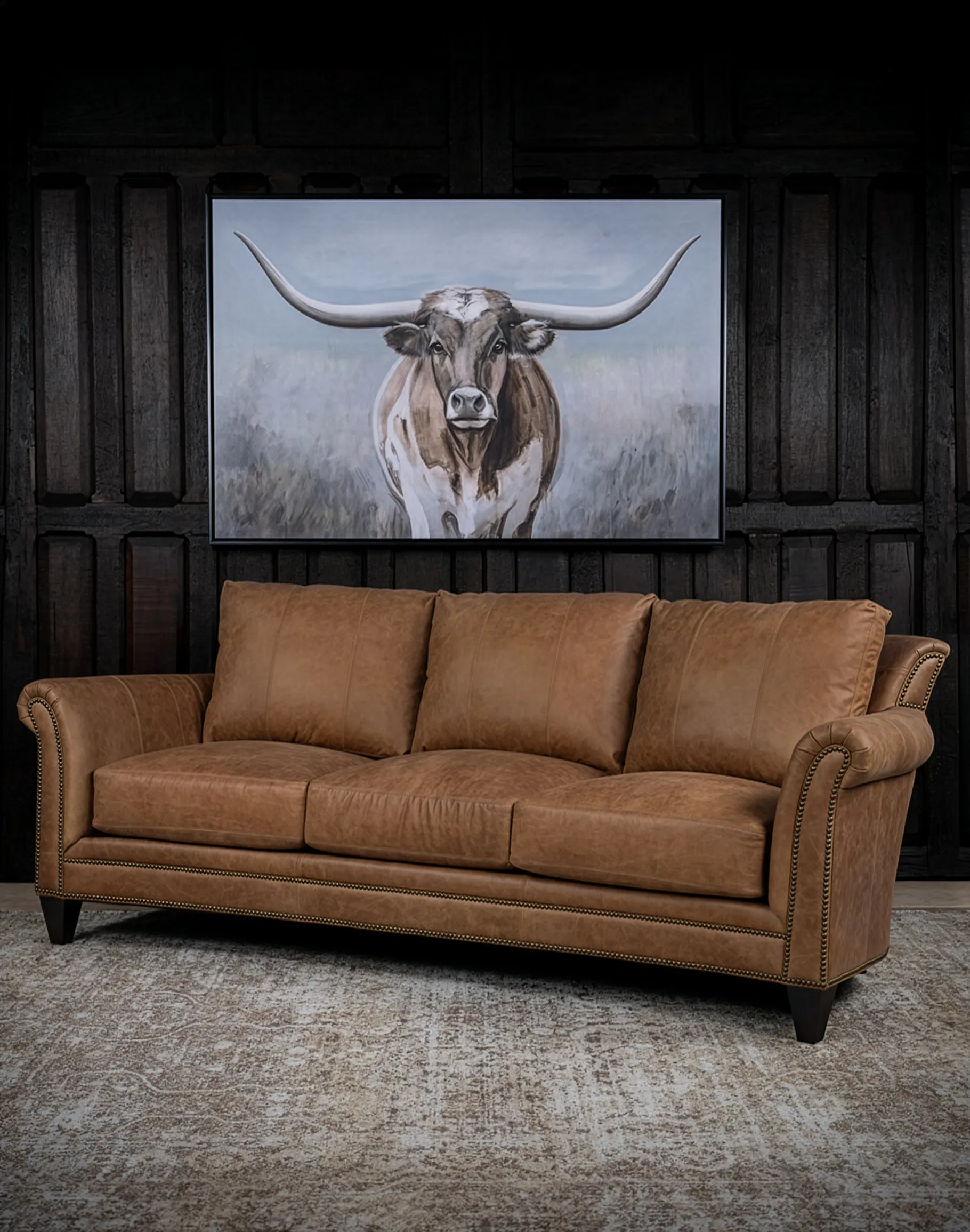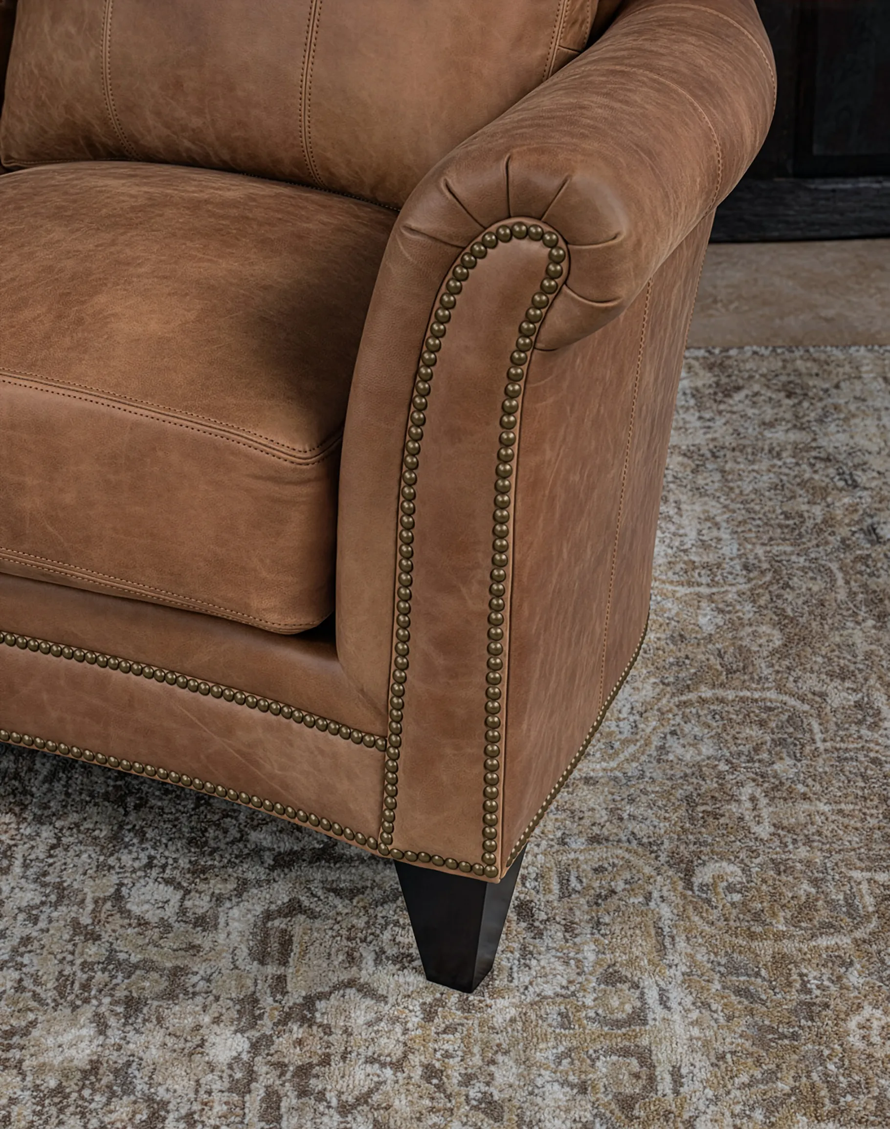 Three generously proportioned seat cushions provide deep, supportive seating, while the tailored base rail and hand-applied nailhead detailing along the apron add architectural refinement. The sofa is elevated on solid wood tapered legs in a deep espresso finish, grounding the warm leather with a subtle contrast. At Adobe Interiors, we create the furniture, and you create the memories.