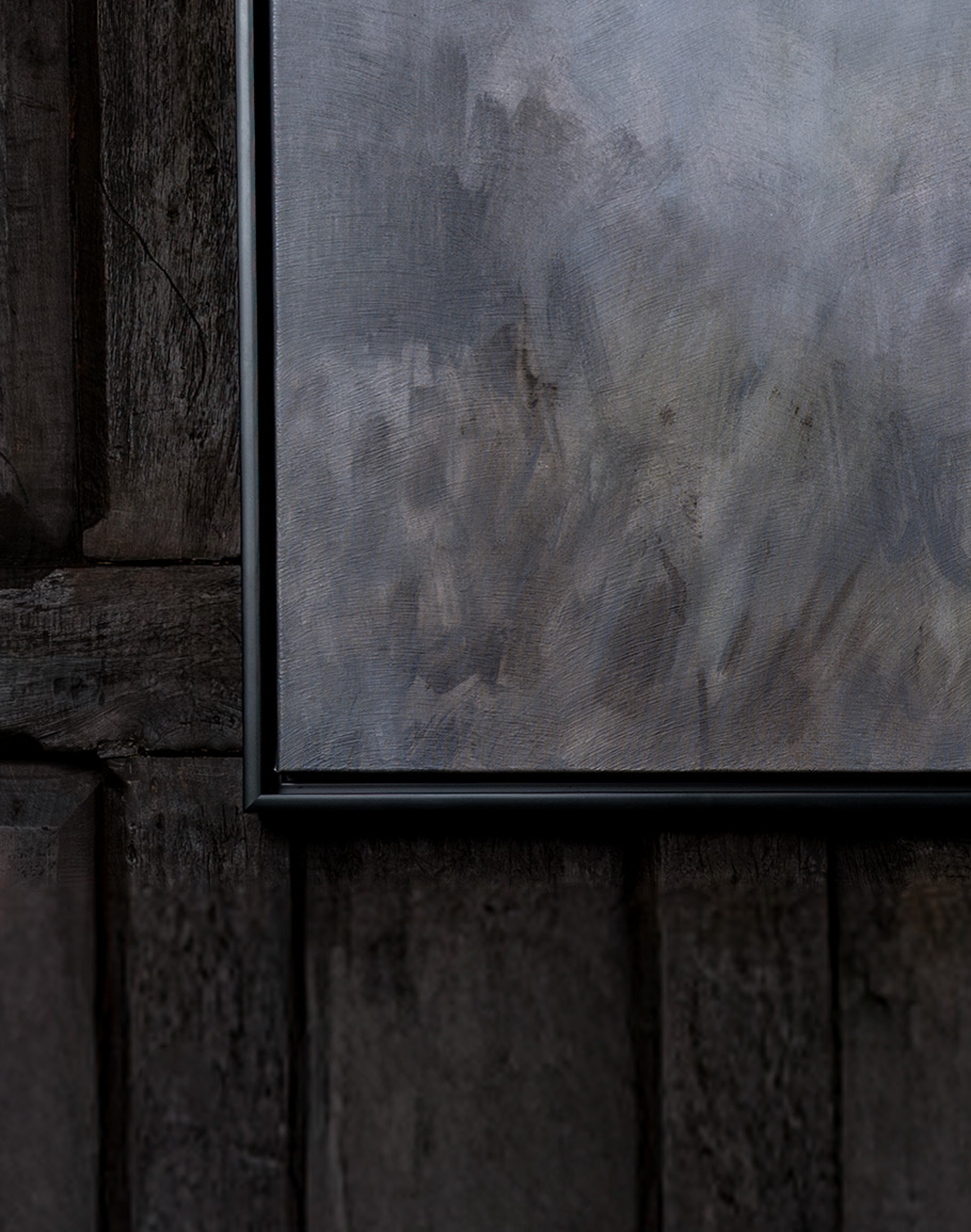 The palette is earthy and refined: warm leather browns and natural cream tones balance against cool slate, fog, and steel-blue undertones. This harmony of warm and cool makes the artwork incredibly versatile while maintaining a distinctly Western character.
