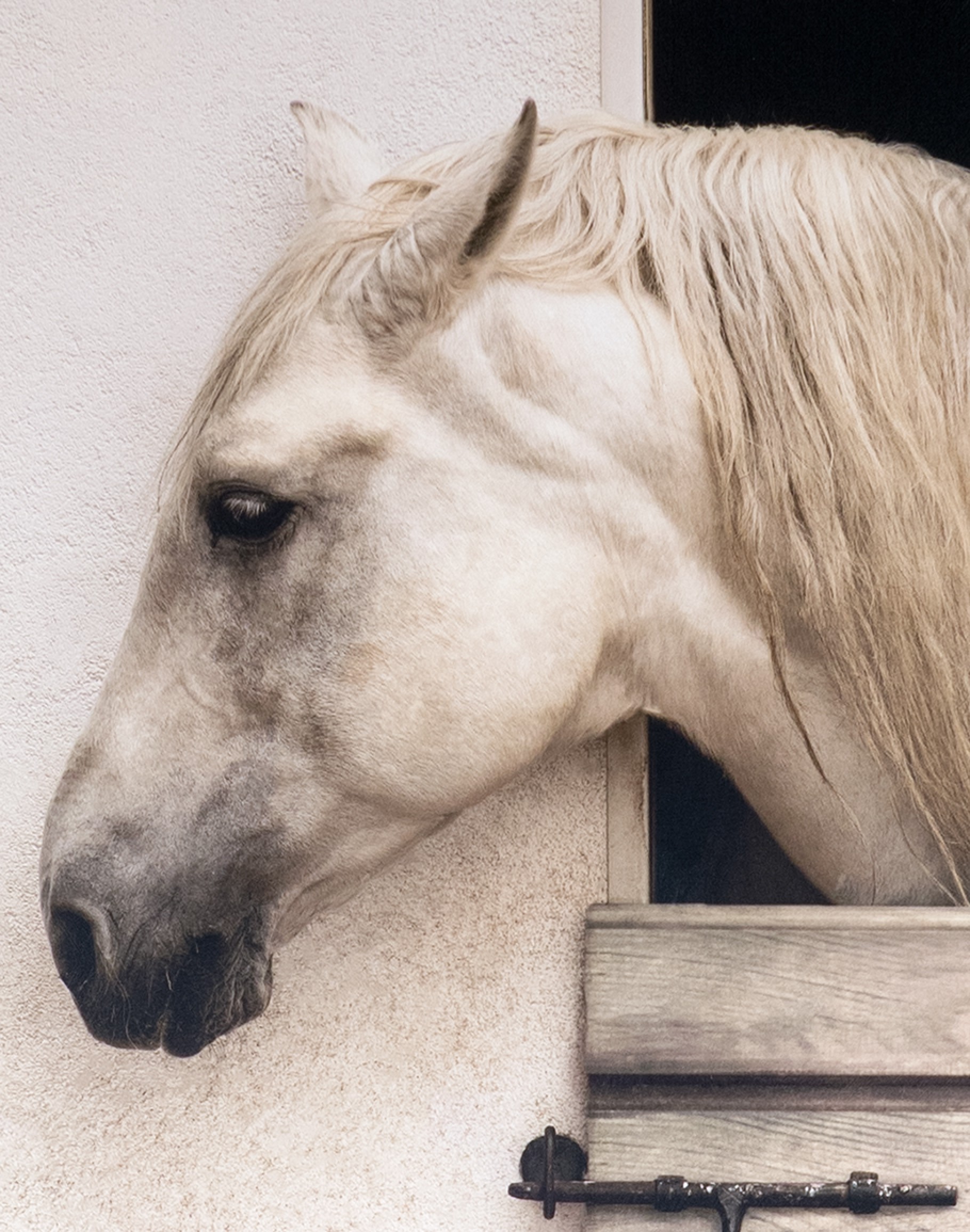 The artwork is elegantly encased in a matte black wooden frame. This high-quality framing enhances the visual depth of the art piece and brings out the contrast in the horse’s white coat against the stable's earthy hues. The simplicity of the frame design pairs beautifully with the intricate detail of the portrait, making it a versatile addition to any decor scheme.