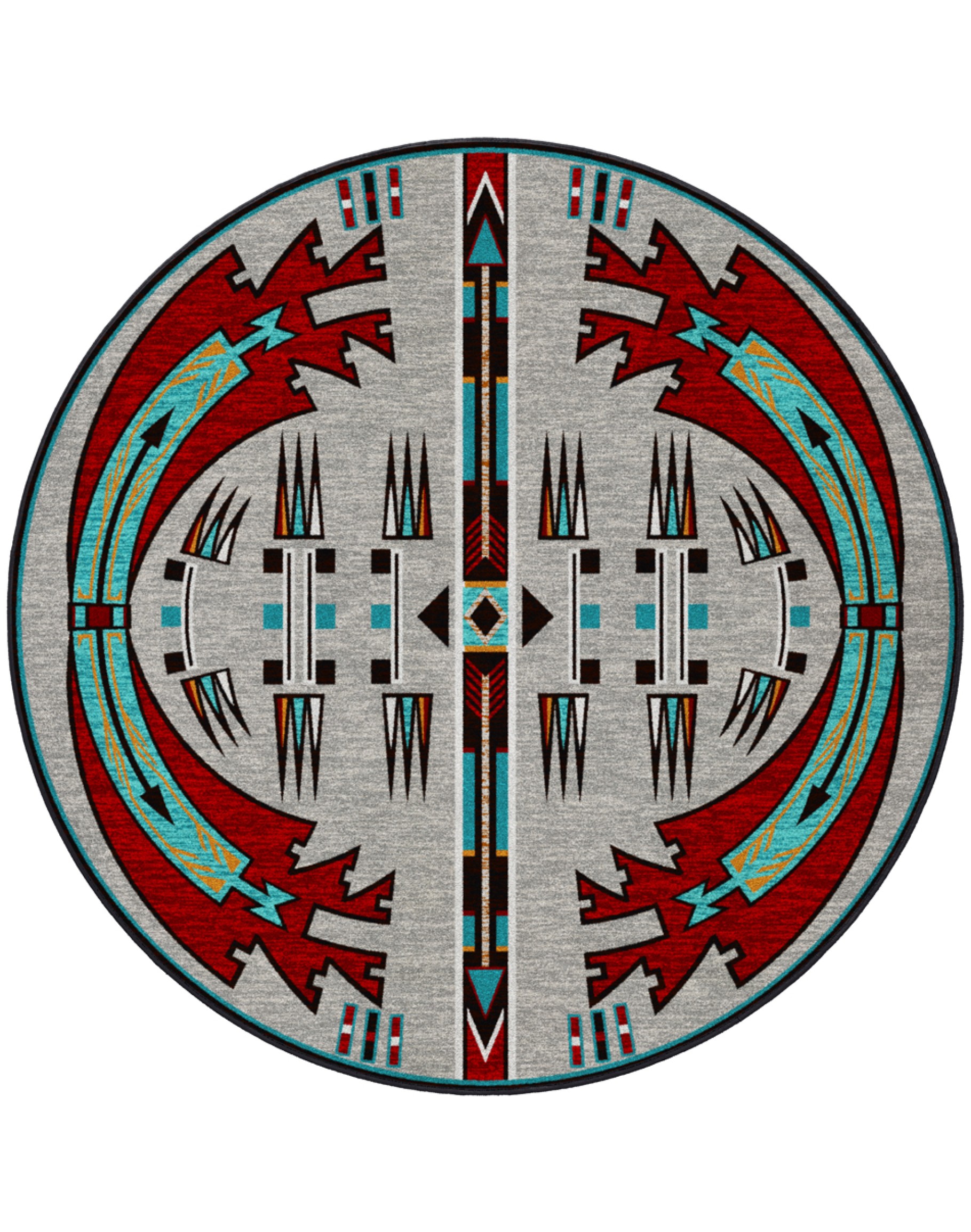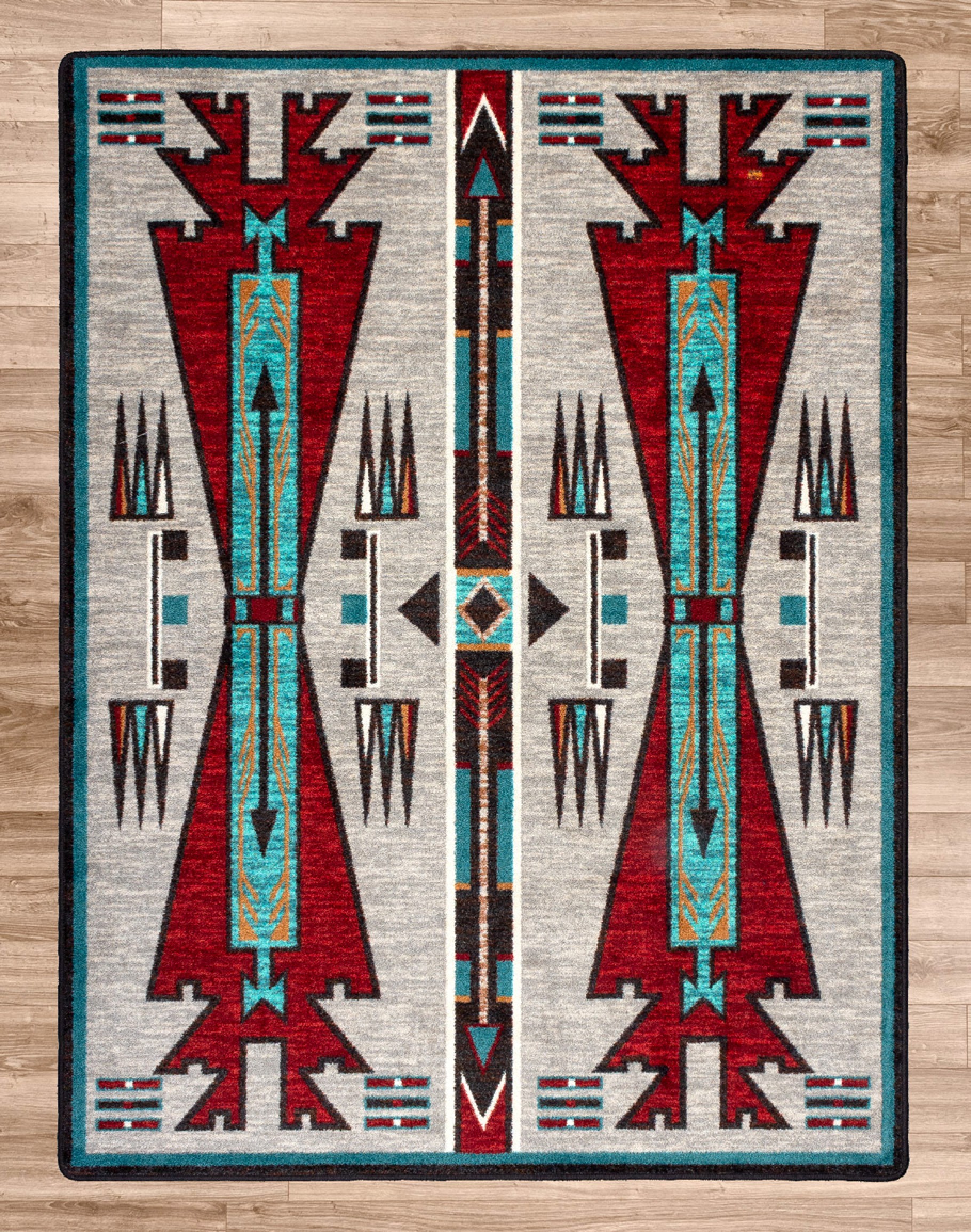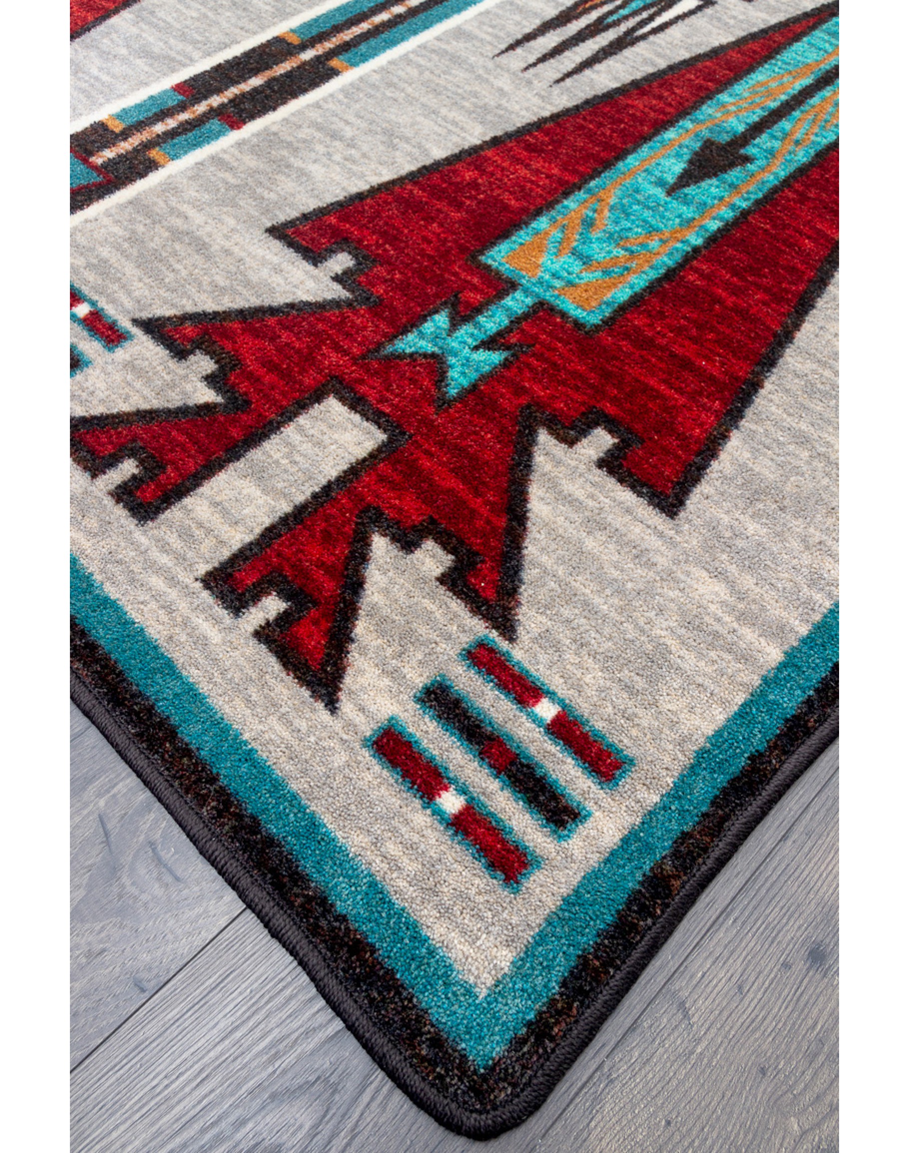 Introducing the Horse Thieves Electric Rug - a stunning southwestern style rug that is sure to add a touch of vibrant elegance to any room. This rug is made to order in the U.S.A from premium EnduraStran Nylon, ensuring durability and longevity. With its eye-catching shades of light grey, deep red, and turquoise in a Navajo inspired pattern, this rug is sure to make a statement in any home.