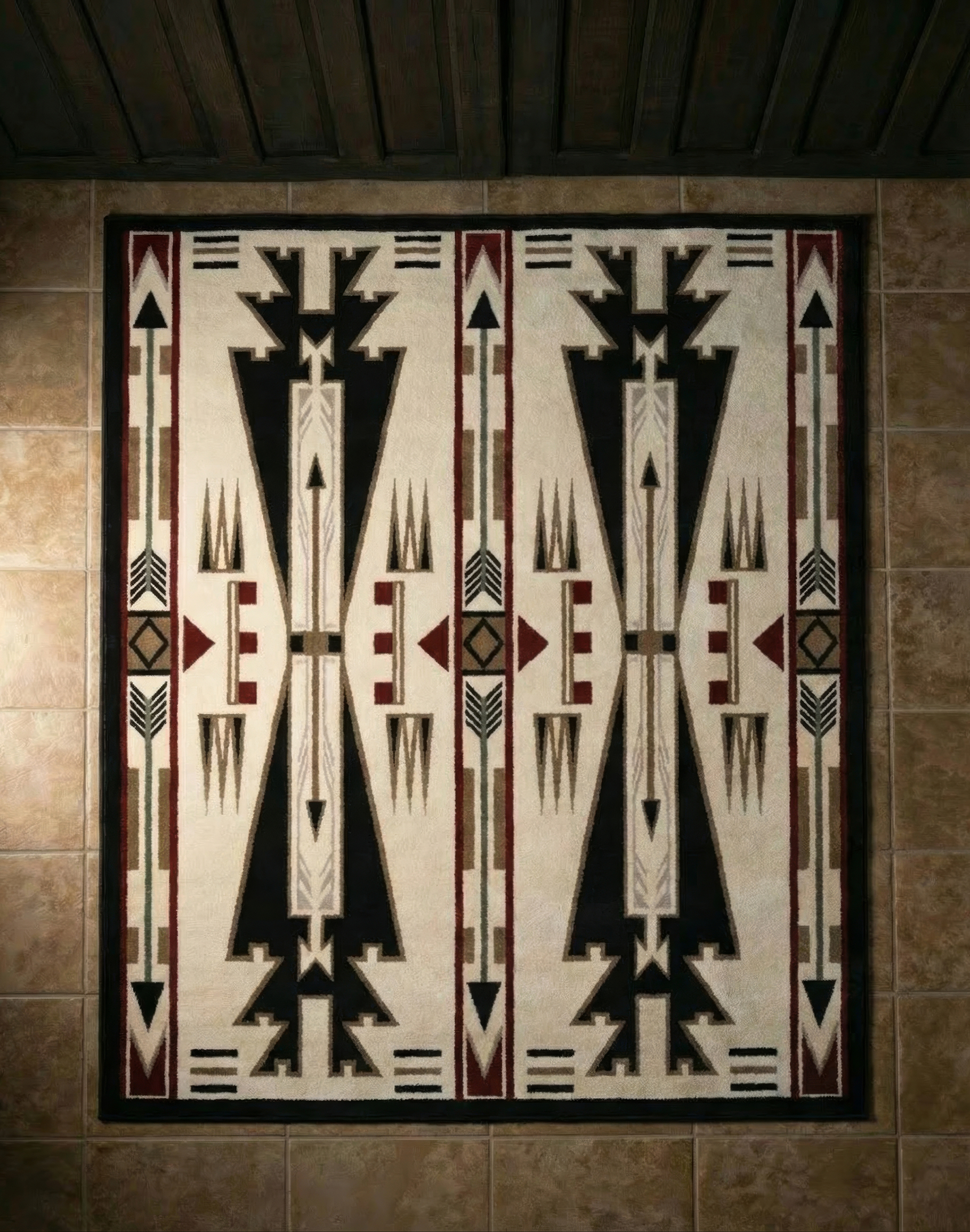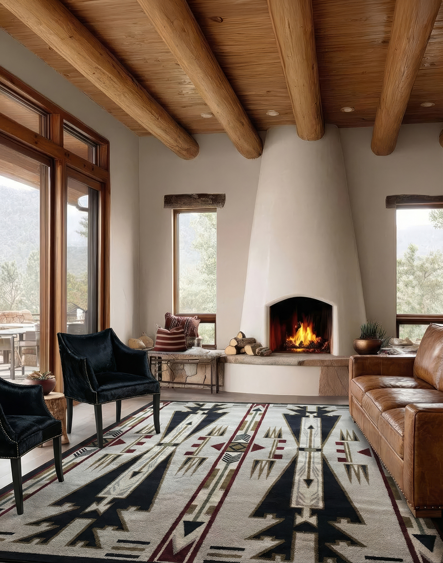 Bring bold Southwestern character into your space with the Horse Thieves Natural Rug. Designed with a striking tribal-inspired pattern, this rug features strong geometric motifs, arrow detailing, and symmetrical banding that channel classic Western and Native-inspired style. The rich contrast of deep navy, warm burgundy, earthy olive, charcoal black, and soft taupe stands beautifully against a natural cream background—creating a grounded, authentic ranch aesthetic that complements rustic, Desert Ranch, lodge, and modern Western interiors.
