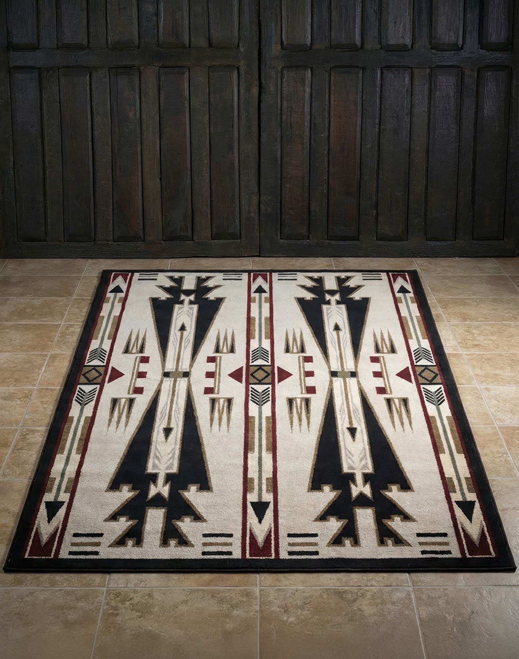 Bring bold Southwestern character into your space with the Horse Thieves Natural Rug. Designed with a striking tribal-inspired pattern, this rug features strong geometric motifs, arrow detailing, and symmetrical banding that channel classic Western and Native-inspired style. The rich contrast of deep navy, warm burgundy, earthy olive, charcoal black, and soft taupe stands beautifully against a natural cream background—creating a grounded, authentic ranch aesthetic that complements rustic, Desert Ranch, lodge, and modern Western interiors.