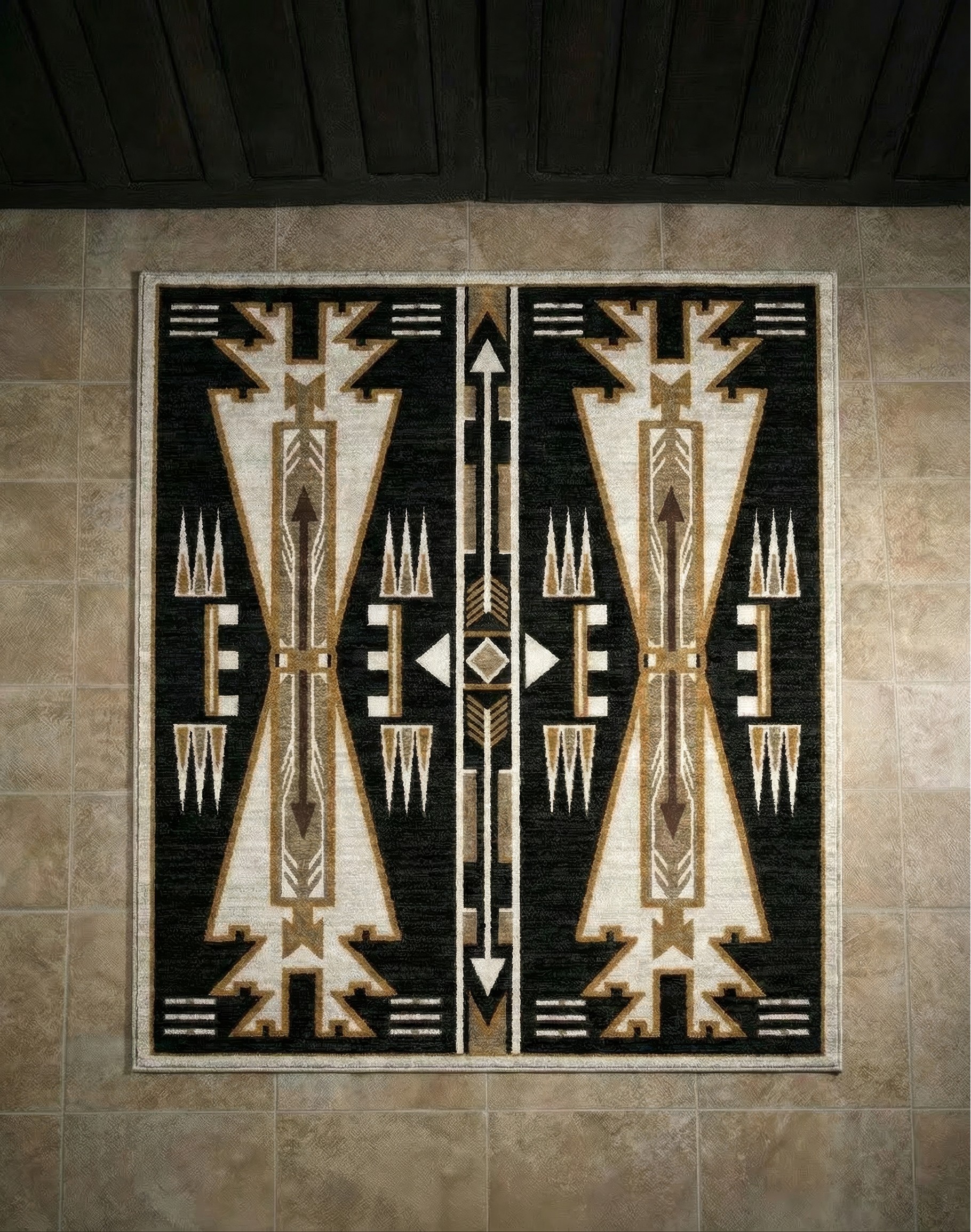 Bring refined Western character into your space with the Horse Thieves Warm Taupe Rug, a bold statement piece that blends heritage design with modern durability. Inspired by classic Southwestern motifs, this rug features a striking geometric pattern with layered arrow and tribal elements—grounded in rich black, warm taupe, sand, and soft ivory tones. The balanced contrast creates depth while maintaining a versatile, elevated palette that complements both rustic ranch interiors and modern Western spaces.