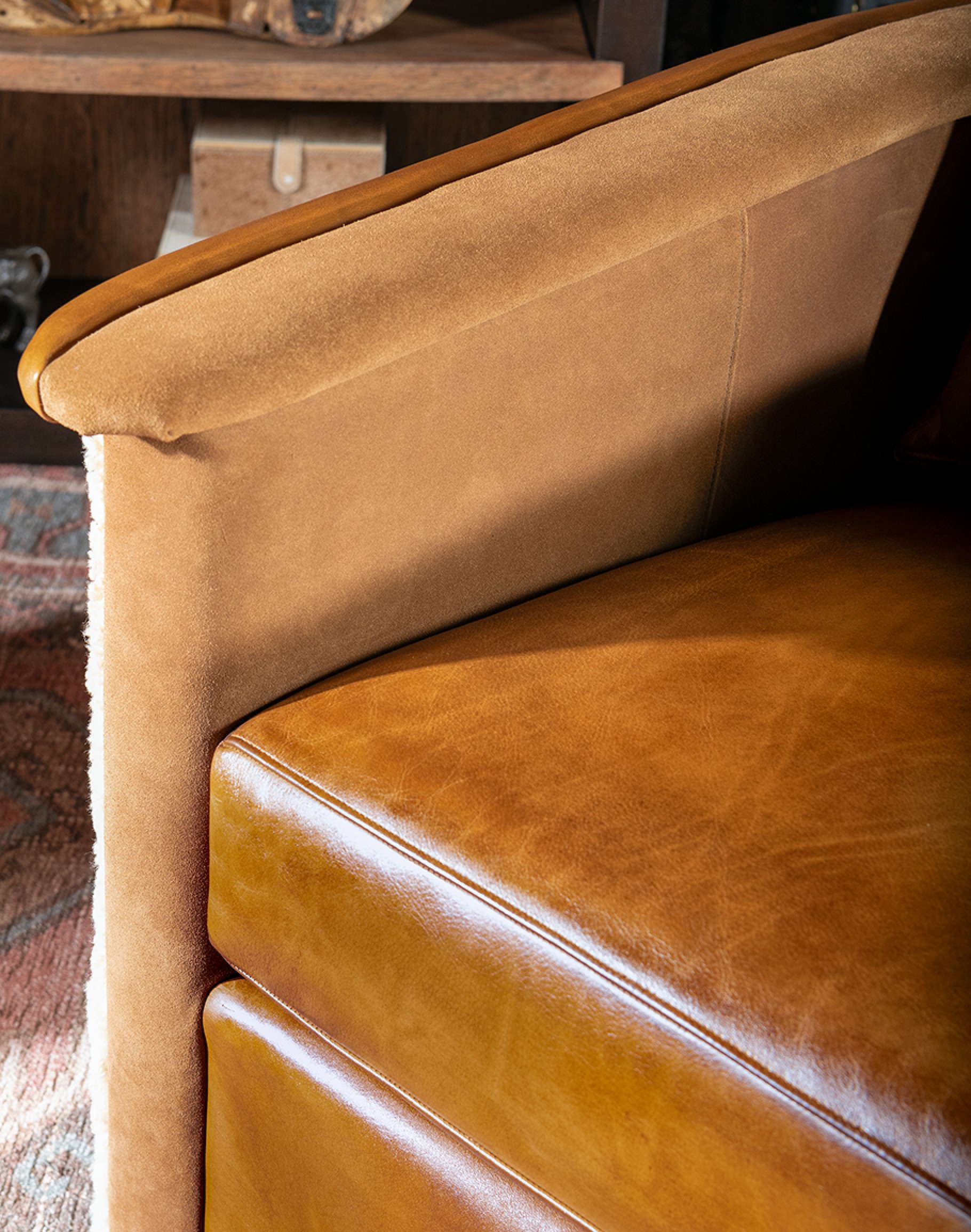 Exquisite Leather and Suede Detailing: The hand burnished leather detailing adds a touch of sophistication and uniqueness to each chair. Supple suede accents along the inside arms and armrest provide an extra layer of luxury and comfort.