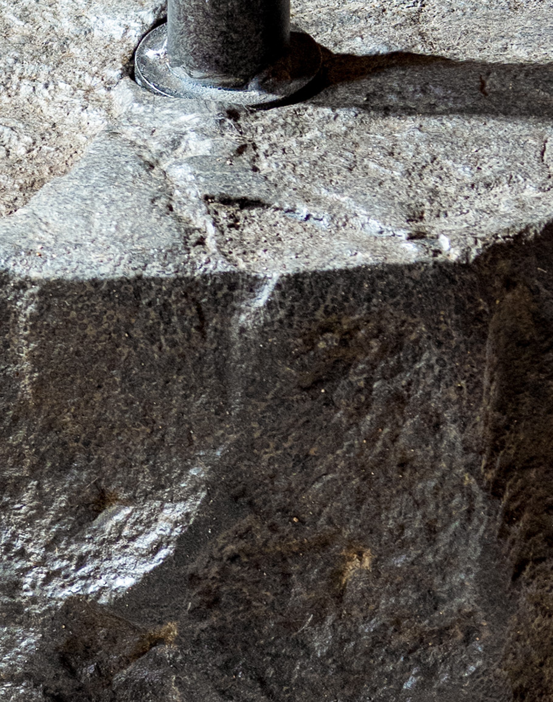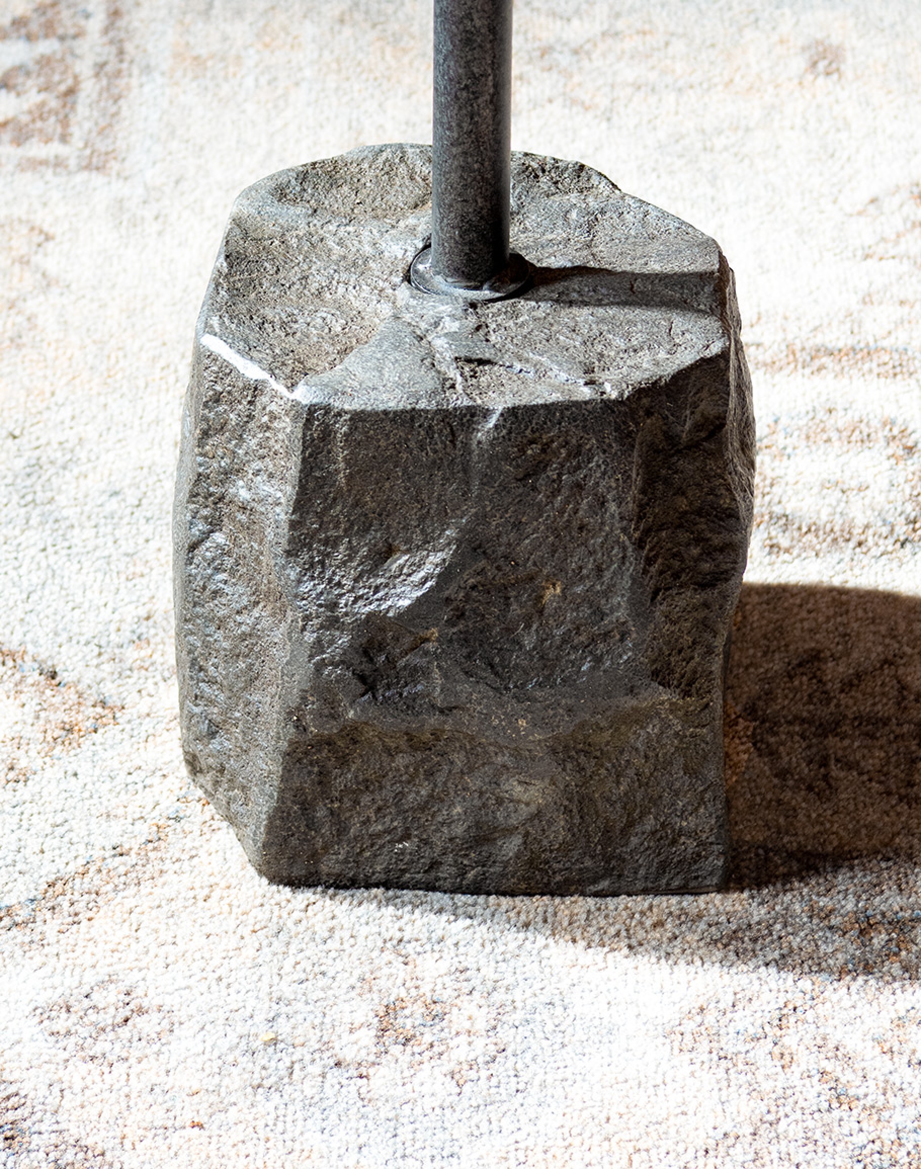 A true rustic centerpiece, this accent table appeals to many design styles with a natural recycled elm top showcasing an inlaid starburst pattern. Accented with an aged iron support element and stabilized by a rough chiseled bluestone block with inherent white marbling and veining throughout.