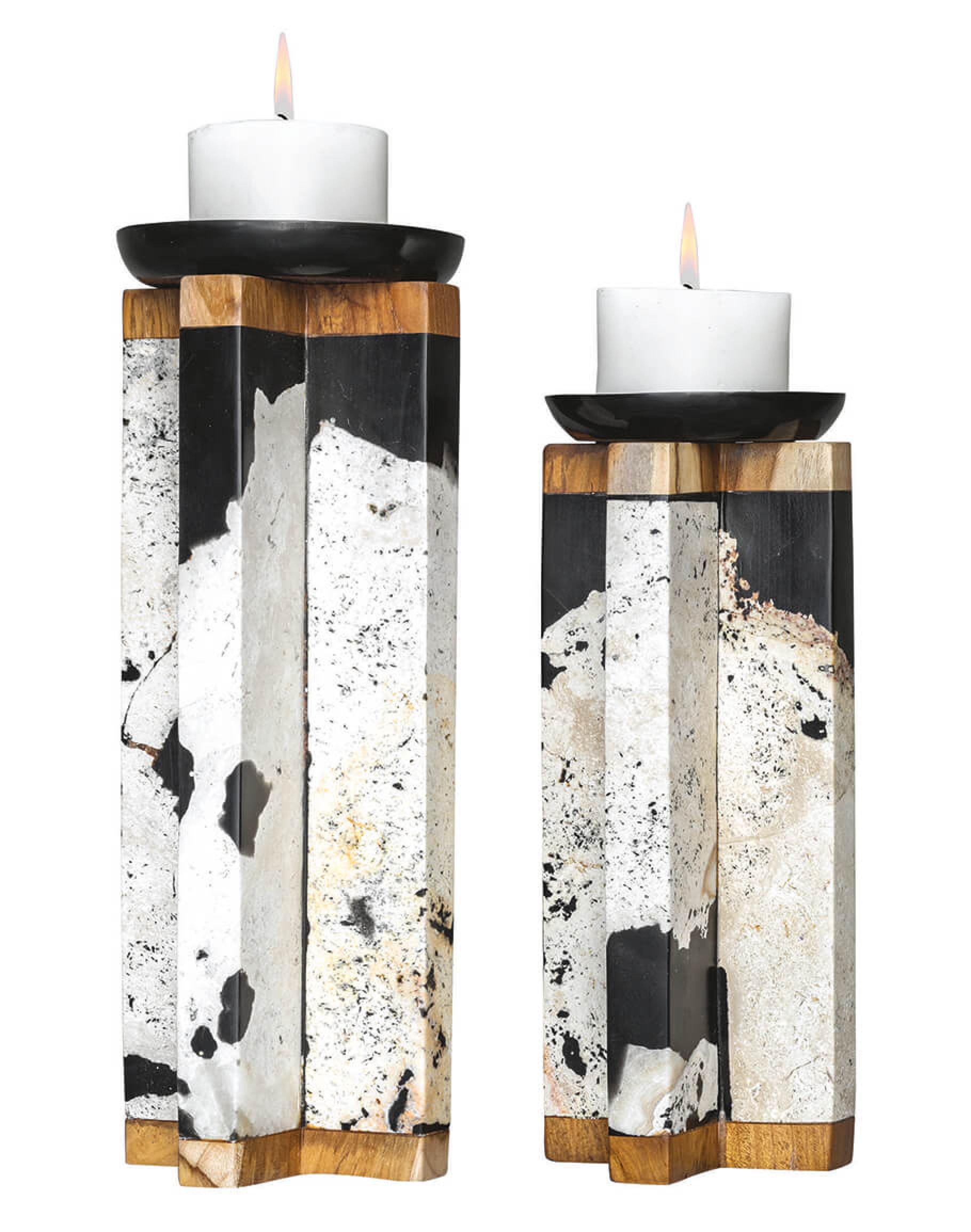 Set of two candleholders feature natural coral stone bases with teak wood and aged black accents. Two, 3"x3" white candles included.