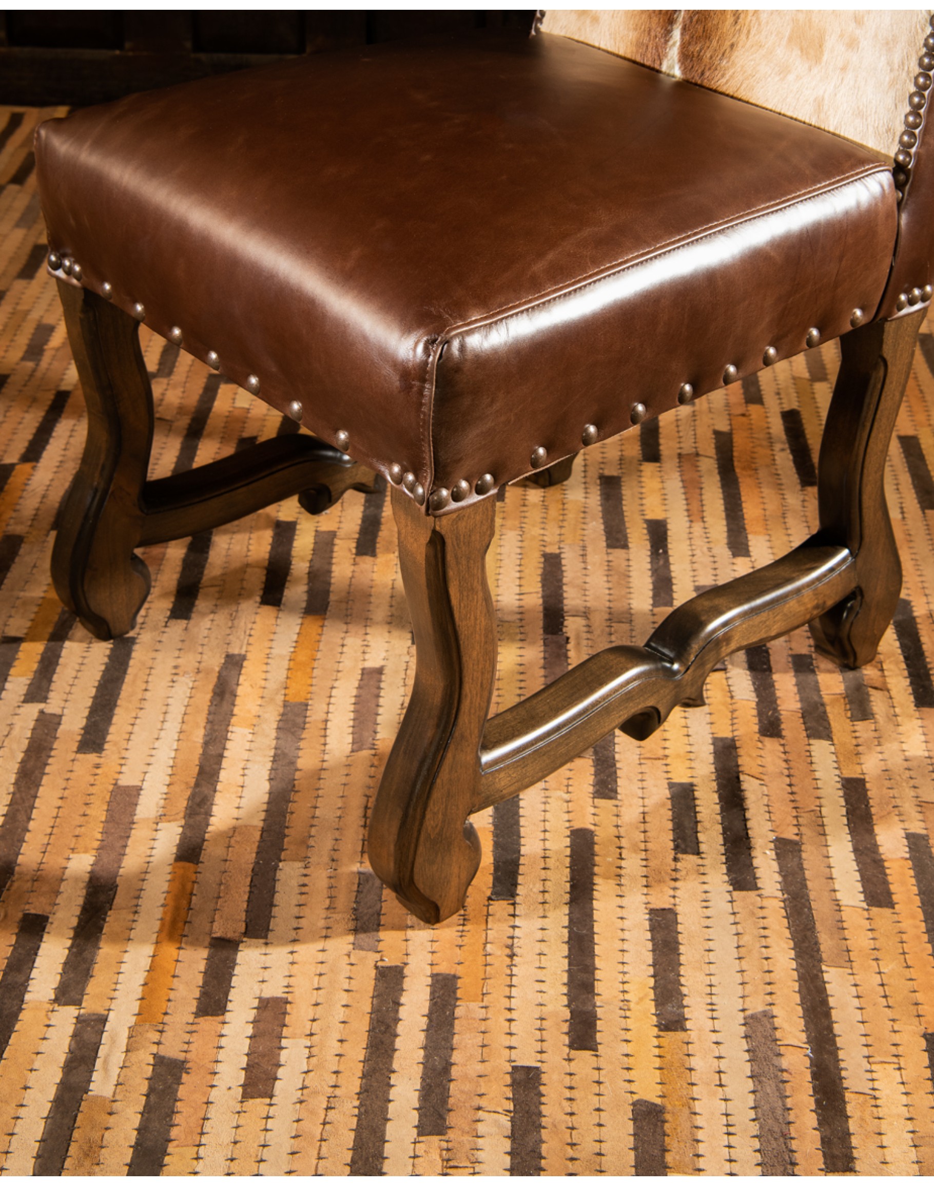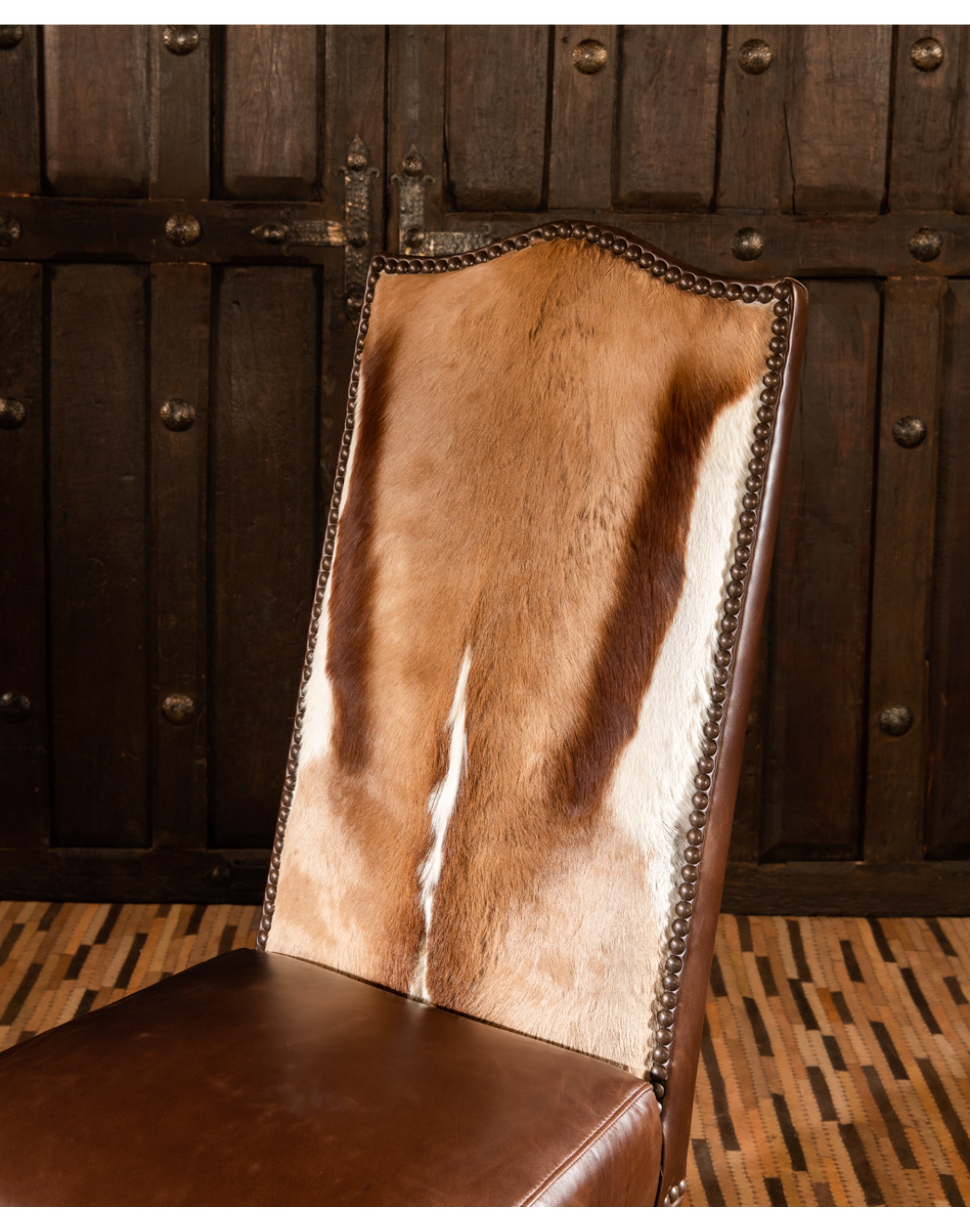 Introducing the Impala Dining Chair - a stunning piece of furniture that embodies the beauty of hand-crafted design. Made in the USA using only the finest materials, this dining chair features 100% top-grain leather and genuine springbuck hide on the inside back, adding both comfort and style. The solid hardwood frame and premium high-density foam cushion cores make for a sturdy and durable chair, perfect for any dining room. Plus, the natural variations in each springbuck hide mean that each Impala Dining Chair is truly one-of-a-kind. Experience the charm and elegance of this rustic yet sophisticated piece in your home today.