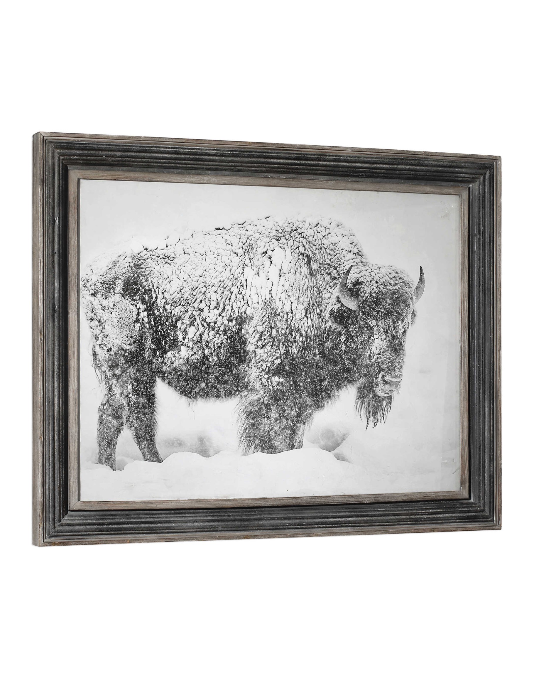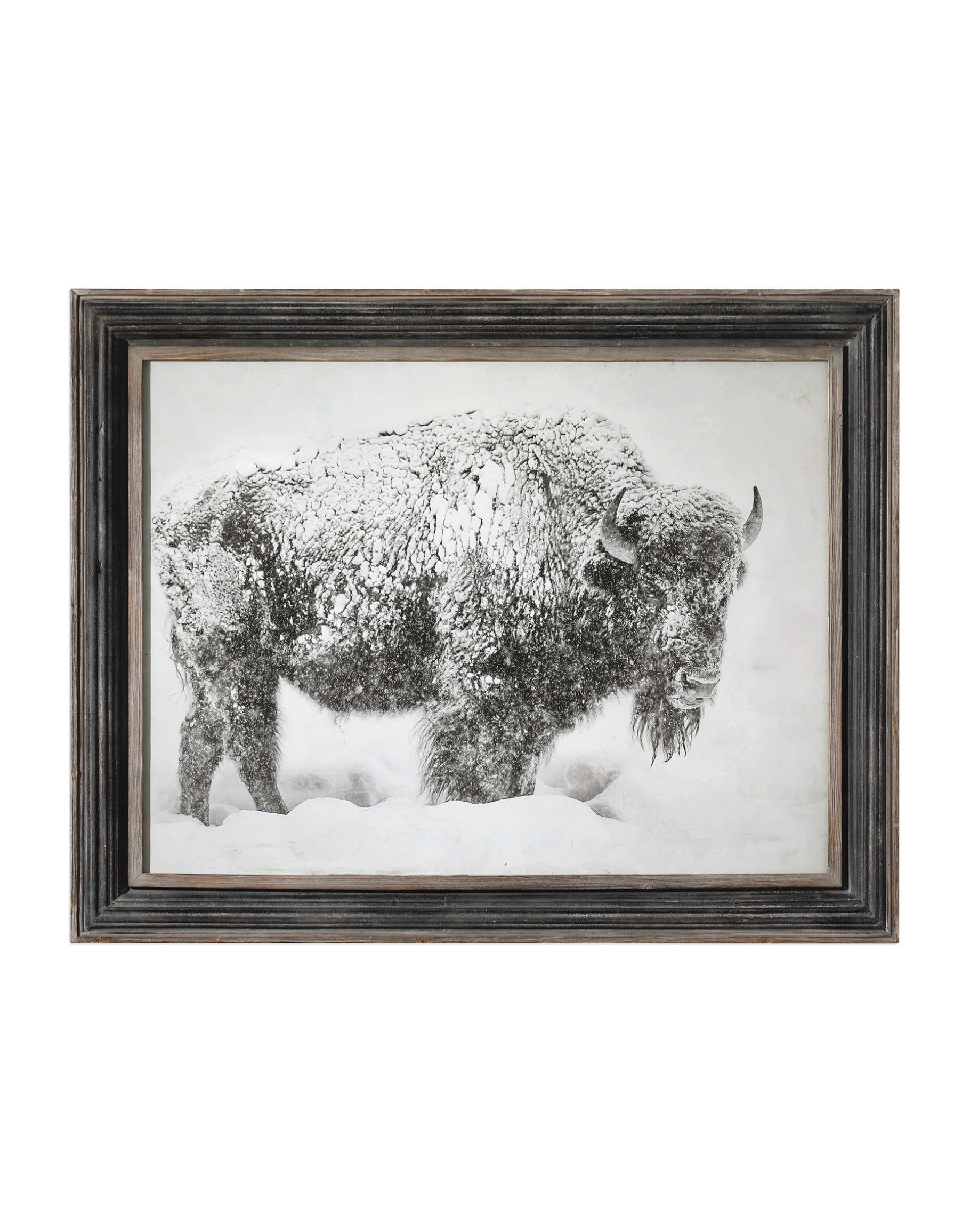 Rustic charm is added to a design with this black and white printed photograph. The transitional animal print is surrounded by a distressed wood and m..