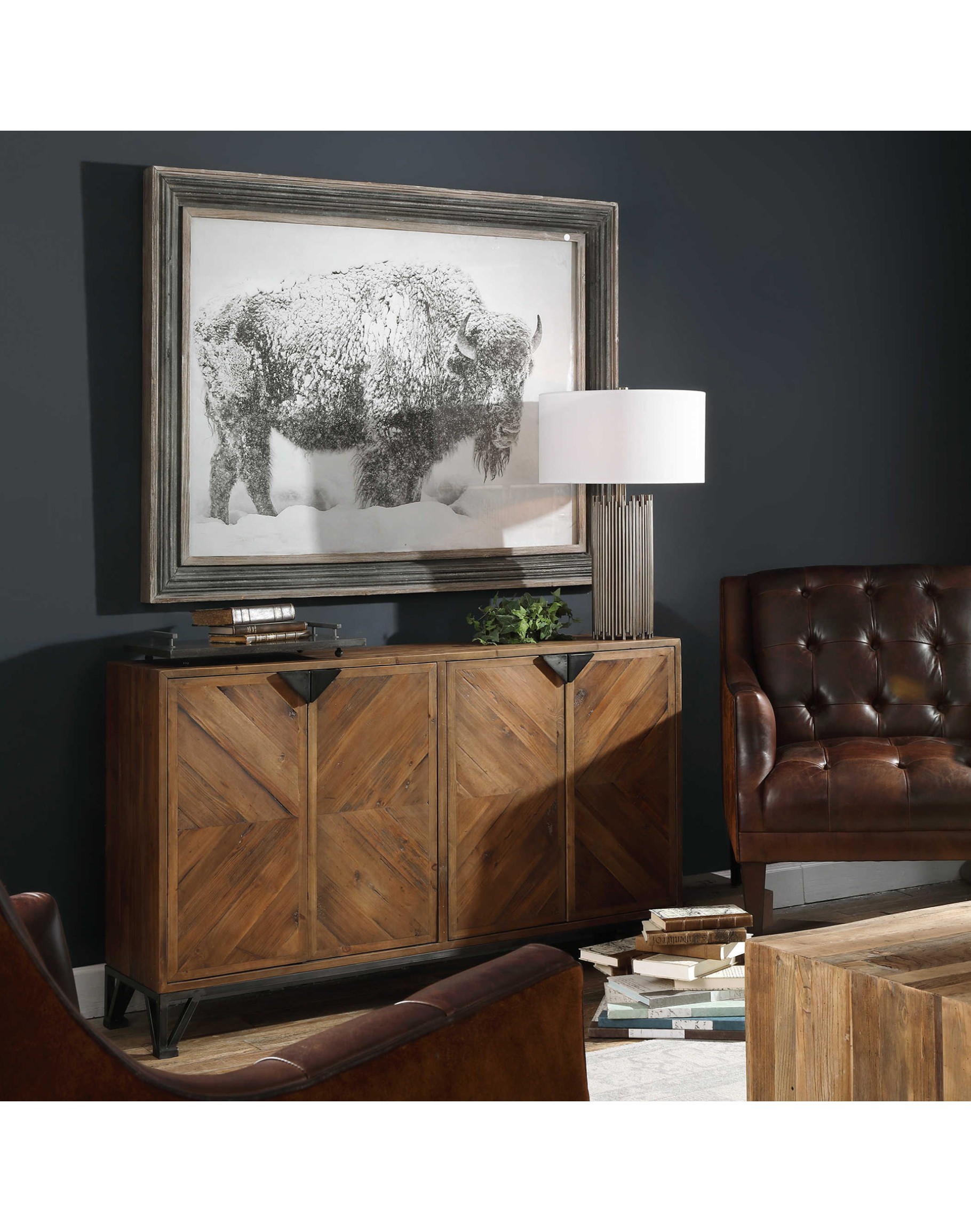 Looking for a modern rustic piece of art to add to your lodge-inspired decor? This striking bison print features a monochromatic black and white color scheme, perfect for a traditional, masculine look. The artwork comes beautifully framed in rustic wood and corrugated metal with a distressed black finish and gray wash, adding a touch of modernity to its overall design. Protected by glass, this print is both stylish and practical. Order now and bring a touch of the wild into your modern rustic home.
