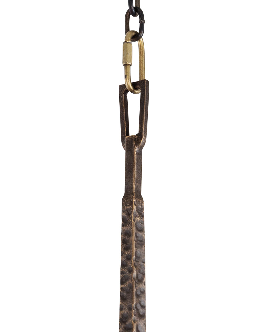 The Iron Spur Linear Chandelier brings sculptural ironwork and warm Western character to any room. The frame is finished in a rich bronze iron tone with hand-rubbed antique gold highlights that catch the light on every hammered facet. Each arm showcases a deeply textured spur-like edge, while tall tapered square candle cups rise in a stepped profile, topped with matte espresso candle sleeves and exposed candelabra bulbs for a timeless flame-tip silhouette.