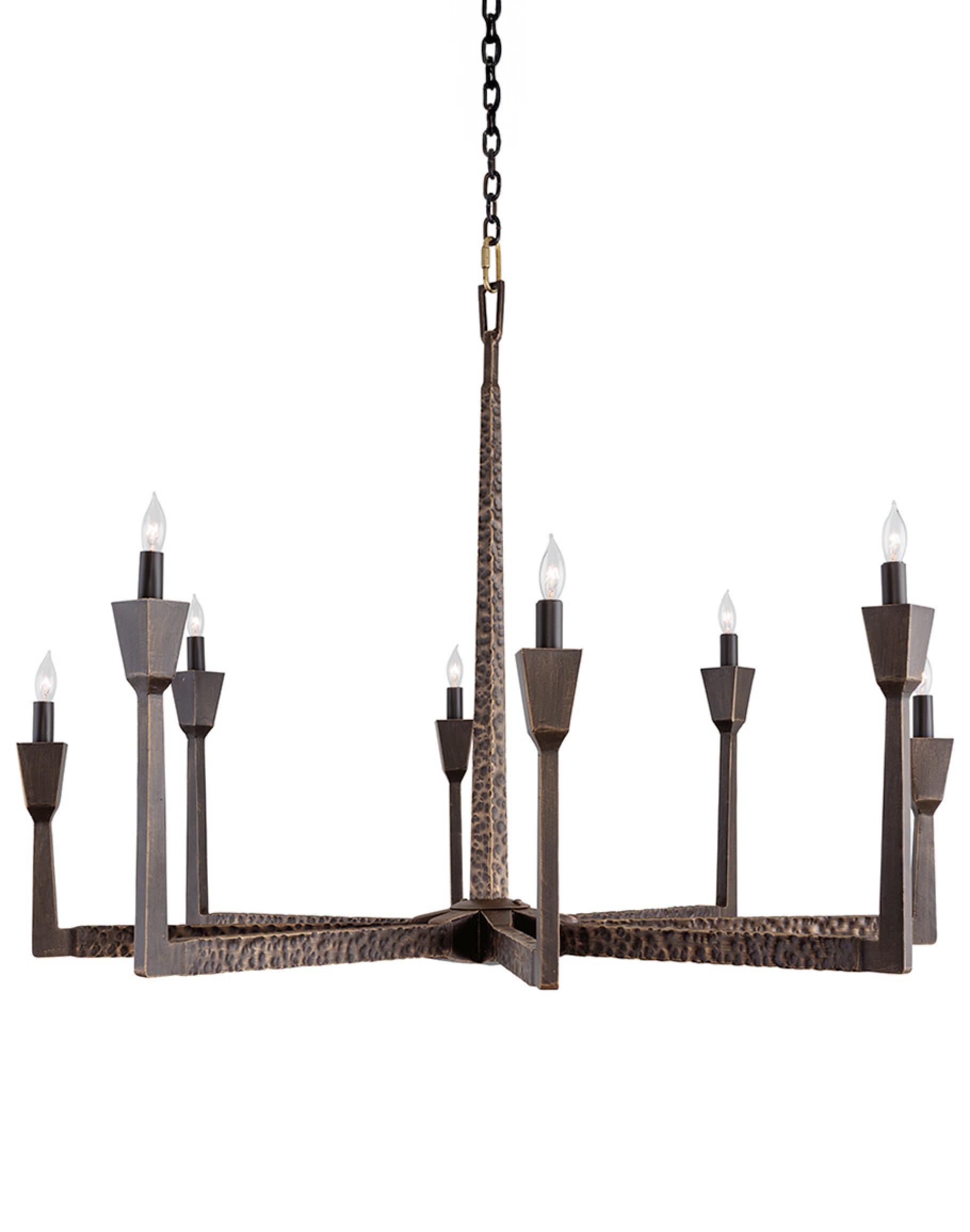 The Iron Spur Linear Chandelier brings sculptural ironwork and warm Western character to any room. The frame is finished in a rich bronze iron tone with hand-rubbed antique gold highlights that catch the light on every hammered facet. Each arm showcases a deeply textured spur-like edge, while tall tapered square candle cups rise in a stepped profile, topped with matte espresso candle sleeves and exposed candelabra bulbs for a timeless flame-tip silhouette.