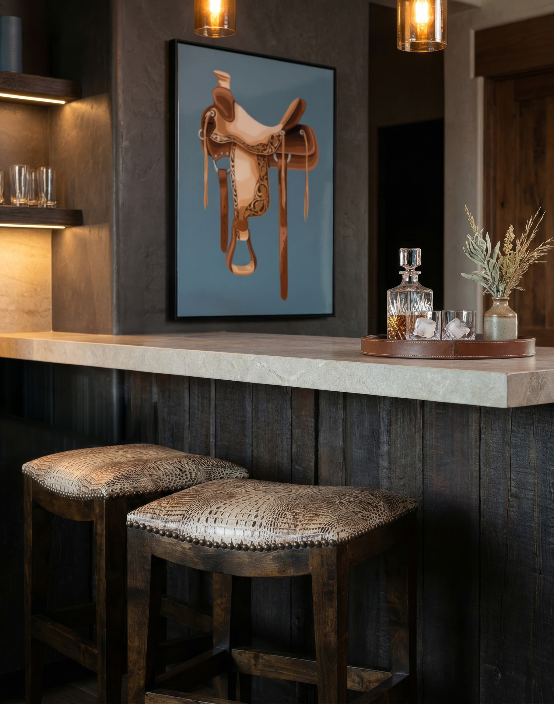 Add a touch of rustic elegance and timeless beauty to your home with our Ivory Croc Saddle Stool. Cleaned-lined and rustic appeal give this stool the perfect balance to be pulled up to kitchen islands, breakfast bars, and pub tables. This saddle stool is available in both bar and counter height, meaning you can use it to elevate any space! 100% top grain embossed leather features a two toned colored croc design that encompasses a premium high-density foam cushion, complimented by a row of consecutively placed brass nail heads, while a solid Knotty Alder hardwood frame features a foot rest below for comfort and support. Additionally, the backless saddle seat easily conceals itself beneath counters and bar tops to save space. If your bar or kitchen area is in need of a superior statement piece guaranteed to bring comfort and style, look no further than the luxurious Ivory Croc Saddle Stool. 100% American Made!