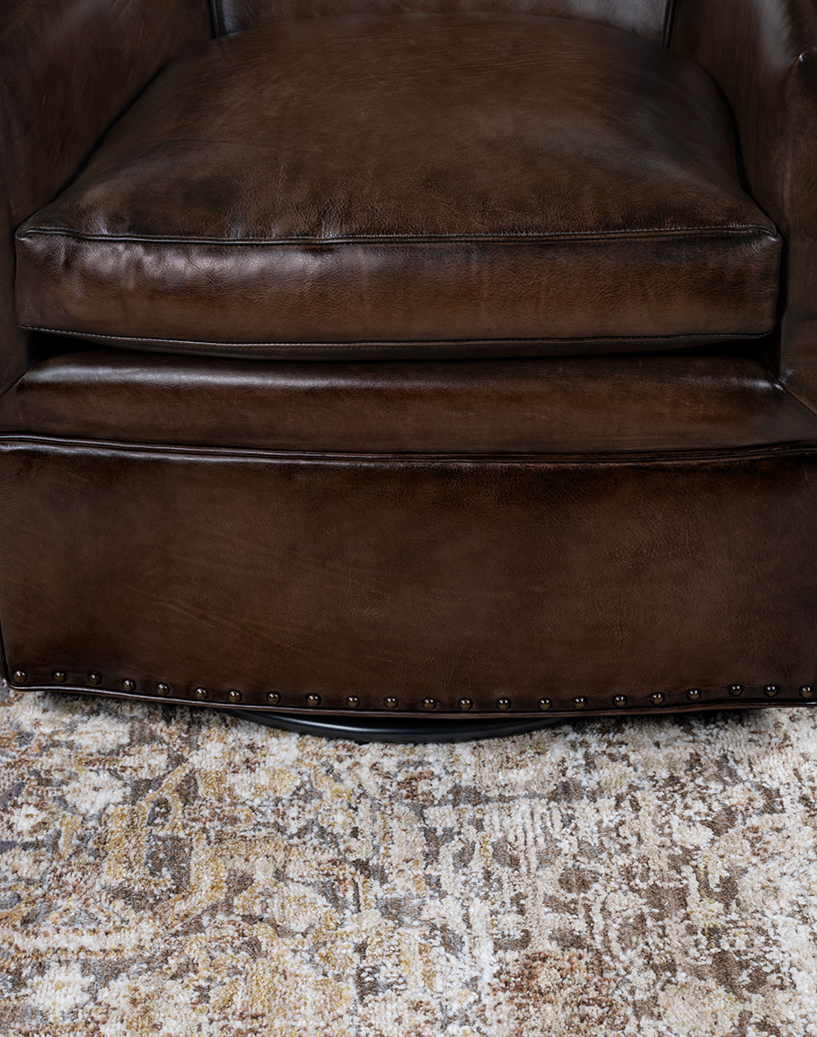 The Jackson Smoke Leather Swivel Chair is a tailored, designer-forward accent chair that brings elevated comfort and a clean, architectural silhouette to any living room, office, or reading nook. 100% American made to the highest standards of quality and craftsmanship, Jackson is built with the kind of precision you can see in every seam—crisp tailoring, tight upholstery lines, and a perfectly balanced profile that looks substantial without feeling bulky.