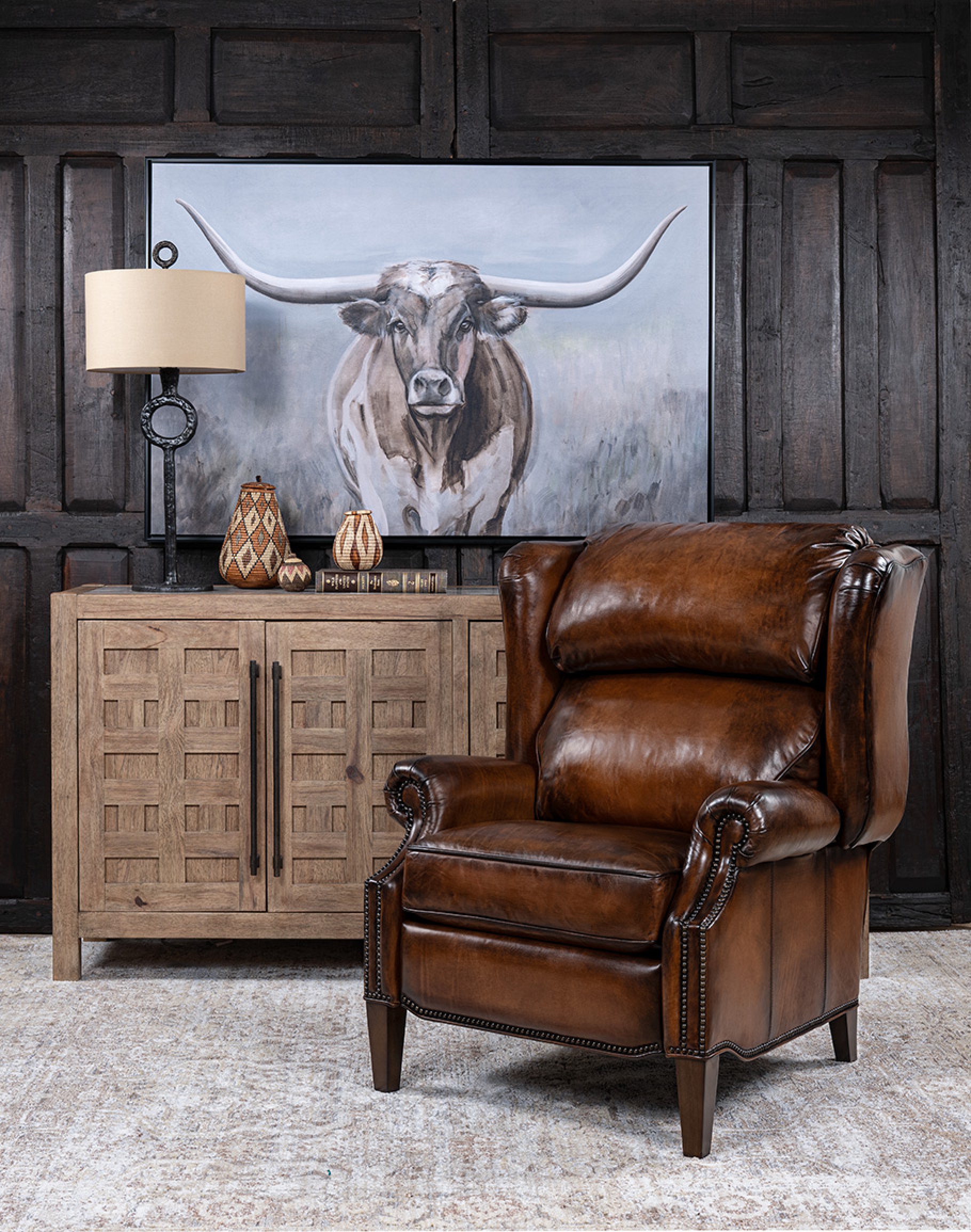 Discover the height of luxury and comfort with the Revolver Bourbon Leather Recliner. Crafted in the USA, this recliner embodies elevated ranch living..