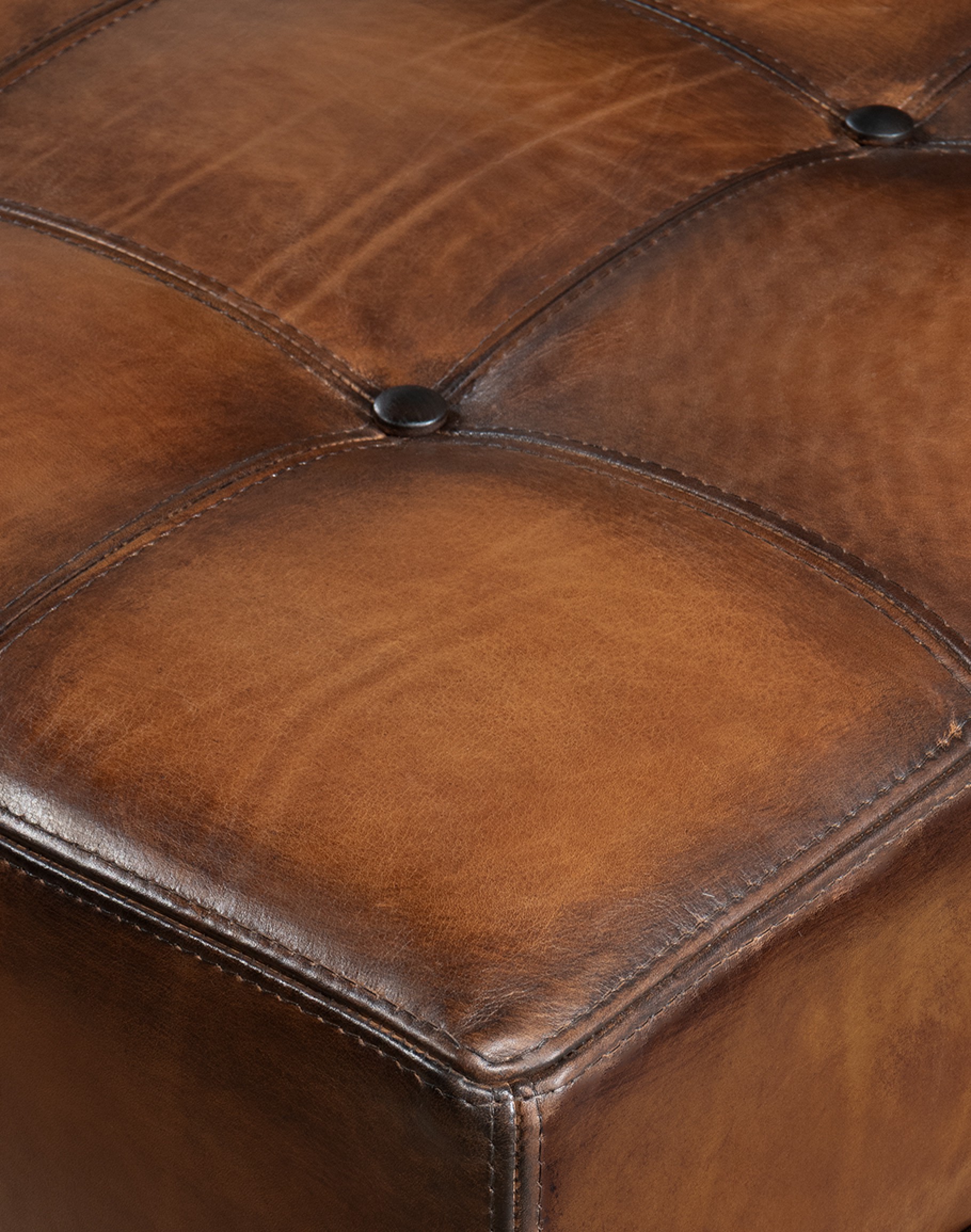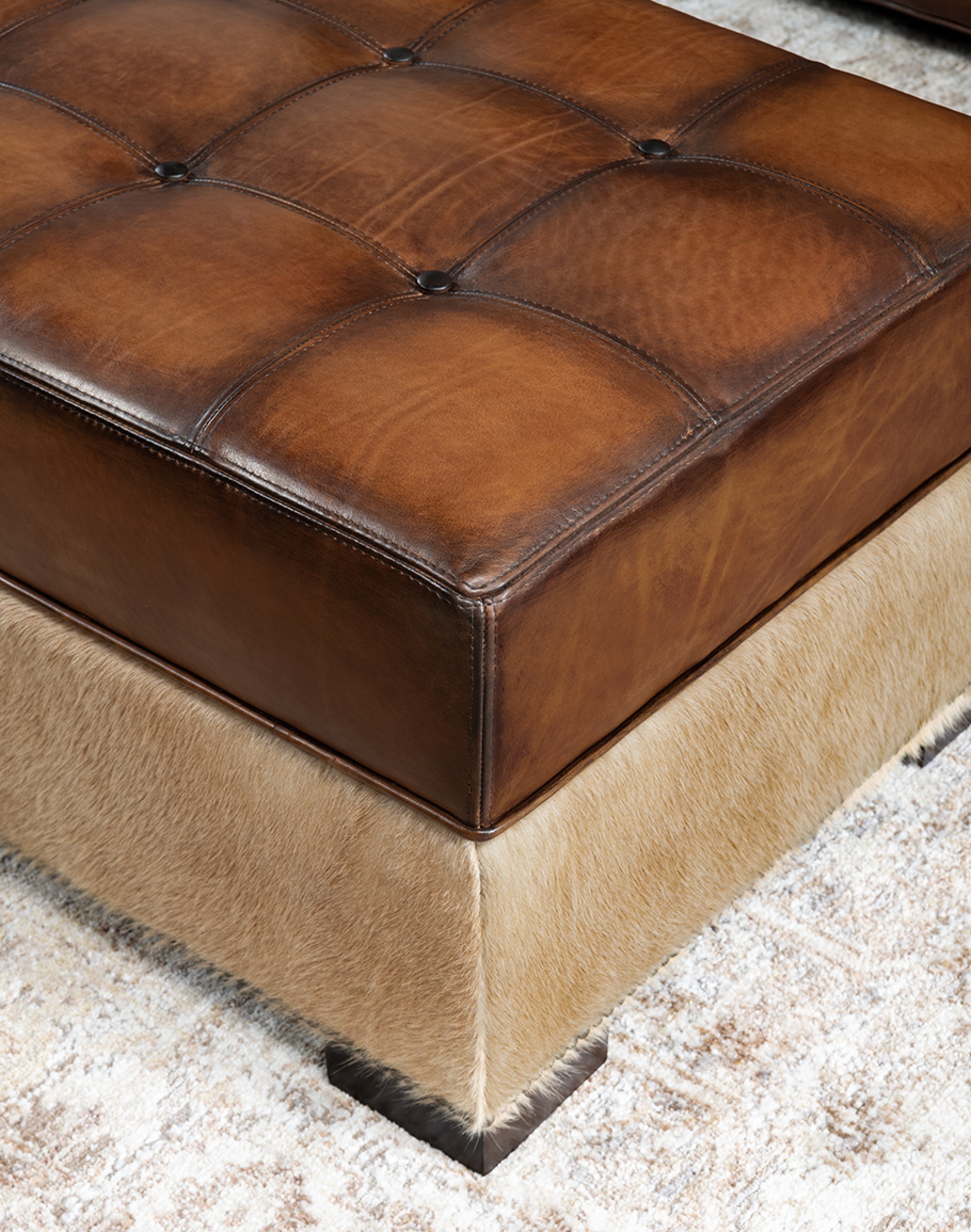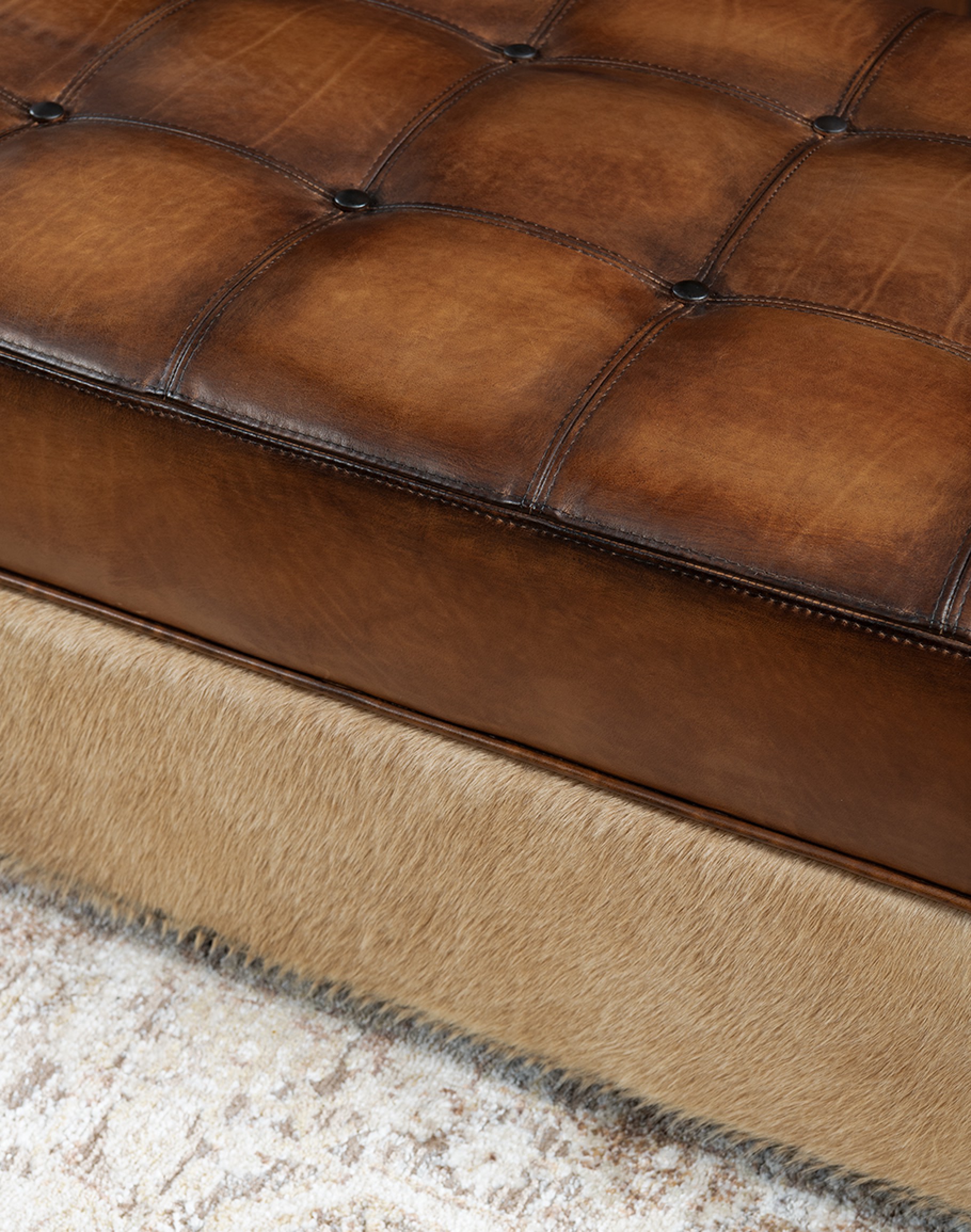 Crafted with a solid hardwood frame, the Jericho Ottoman ensures durability and longevity. Its full-grain leather top is hand-burnished, showcasing natural variations and rich depth in color, while tufted detailing adds a timeless sophistication. A natural blonde cowhide band wraps around the base, offering a striking contrast in texture, further accentuated by small brass nailhead trim along the bottom edge.