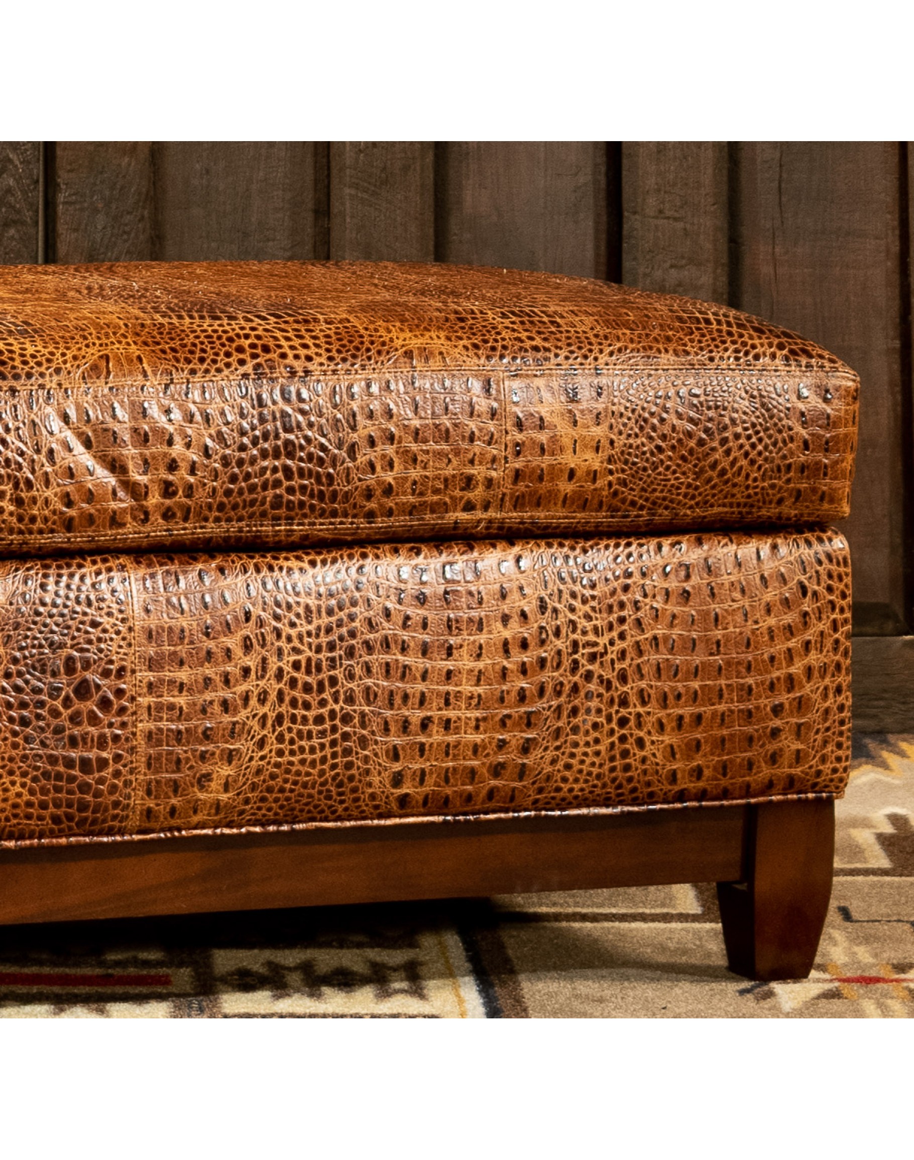 A wonderful leather top ottoman to rest your feet on or sit. featured in rich saddle color leather with an embossed croc pattern. A high density foam cushioning for lasting durability and comfort, 100% American Made.