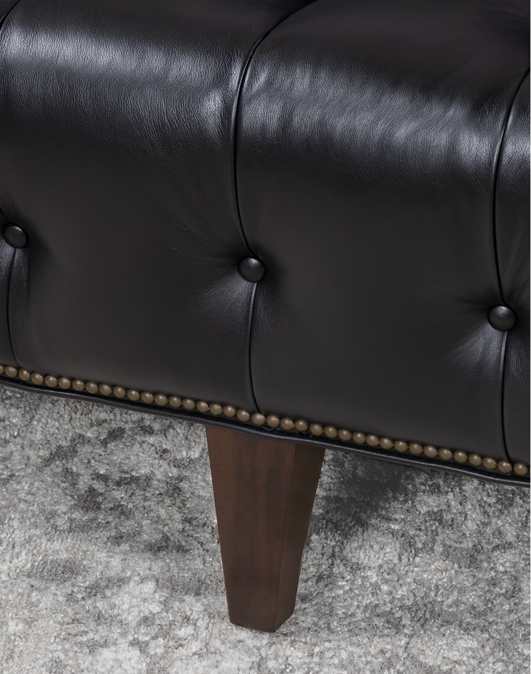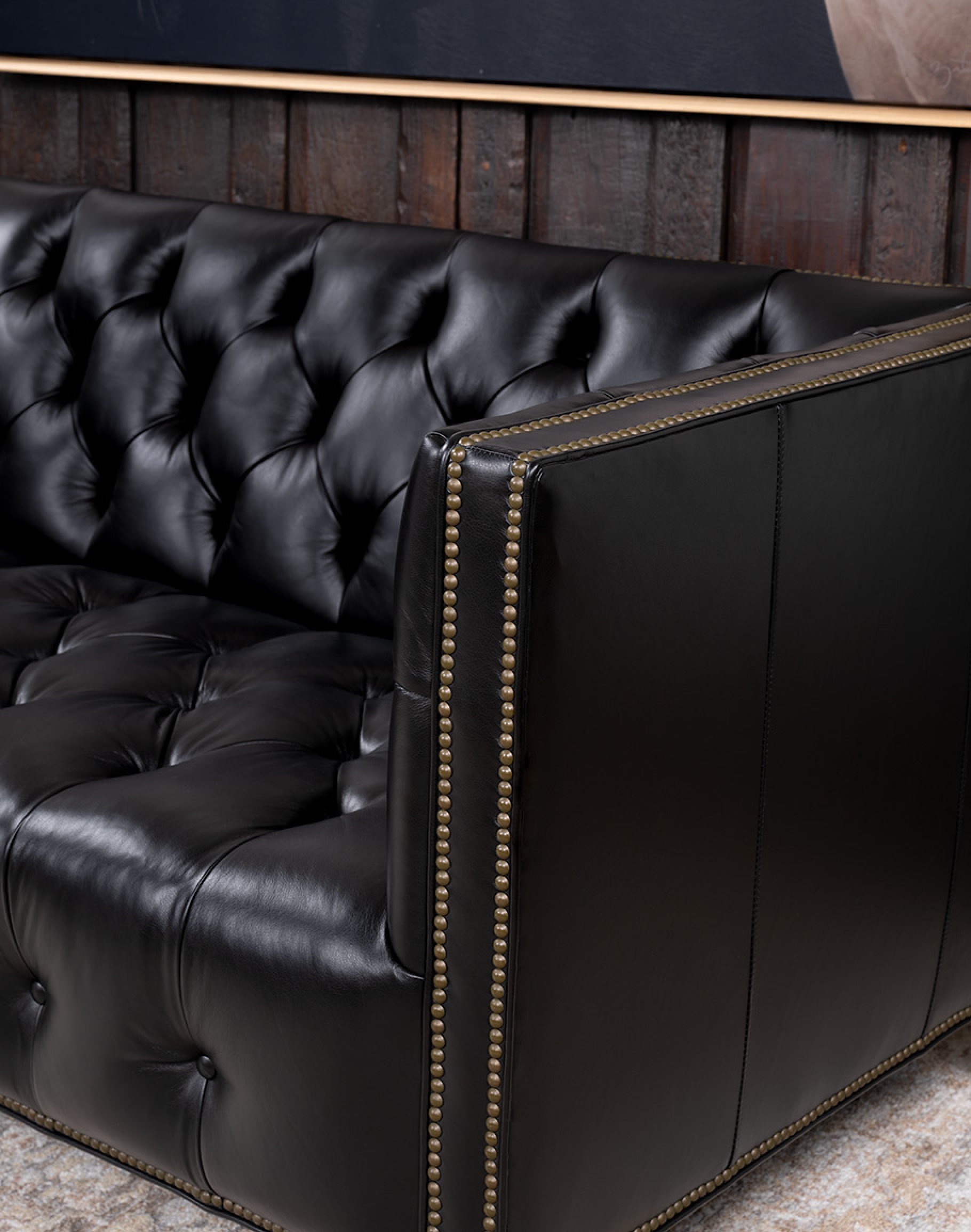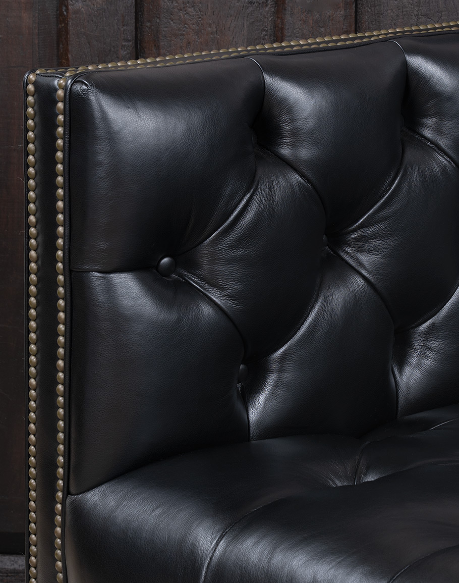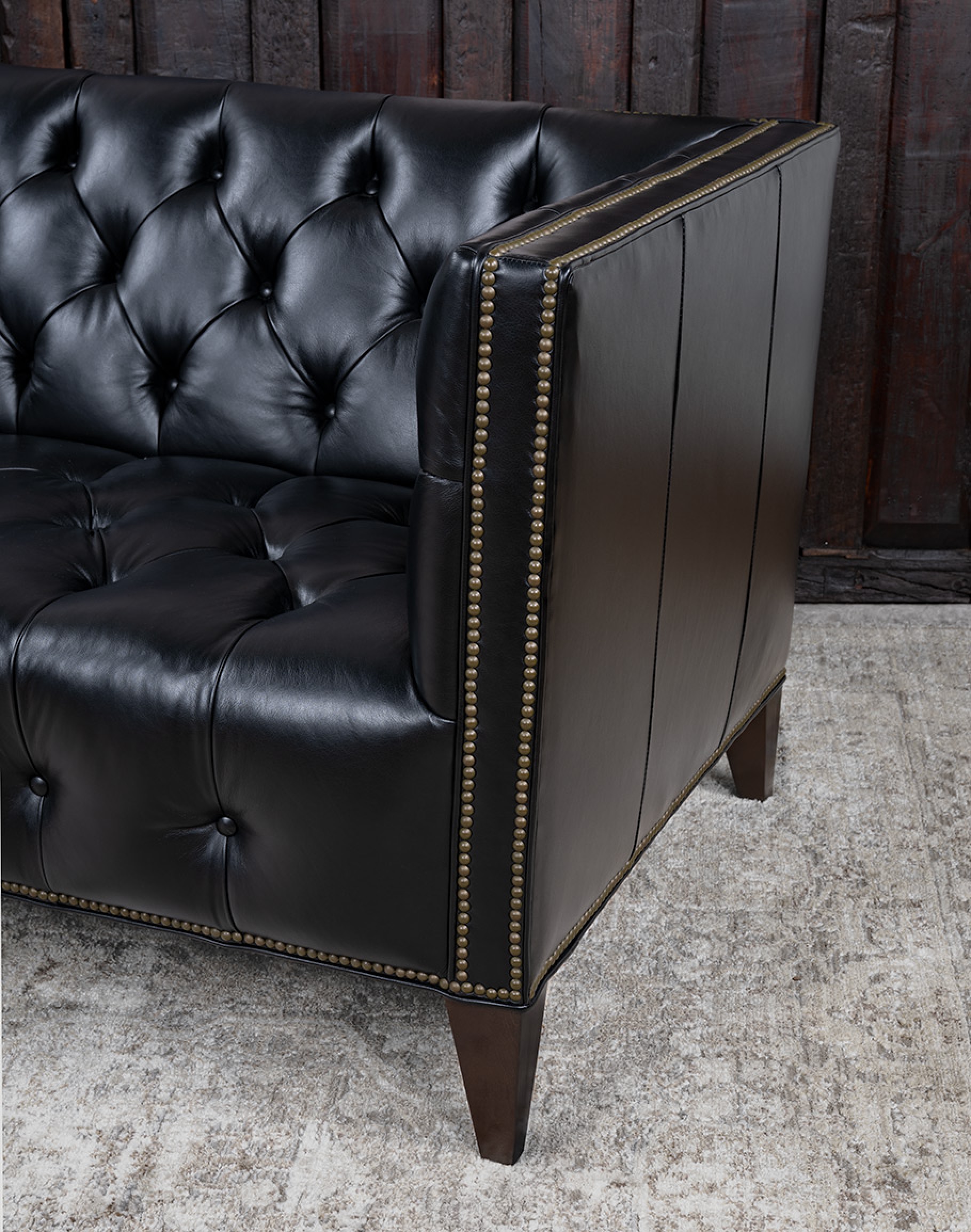 The hand-tufted seat, back, and arms create a sculptural presence, with deep button tufting that adds both visual interest and enduring comfort. High, squared arms and a tight back lend a modern silhouette, while antique brass nailhead trim frames the edges in meticulous detail. This blend of classic tufting and tailored lines gives the Kingston versatility—anchoring everything from a contemporary urban loft to a traditional Western ranch home.