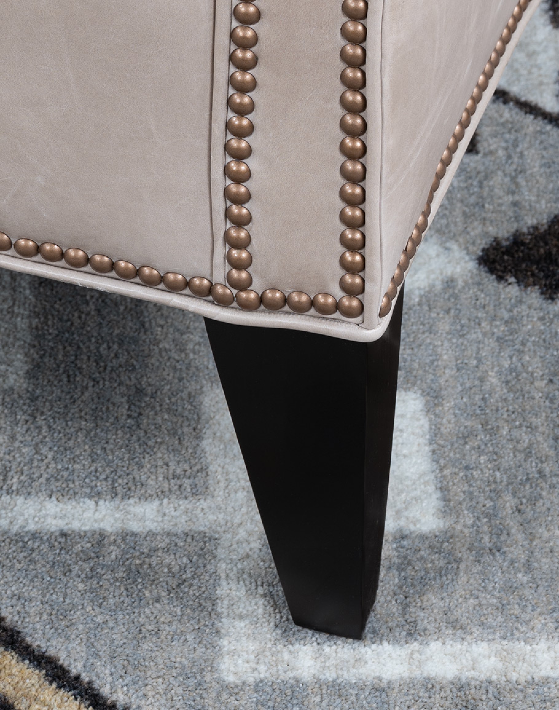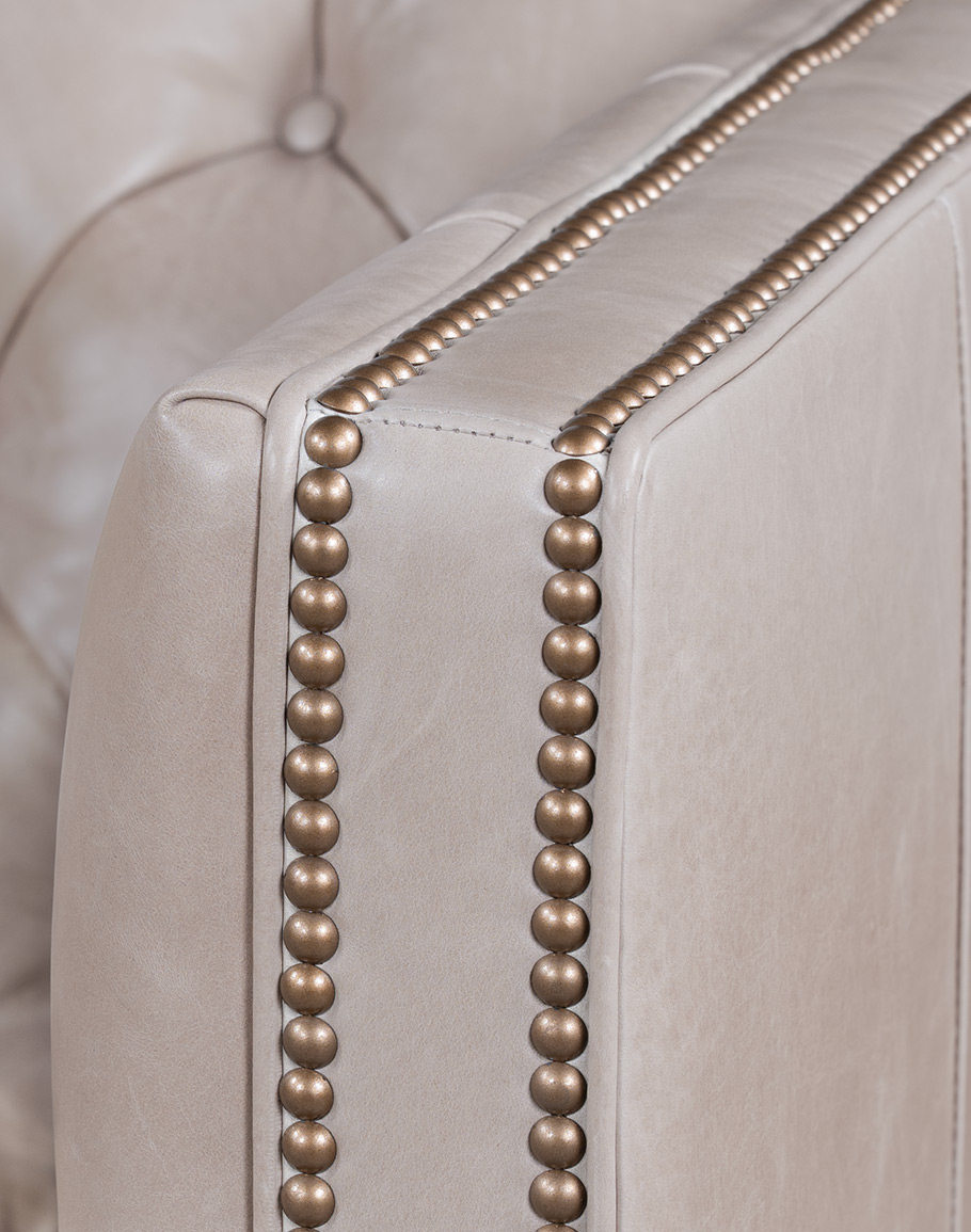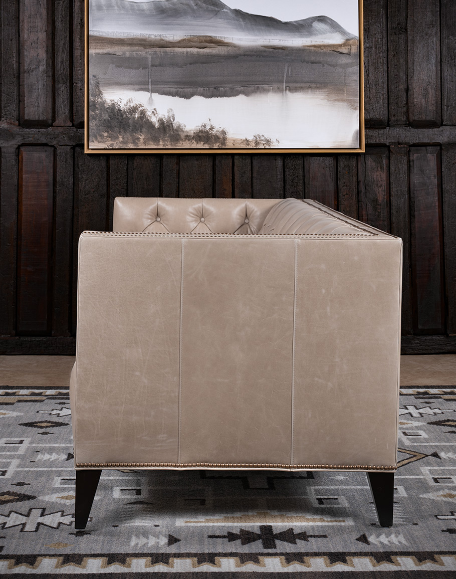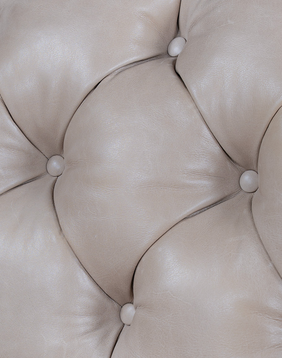 Upholstered in a sophisticated warm ivory leather—best described as a soft ivory with subtle taupe,stone, and parchment undertones—this sofa reads beautifully in every light. In brighter spaces it feels clean and airy like bone, while in moodier rooms it warms into an oatmeal-beige with a gentle natural sheen. The leather’s nuanced character highlights organic variations and will develop a rich, lived-in patina over time—adding depth without sacrificing elegance. True to Chesterfield heritage, the Kingston features deep, all-over tufting that wraps the entire seating envelope—tufted all the way around across the seat, back, and arms—for a sculptural, diamond-tufted presence that looks custom and couture. The high, squared track arms and tight back create a sleek, tailored profile, while the generous tufted bench-style seat delivers a plush yet structured sit that holds its shape with polish.