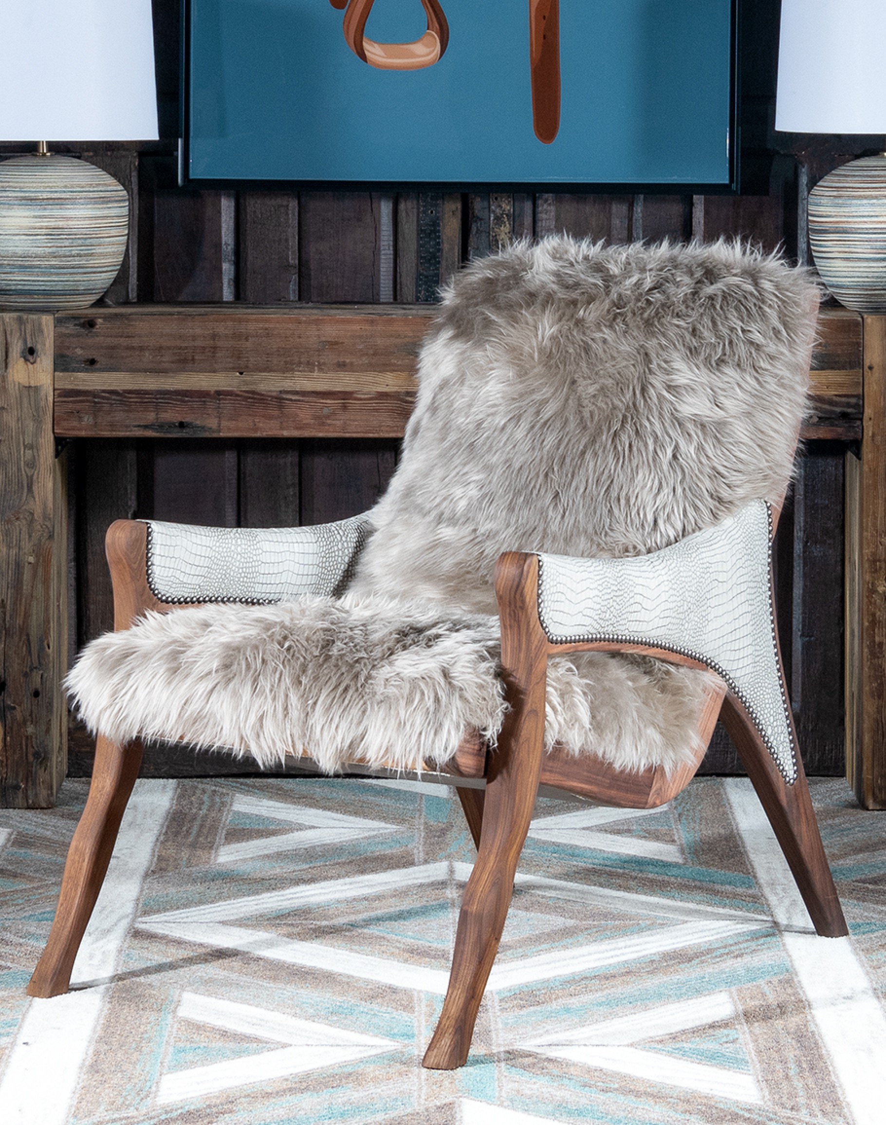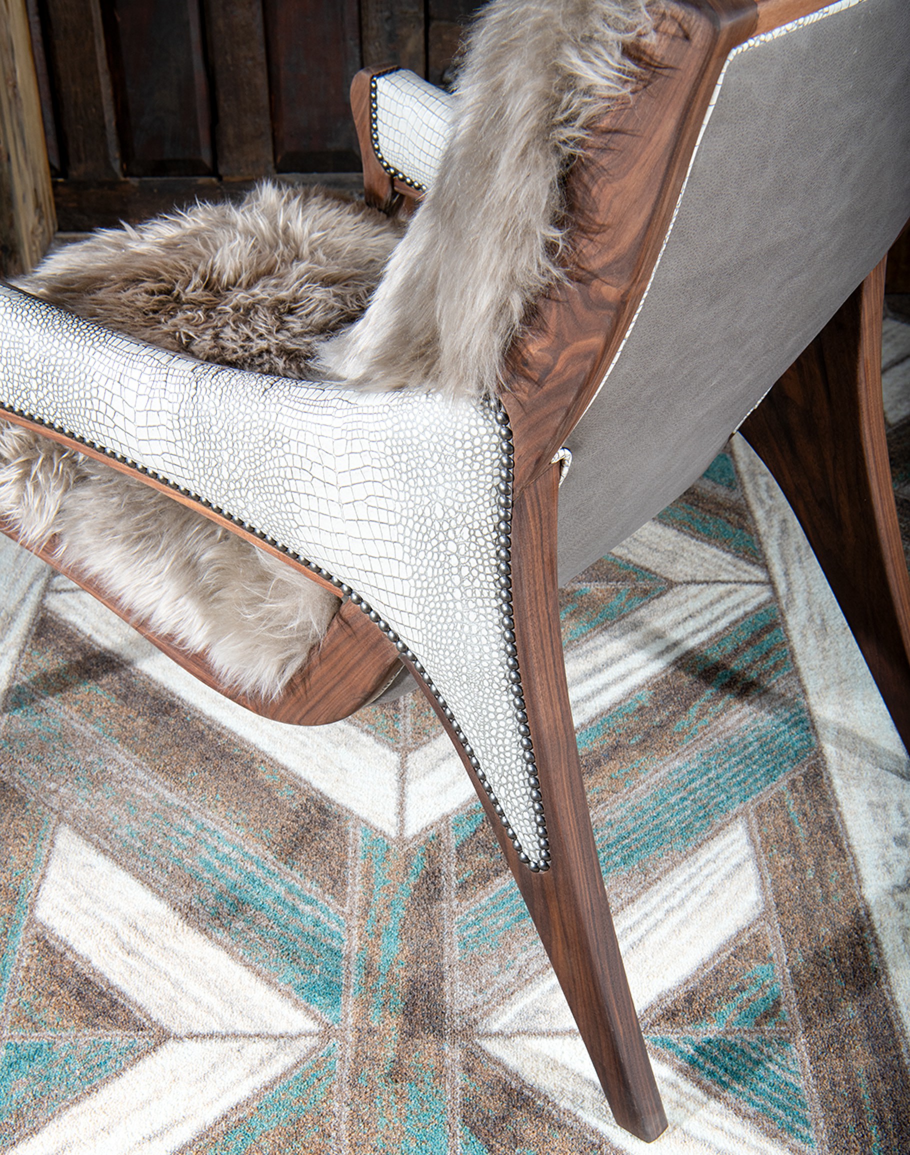 Crafted with impeccable precision and passion, our Kodiak Arm Chair is a testament to American craftsmanship and quality. This 100% American-made marvel stands out in any room, embodying the essence of mountain modern style with its luxurious and distinctive design. Our Kodiak Arm Chair boasts a solid black walnut frame, treated with an oil-rubbed finish to enhance its natural beauty and durability. Its arms are adorned with stamped leather featuring an exquisite crocodile pattern, adding a touch of rugged elegance to its sleek profile.