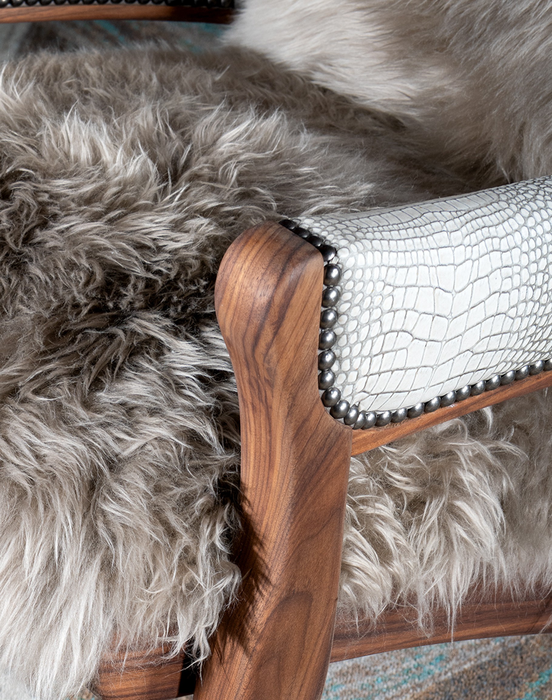 The seat and back cushions are nothing short of lavish, upholstered in genuine Angora hair, known for its incredible softness and comfort. This exquisite material selection ensures that the Kodiak Arm Chair isn't just a piece of furniture, but a sanctuary of comfort and style. Adding to its refined aesthetics are nickel nail heads meticulously applied along the arms, showcasing an attention to detail that makes this chair a true masterpiece.