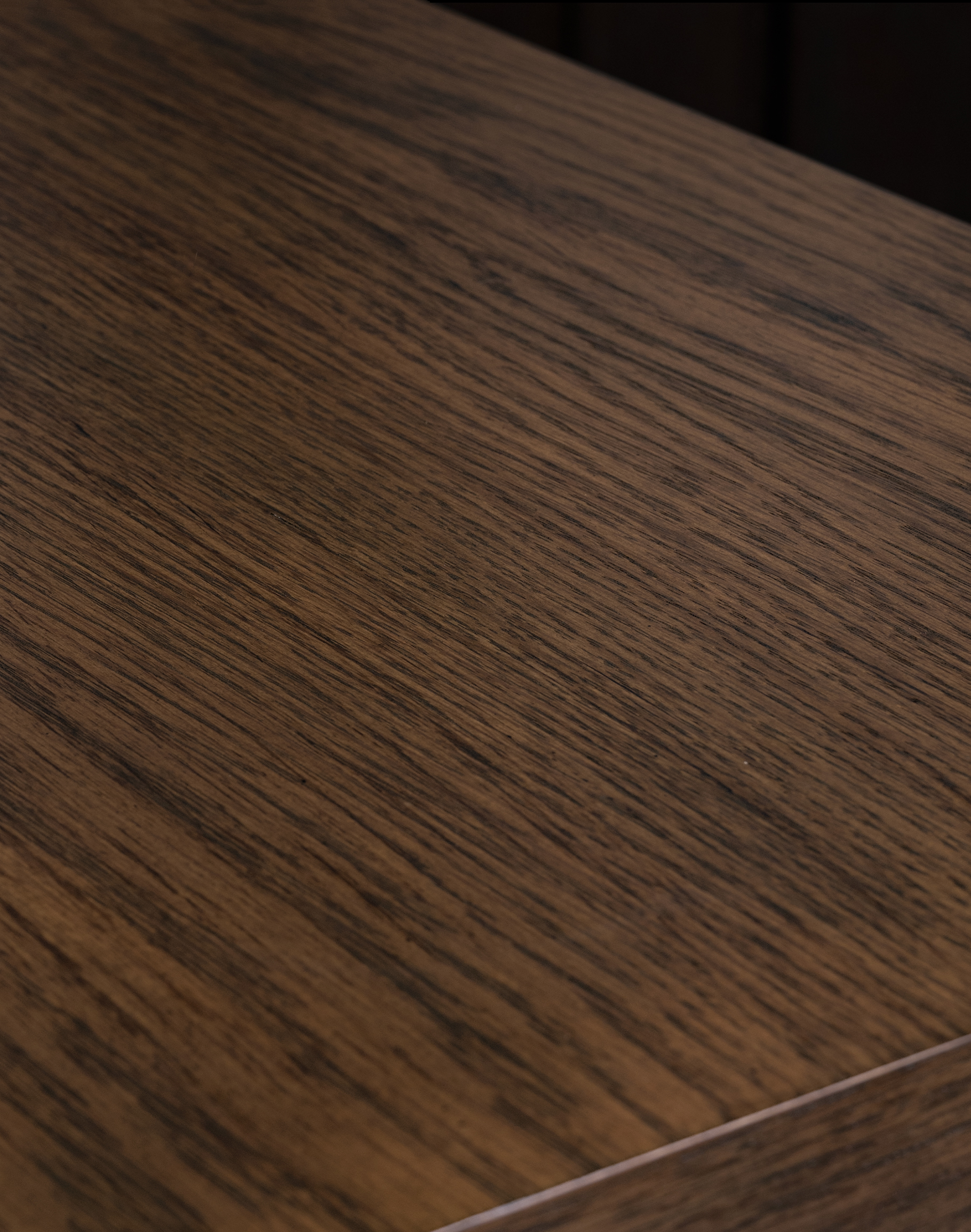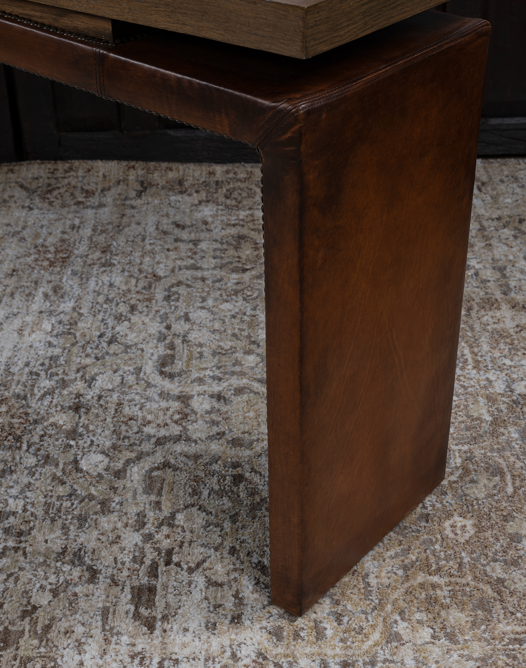 This luxury console features a fully leather-wrapped waterfall base upholstered in premium full-grain leather saddle brown / chestnut tone. The leather is hand-finished to highlight natural grain variation and subtle burnishing, creating a warm, lived-in character that will continue to patina beautifully over time.