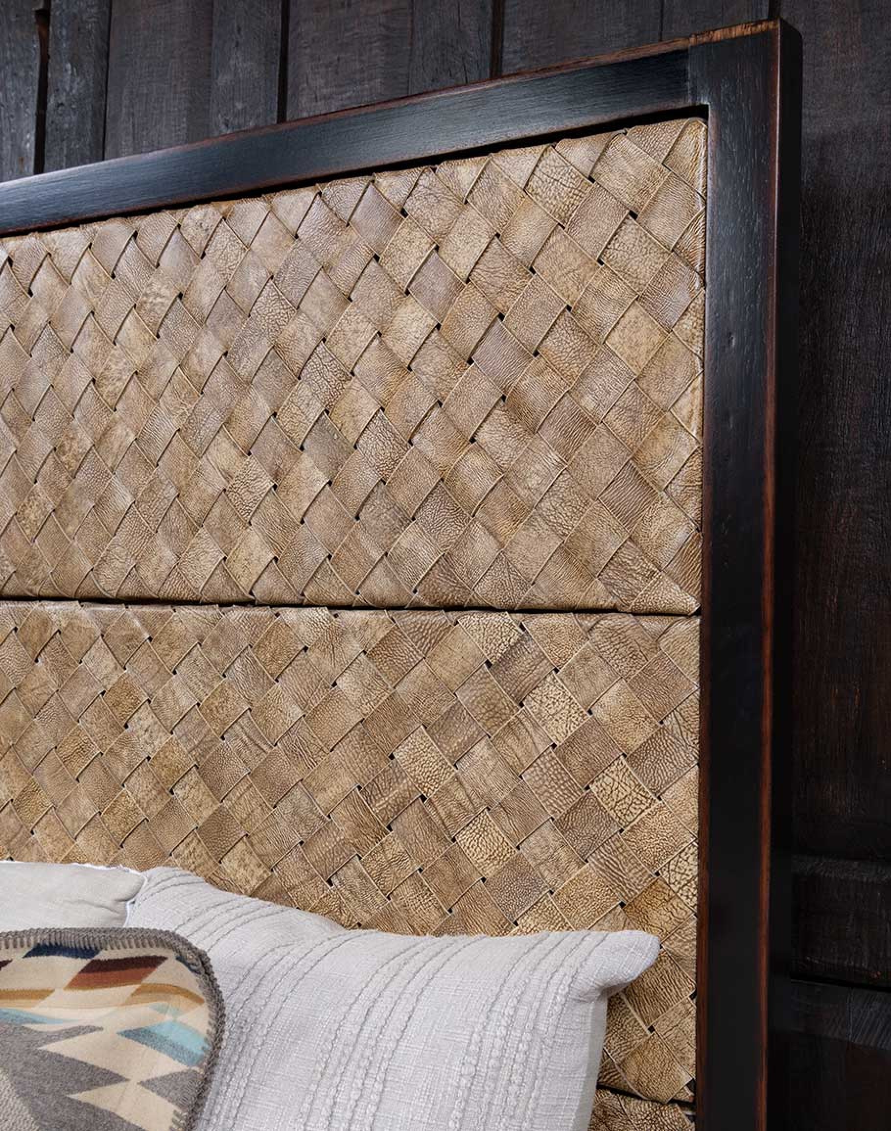 Transform your bedroom into a sanctuary of Southwestern elegance with the Llano Sands Leather Bed. Expertly handcrafted from solid wood and upholstered in thick, full-grain saddle leather, this bed is a testament to timeless craftsmanship and luxurious design. The intricate woven leather headboard, presented in a light palomino tone, exudes natural warmth and texture, making it a perfect centerpiece for any interior.