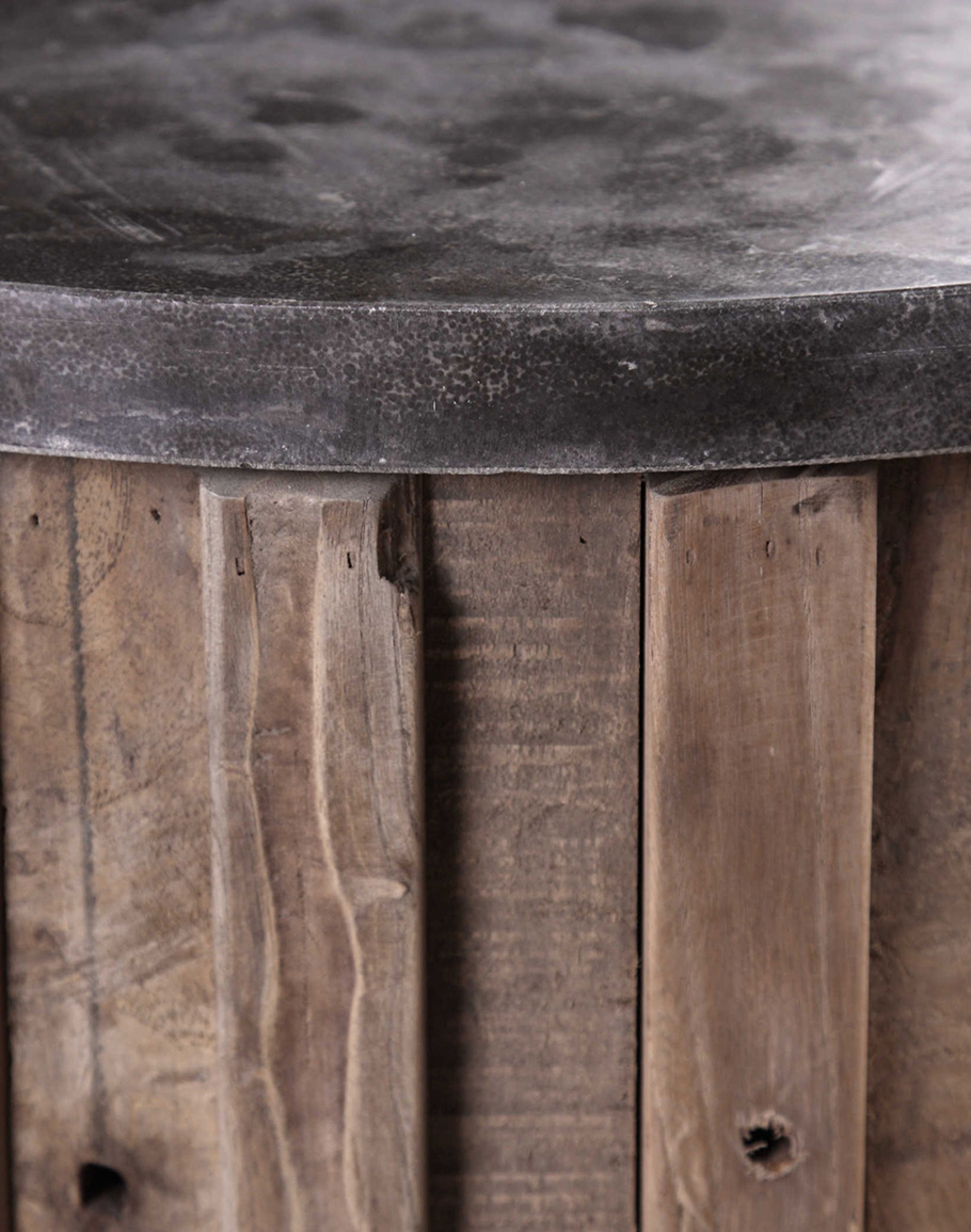 Trimmed in alternating slats of raised recycled elm wood, featuring a solid waxed bluestone top with natural characteristics of white marbling and veining throughout. Solid wood will continue to move with temperature and humidity changes, which can result in small cracks and uneven surfaces, adding to its authenticity and character.