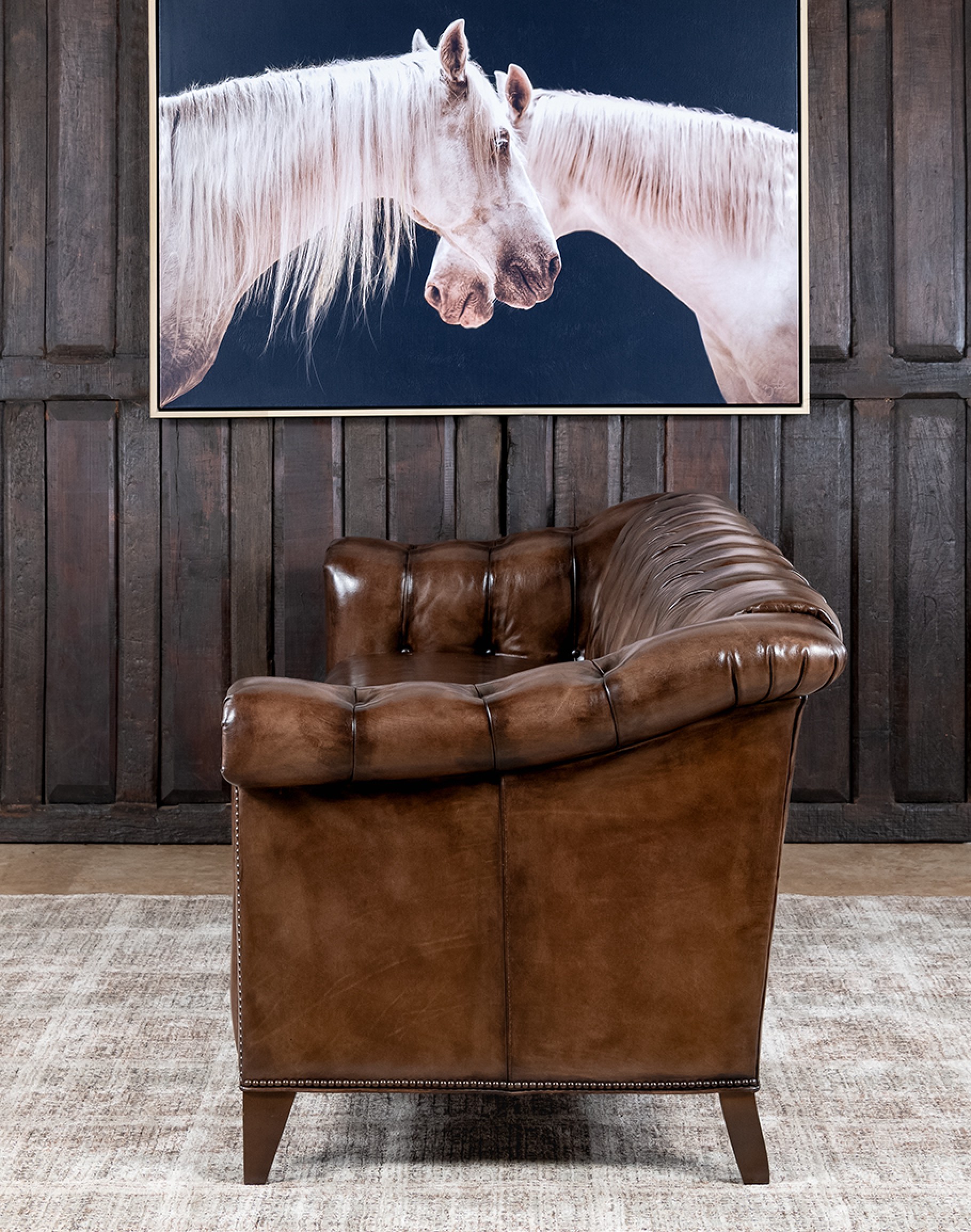 Brass nail tacks and leather welting enhance the sofa’s luxurious appeal, showcasing meticulous attention to detail. This stunning piece is a part of Adobe Interiors' Refined Ranch and Desert Ranch Collection, making it a versatile addition to various interior décor styles. The Lockwood Smoke Chesterfield Sofa is not just a piece of furniture; it’s a statement of style and elegance, perfect for those who appreciate the finer things in life. Experience the blend of classic design and modern craftsmanship with this exceptional sofa, and transform your living space into a haven of luxury and comfort.. At Adobe Interiors, we create the furniture, and you create the memories.