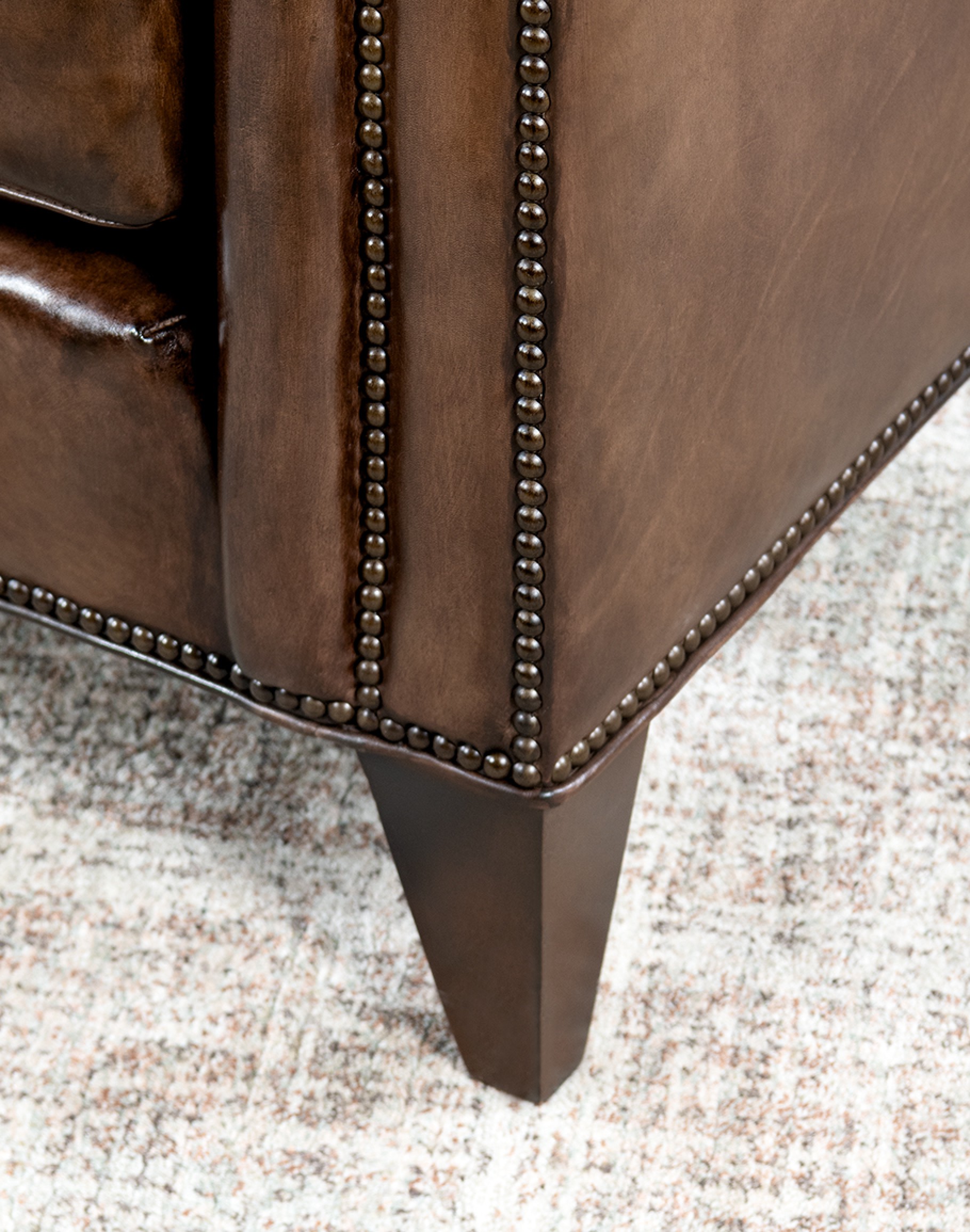 Leather Description:This is a full grain aniline leather tanned in a historic leather producing region of Italy using English hides. The century old tannery prepares this leather article by applying a hot wax, then turning the hides in old wooden tanning drums overnight to soften the natural fibers and impart it with a remarkable suppleness. The leather is then upholstered in its "crust form" on the furniture in North Carolina, After the furniture is made our leather artisans apply a multi step hand rubbed Patina using the same waxes and pigments used in Italy. Performing this process on the actual finished piece allows our artisans to develop a unique Patina, composition, and overall essence that creates a piece of furniture that has uniqueness, character and style that matches the individual who's selecting it. This leather imparts the feeling of a softer, well broken in leather one might find on a decades old chair discovered in a French country estate or the Parisian flea market. The leather is brand new from our Artisans hands... without the aging issues that sometimes come from the hands of time. Truly a unique, hand-made article in an era when only companies committed to the highest standards lavish this sort of attention and time to unique American made furniture.