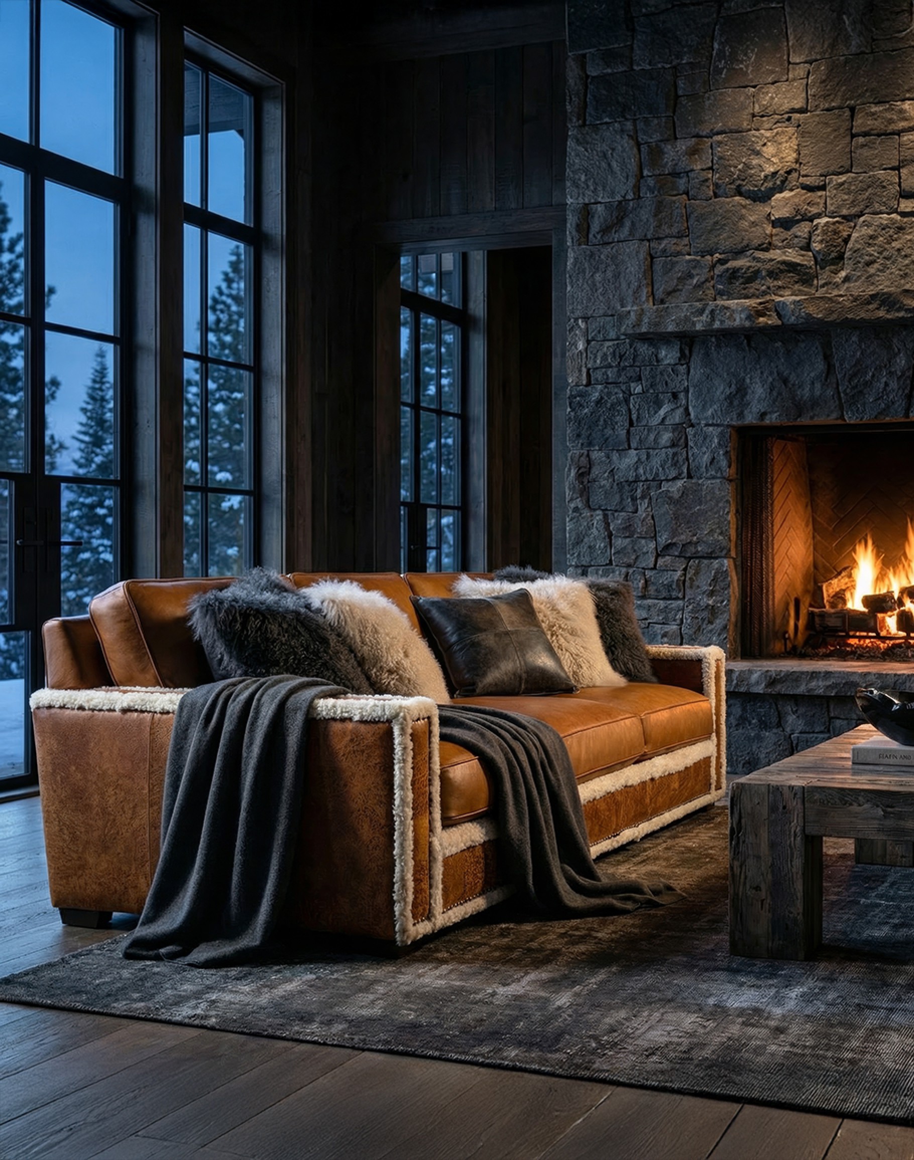 The Lodge Leather Sofa features a mountain ranch modern look. This timeless piece features hand-burnished, full-grain leather that achieves an aged patina, accented with heavily distressed vintage leather and a stunning New Zealand shearling trim. Ultra-plush cushions allow maximum comfort, while the hardwood frame ensures lasting durability. With its rugged looks and stylish design, the Lodge Leather Sofa makes it a top-of-the-line choice for any home. 100% American-made to the highest standards of quality and craftsmanship, it is an heirloom in the making. At Adobe Interiors, we create the furniture, and you create the memories.