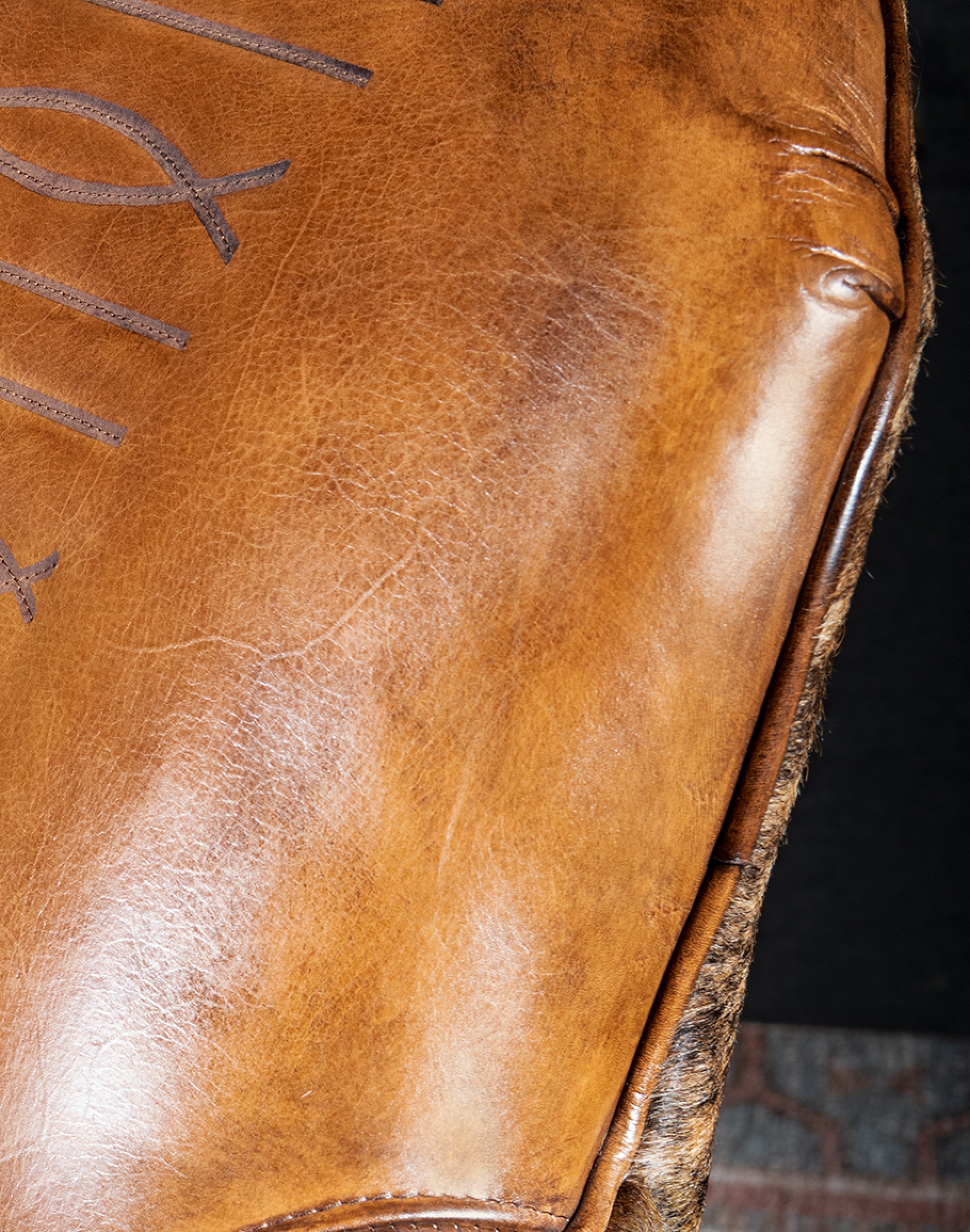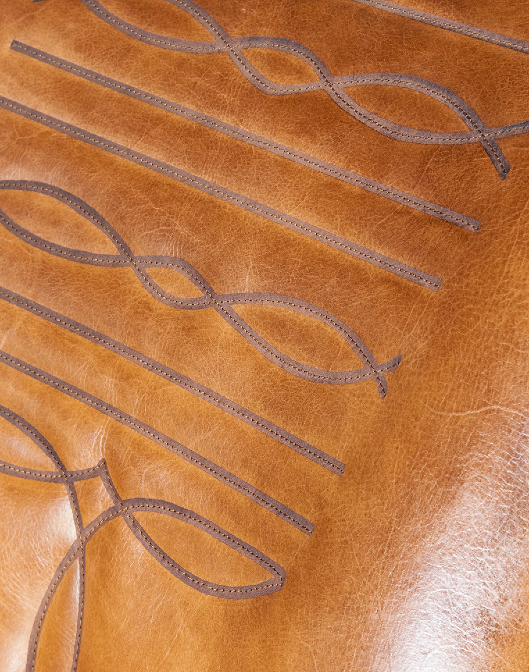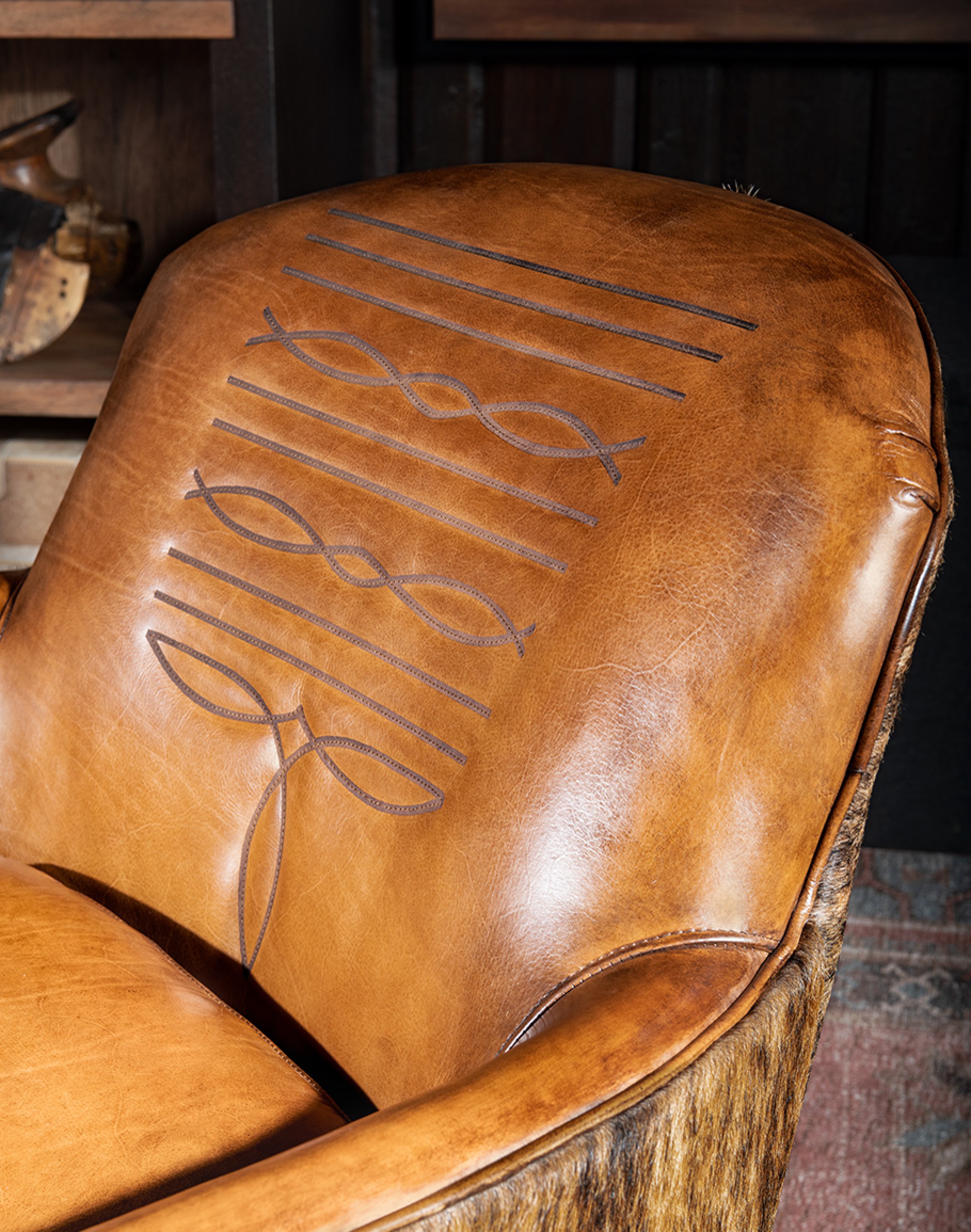 But what truly sets the Macallan Barrel Swivel Chair apart is the attention to detail. Along the outside of the backrest, you'll find an upholstery-grade brindle cowhide that adds a rustic yet refined touch. And on the inside back, a cowboy boot stitched emblem serves as a tribute to its American heritage.