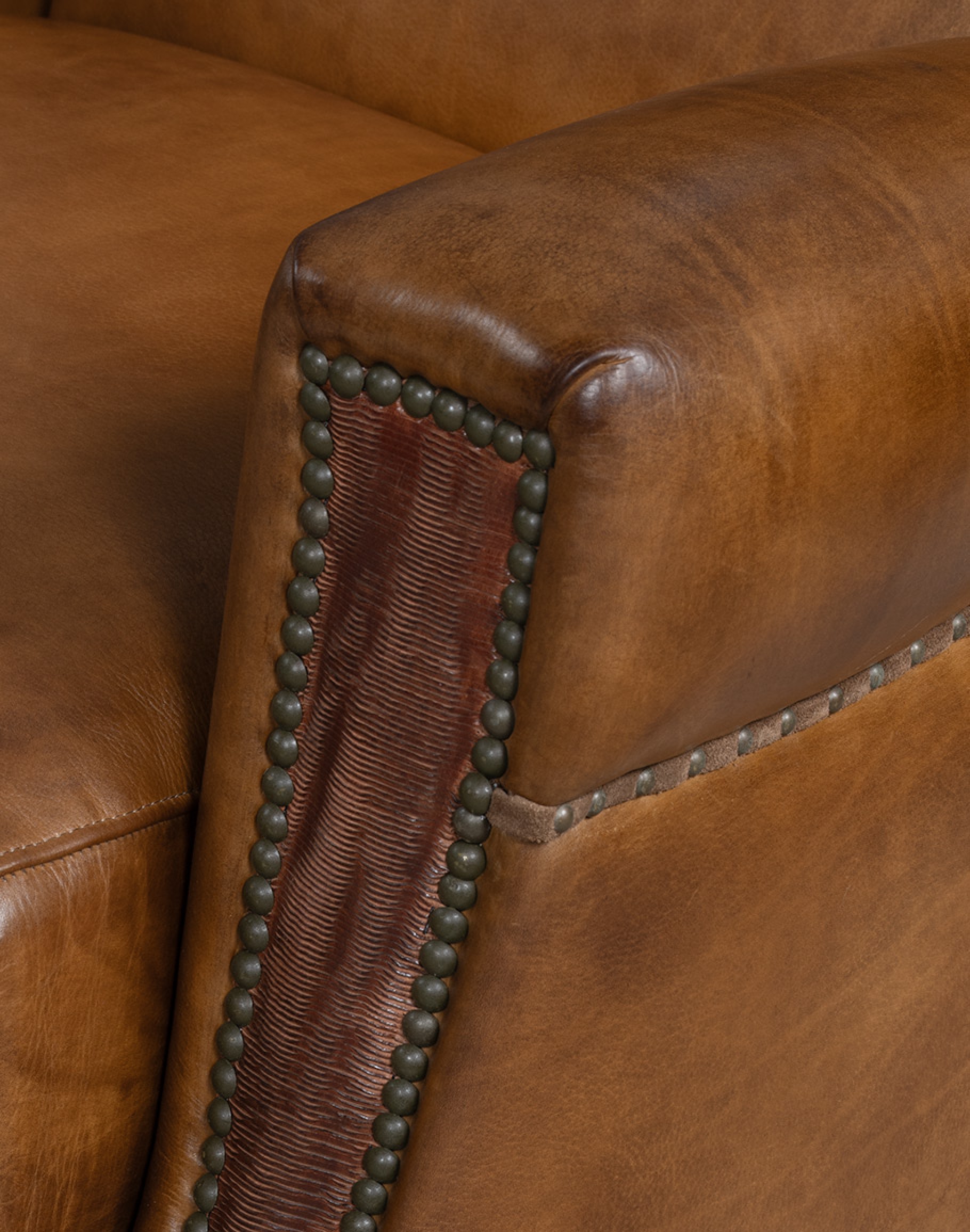 • Contrasting leather arm panels with nailhead trim