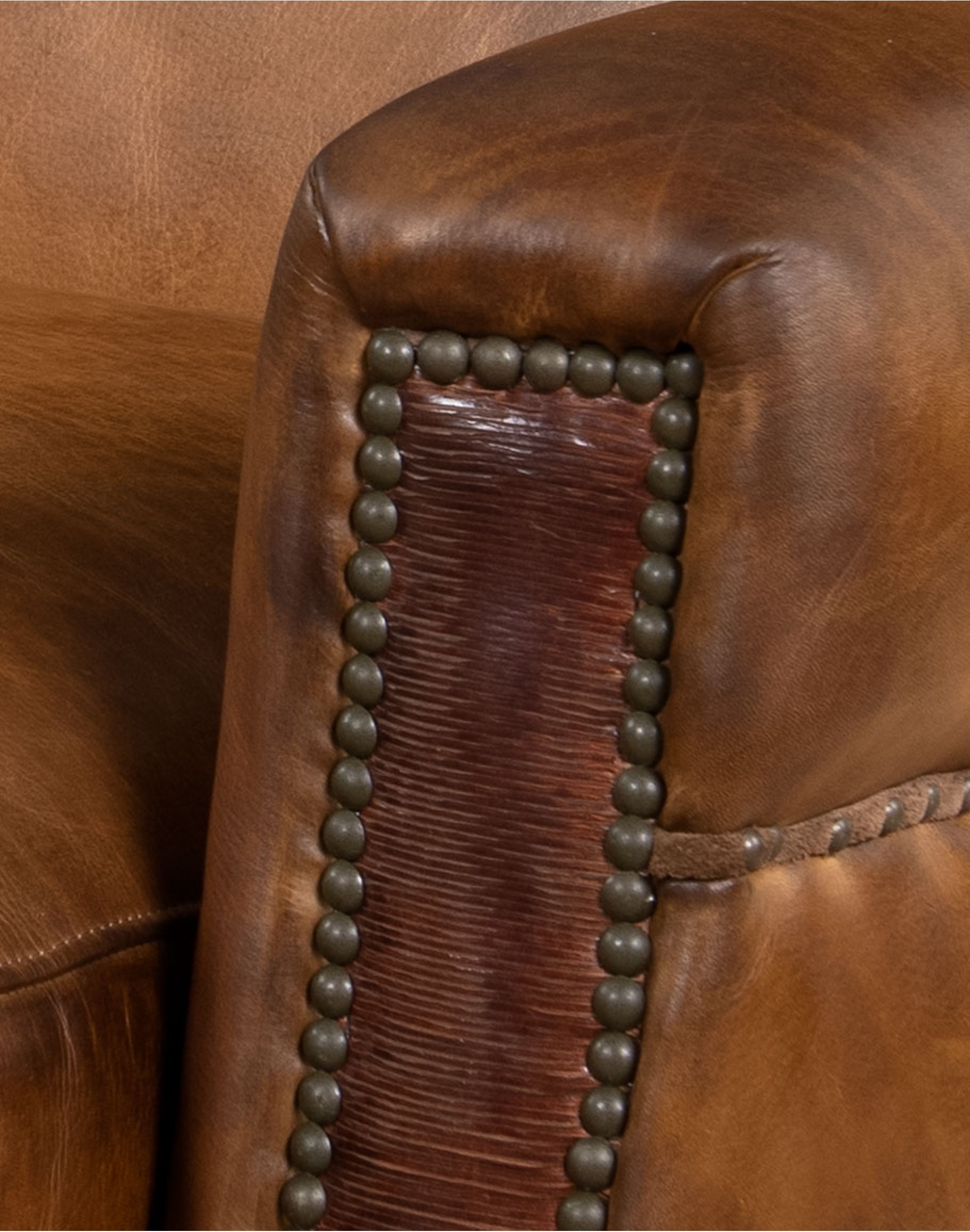 • Contrasting leather arm panels with nailhead trim