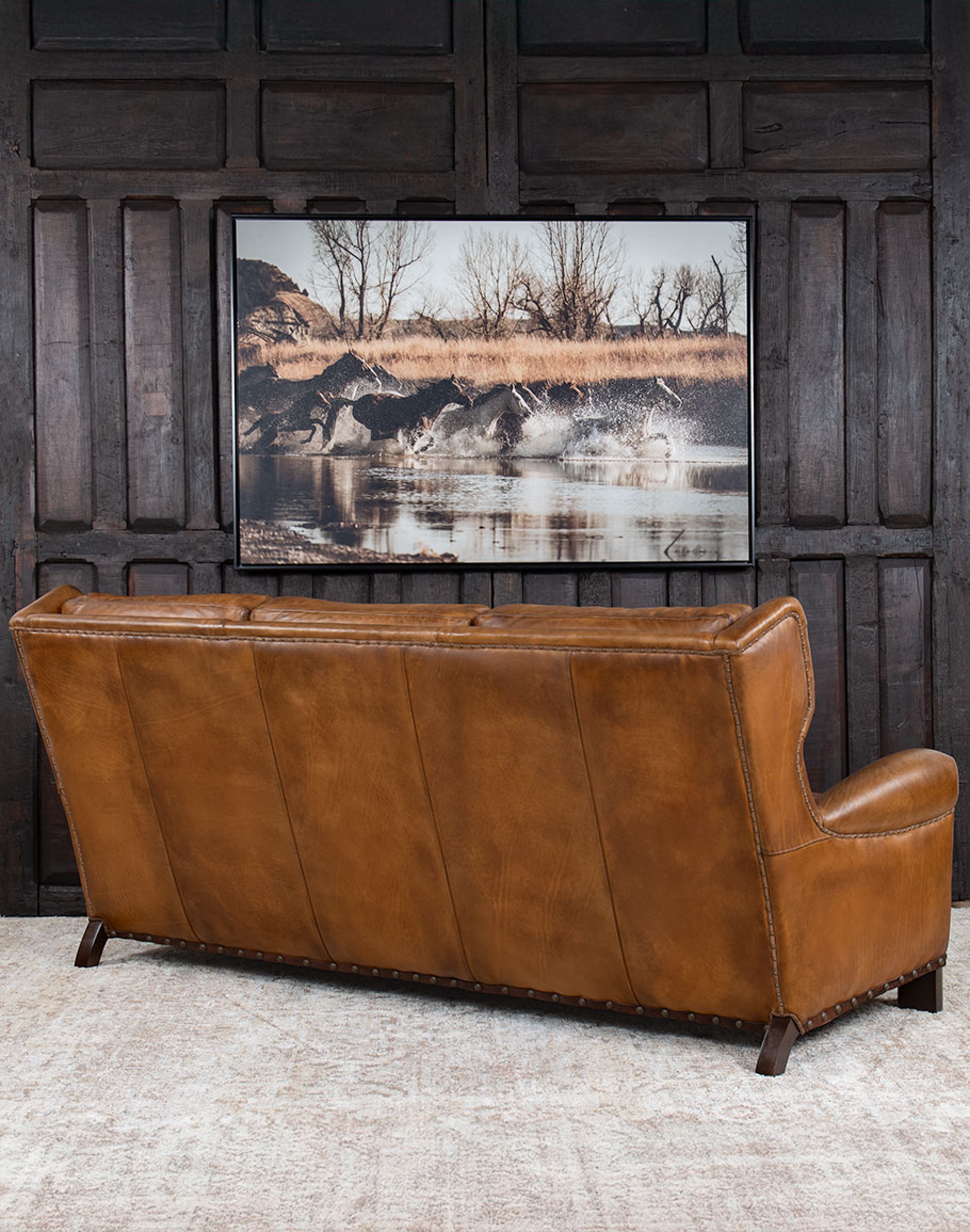 Introducing the Painted Bison Leather Sofa, a bold statement piece that blends American-made craftsmanship with true Western artistry. Meticulously ha..