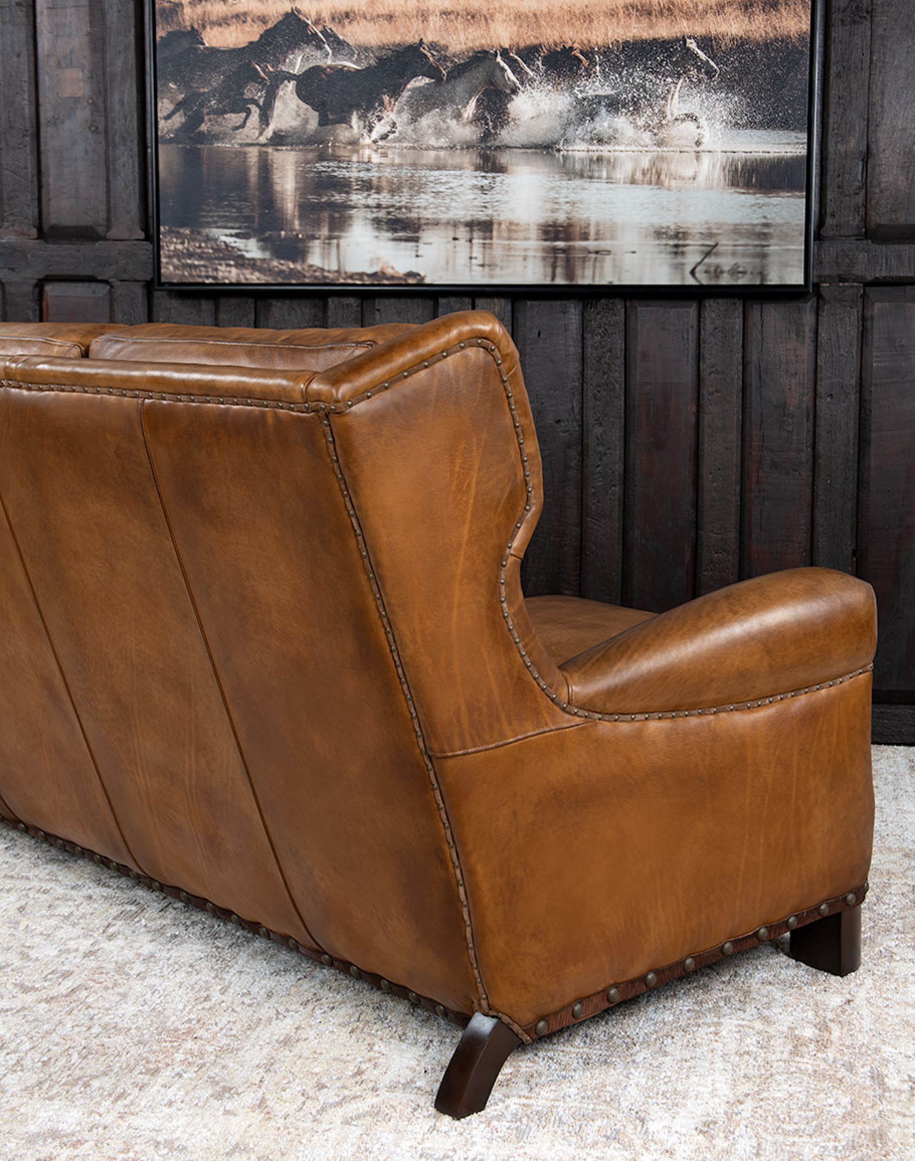 Designer details abound, including contrasting leather accents along the arm panels and a belt leather gimp around the base, finished with antique nailhead trim. The back features a sueded leather gimp panel, also trimmed in decorative nailheads, adding depth and dimension from every angle. Subtle tufting on the back cushions further elevates the Western aesthetic.