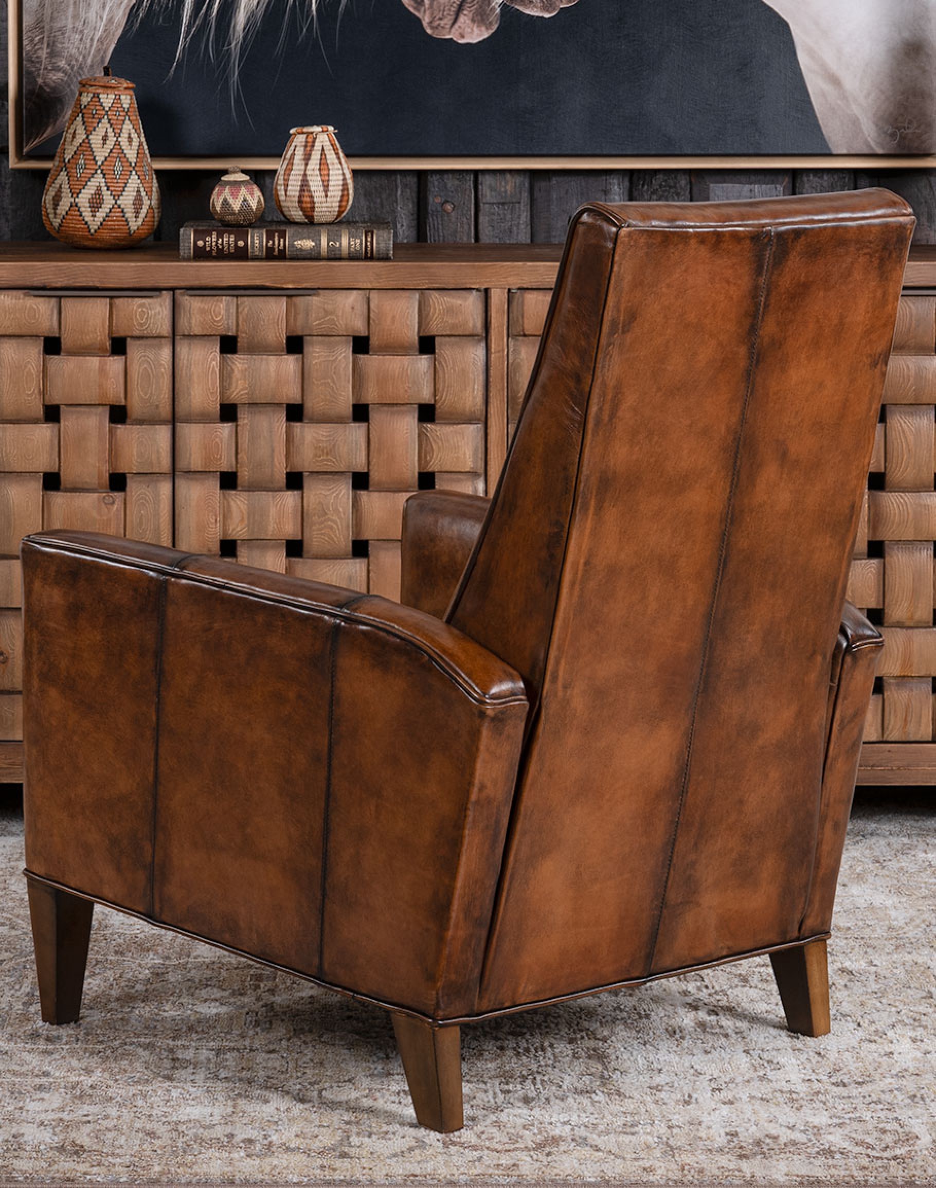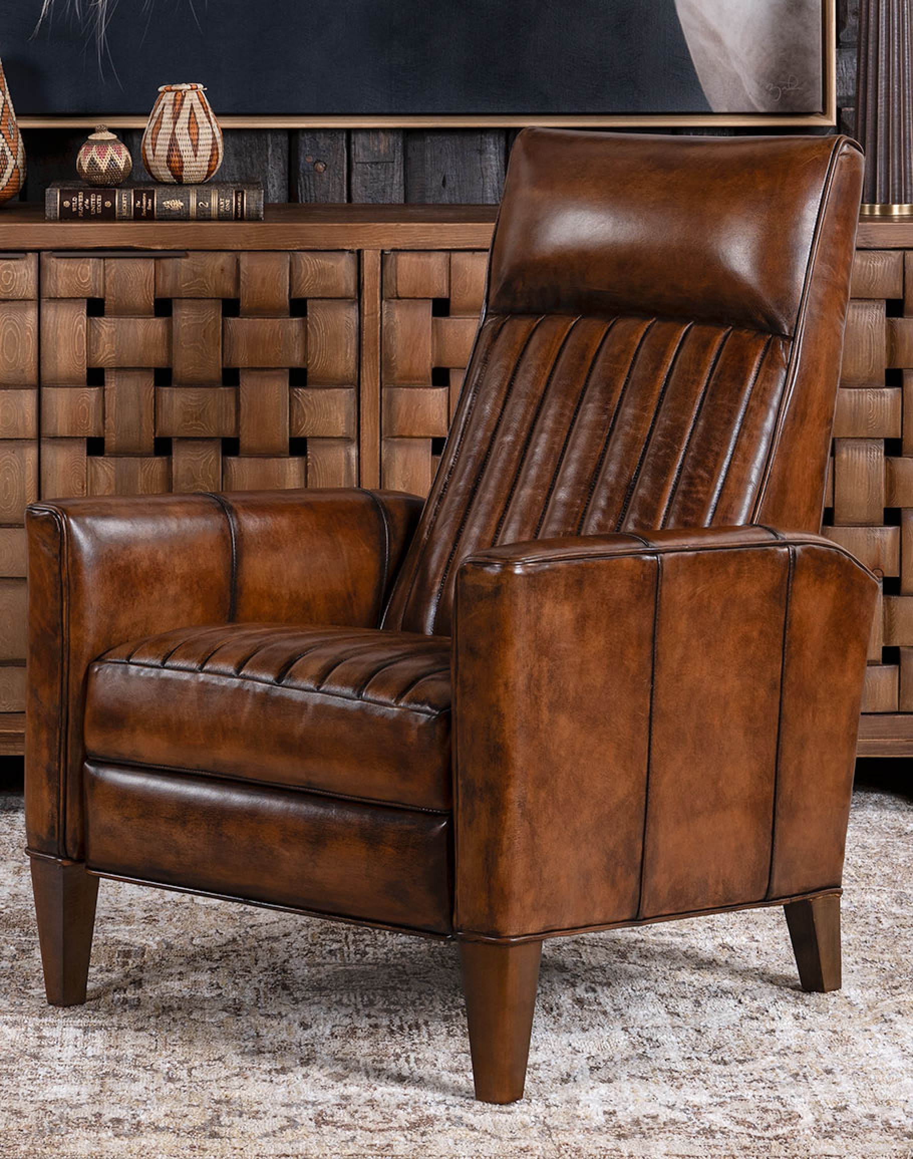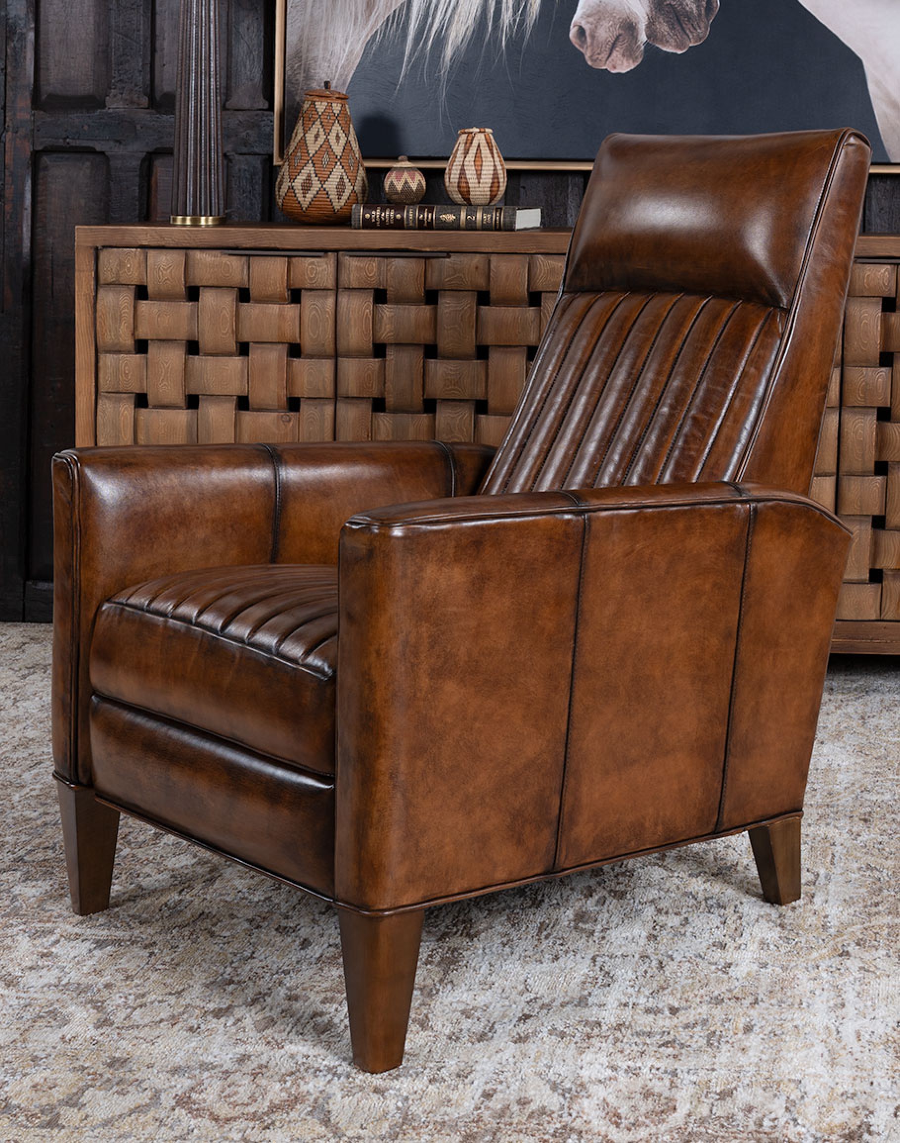 Indulge in luxury and style with our Memphis Leather Recliner, the perfect embodiment of modern rustic design. This chic silhouette blends seamlessly into a classic, refined, desert, or eclectic ranch design. Handcrafted with the highest quality leather and high-density cushioning, this fine leather recliner boasts elegant straight armrests and hand-stitched channels, offering a distinguished and inventive look that will elevate any room. The attention to detail is reflected in the beautifully tapered feet, ensuring that every aspect of this chair exudes quality craftsmanship. This 100% American-made leather recliner pairs beautifully with most high-end furniture, making it a welcomed addition to any upscale modern rustic home decor. Invest in comfort, functionality, and craftsmanship with our Memphis Leather Recliner, a fine leather chair with simplistic elegance. At Adobe Interiors, we create the furniture, and you create the memories.