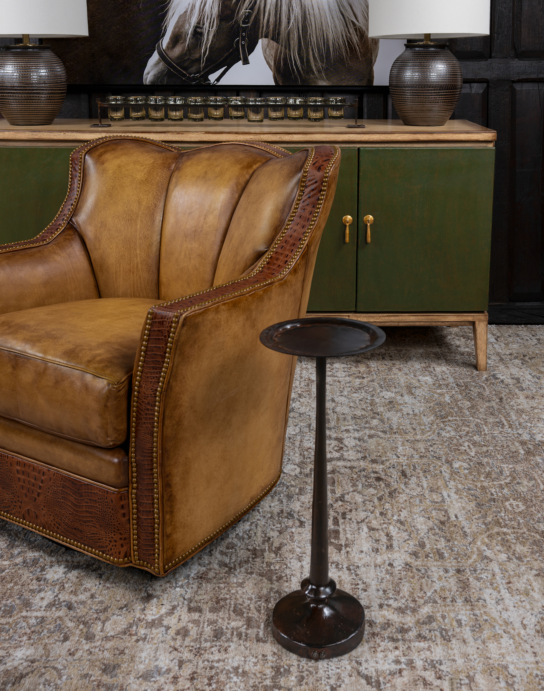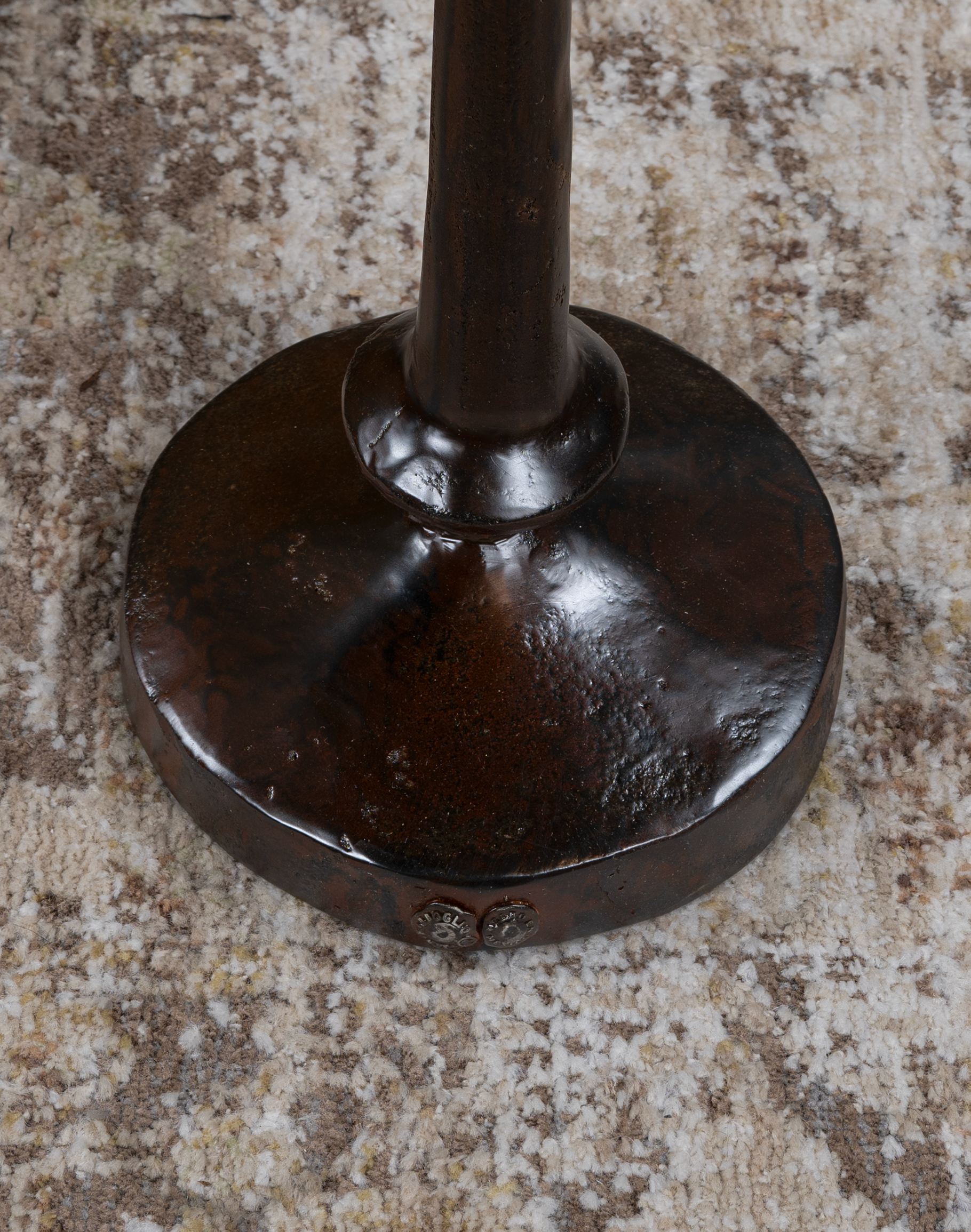 The Mesita Redonda Drink Table is a refined, space-conscious accent designed to deliver elevated functionality without visual weight—an essential piece for luxury Western interiors and curated living spaces. Crafted from solid steel and hand-finished by American artisans, this drink table showcases a rich oil-rubbed bronze patina layered with warm burnished umber and subtle oxidized copper undertones, creating depth, movement, and an authentically aged character.