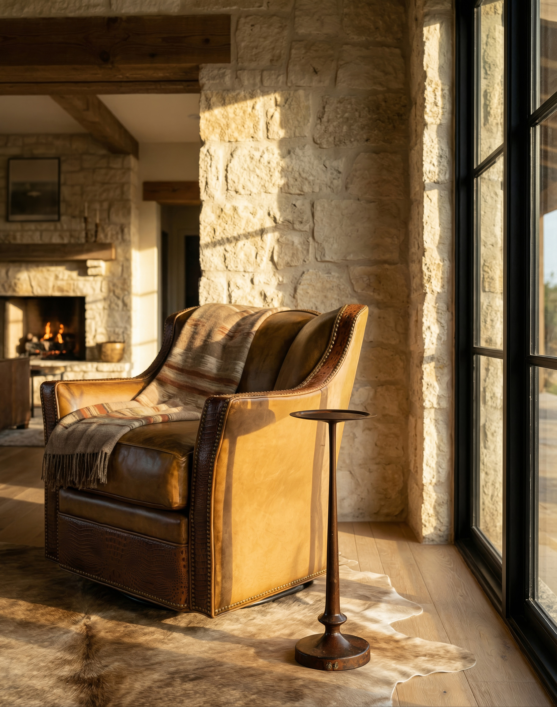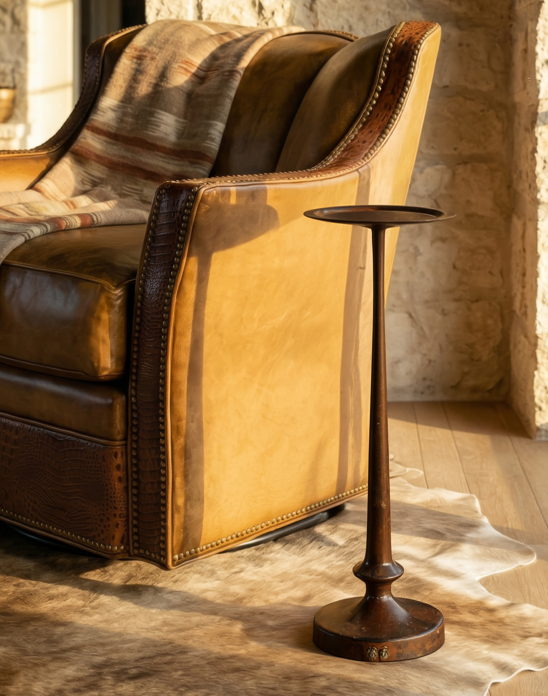 The round tray-style top features a softly raised lip with hand-hammered detailing, offering both visual texture and practical containment for a cocktail, rocks glass, or espresso. The slender pedestal column tapers elegantly into a weighted base, providing stability while maintaining a clean, architectural silhouette. The finish variation and artisanal distressing ensure no two pieces are exactly alike—each table carries its own unique expression of craftsmanship. At Adobe Interiors, we create the furniture, and you create the memories.