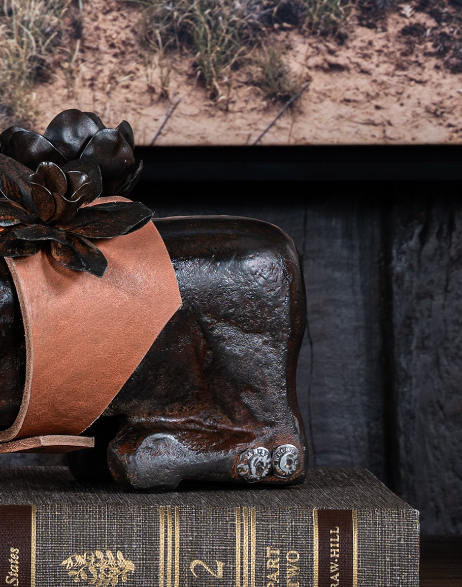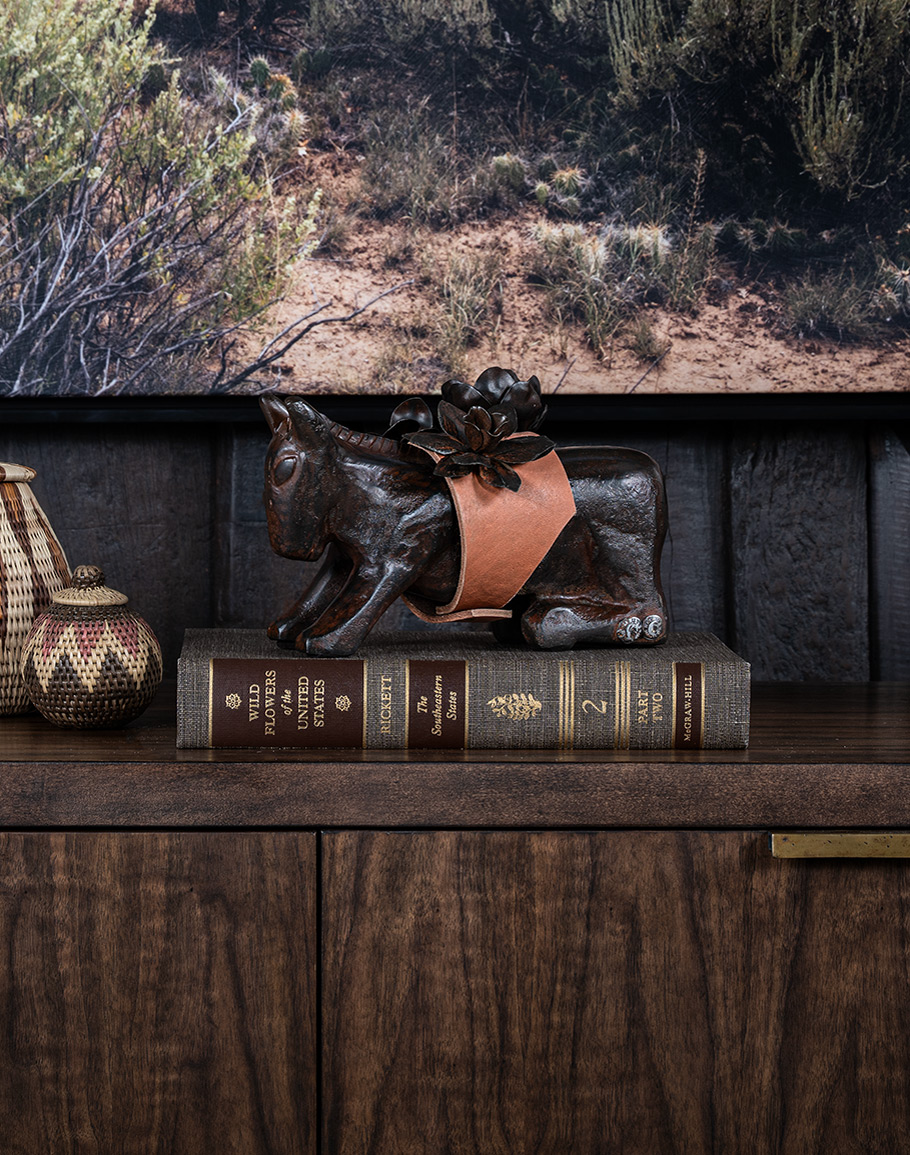 Wrapped around the body is a thick cognac leather saddle with raw-edged trim and snap closure, finished like well-loved tack. At the top, a cluster of iron flowers—layered petals with darkened edges and warm undertones—sits like a bouquet, turning the saddle into a small, functional work of art. Look closely and you’ll spot tiny stamped-like accents at the rear hooves that add an extra note of craftsmanship. Perfect for styling with books, pottery, or collected objects, this mini burro adds character, texture, and a distinctly artisan feel wherever it lands.