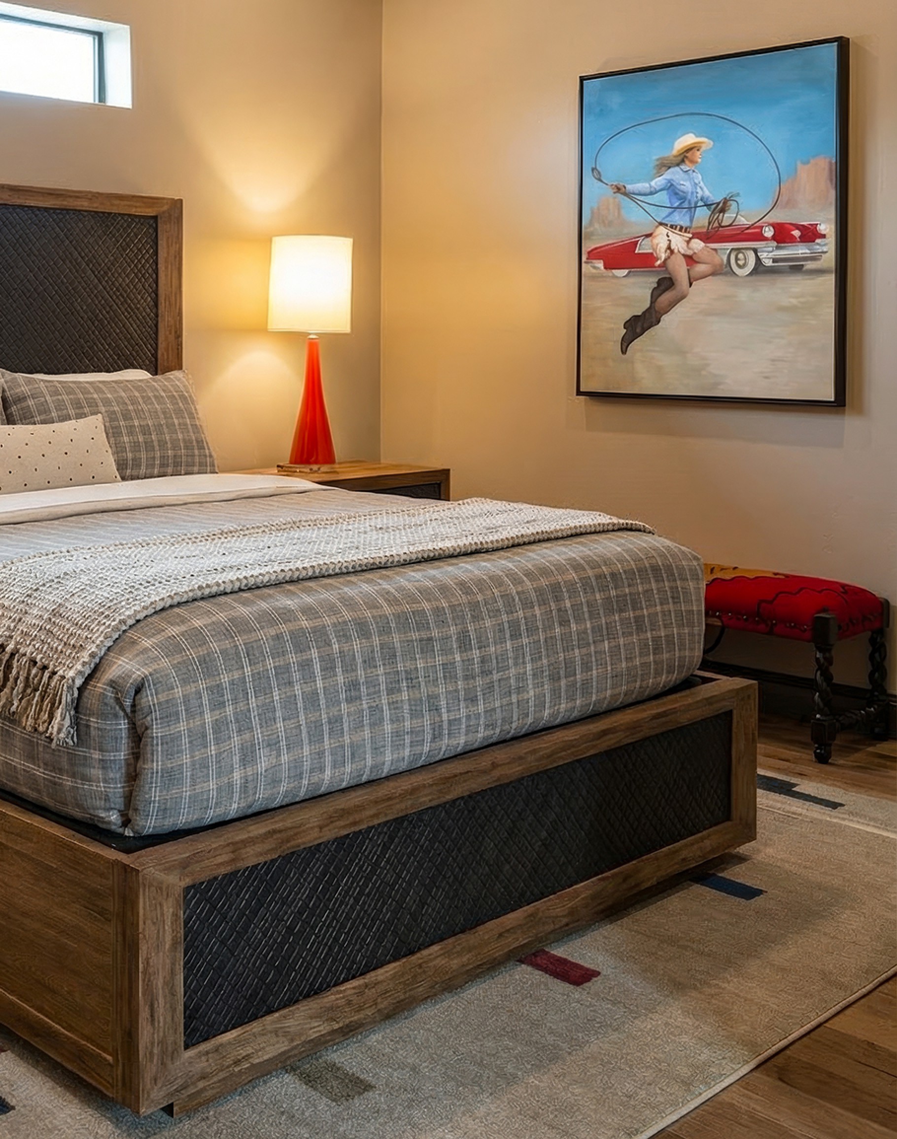 The clean sky, warm desert neutrals, and punch of cherry red create a striking focal point that looks incredible in western homes, modern ranch décor, eclectic living rooms, offices, boutiques, and bar areas. It’s a perfect statement for anyone who loves the Southwest, rodeo culture, or a modern twist on traditional Western art.