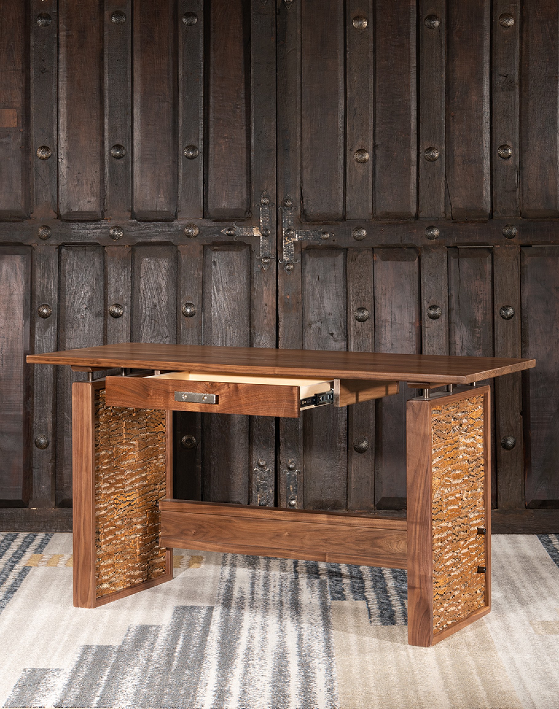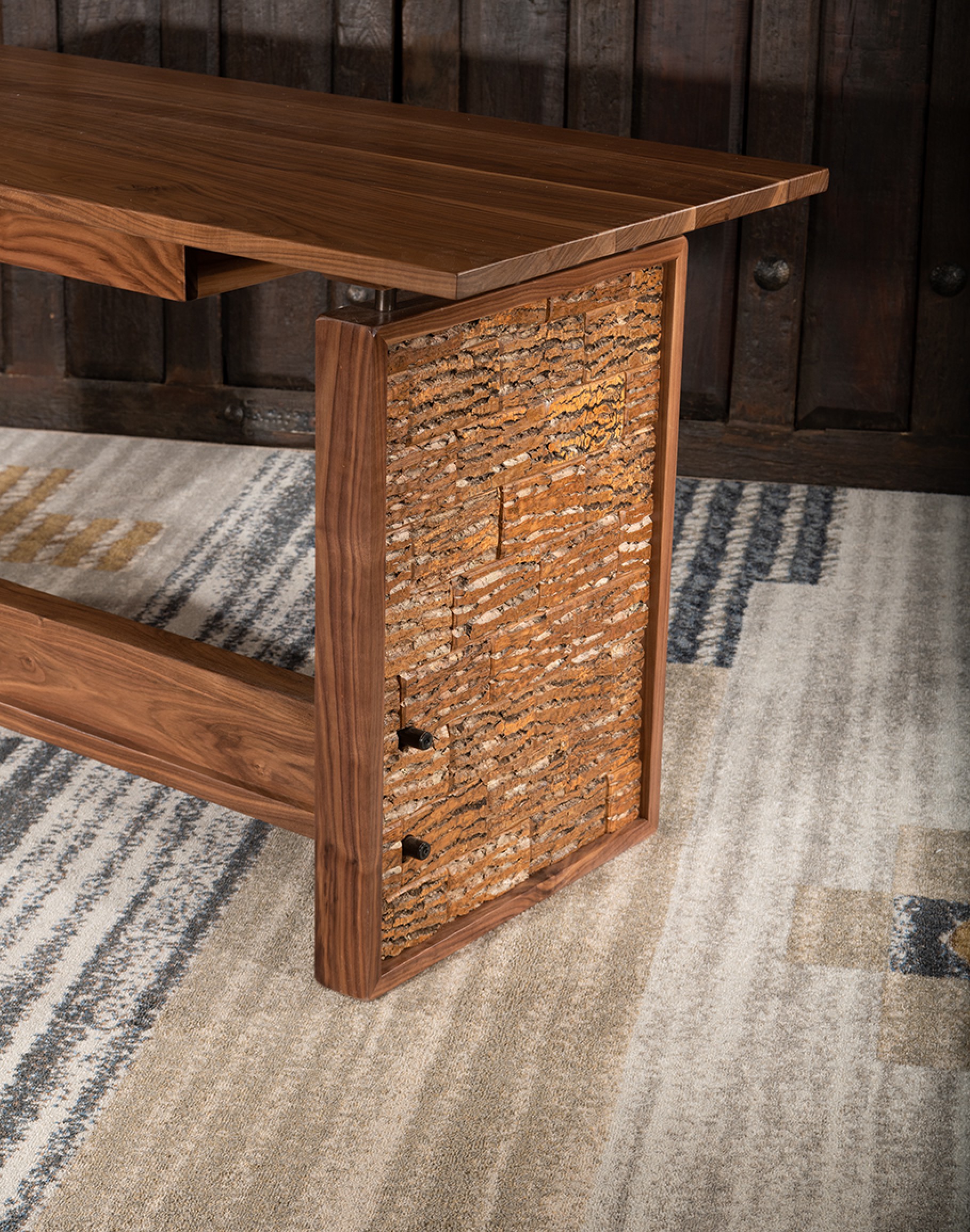 Using Poplar Bark as a textile, fashioning it into tiles and applying them horizontally gives the Modern Rustic Writers Desk a unique design! The top is a free form American Black Walnut Slab. The industrial styled "I" beam stretcher, and the trim around the Poplar Bark are also Black Walnut.