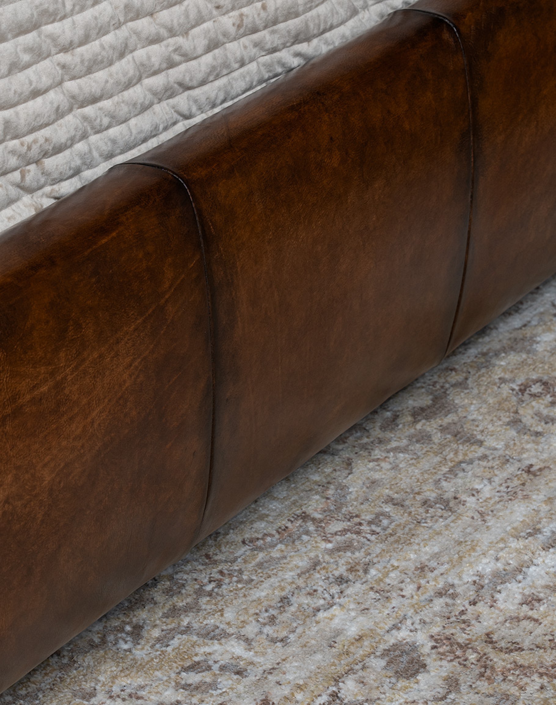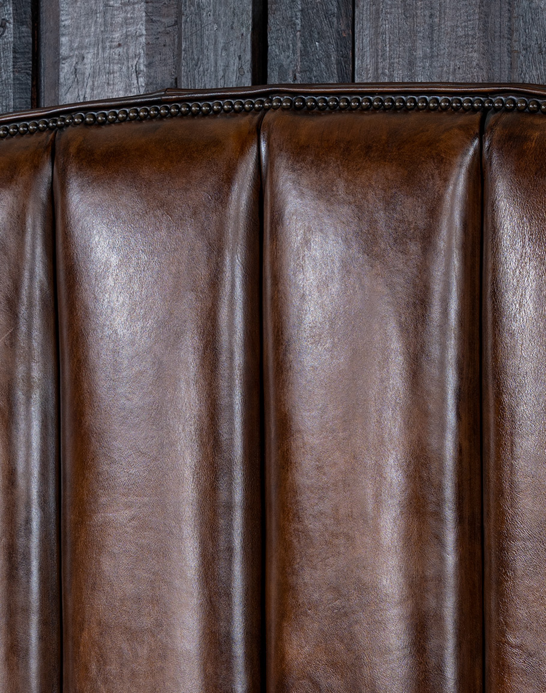 The Monarch Leather Bed embodies the pinnacle of American-made quality, merging luxurious materials with refined design. Handcrafted to the highest standards, this statement piece features a tall, gently arched headboard with vertical channel tufting, creating a bold yet sophisticated profile. Wrapped in full-grain leather in a rich saddle chestnut hue with deep hand-burnished accents, the Monarch exudes warmth and depth of tone that only improves with age.